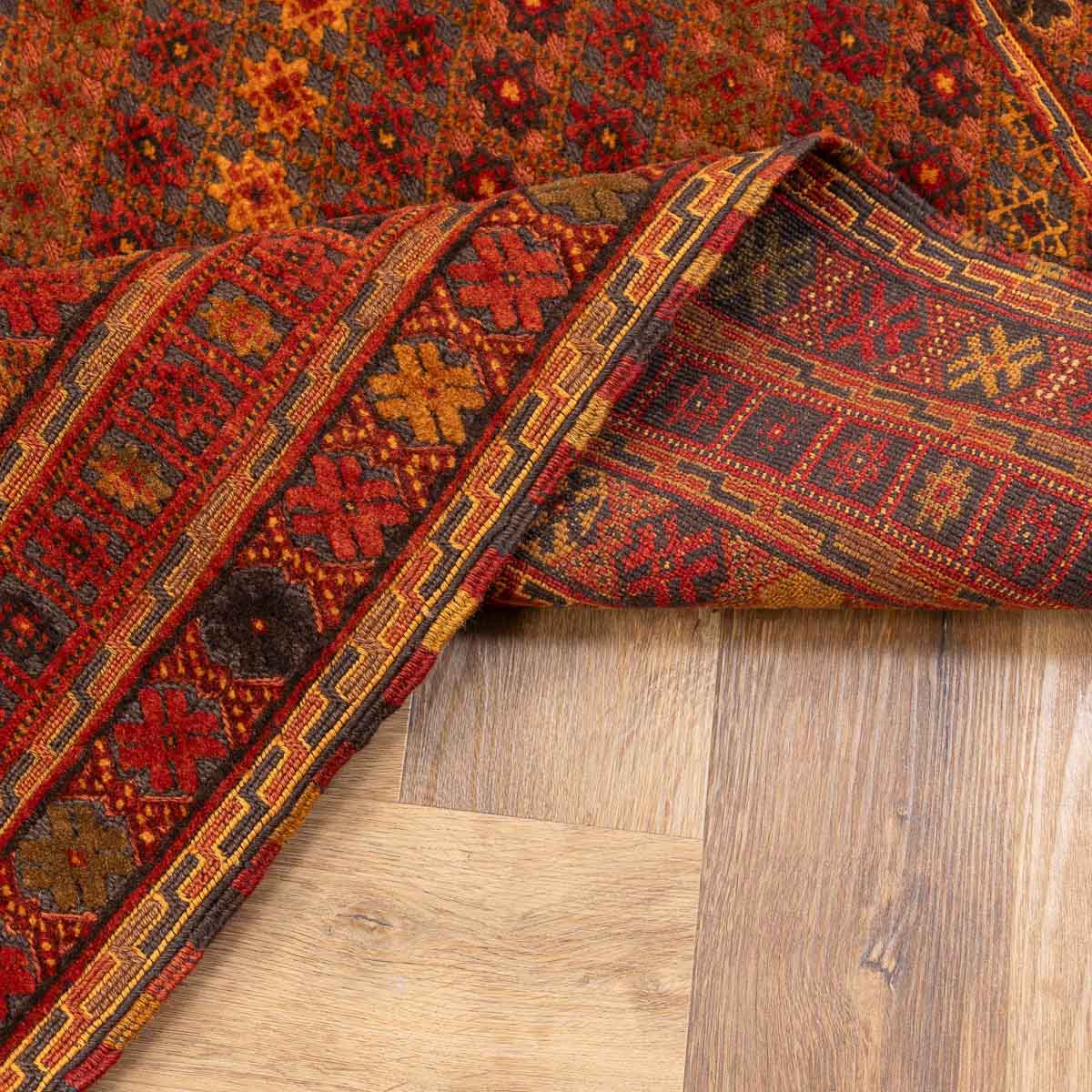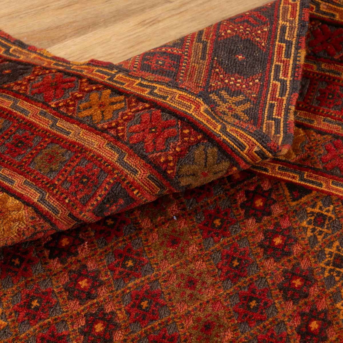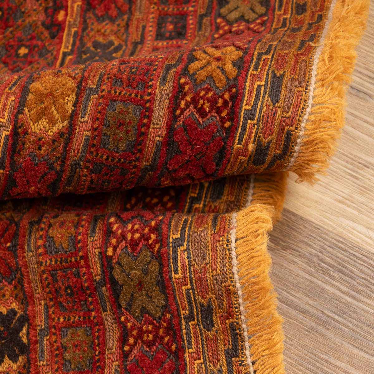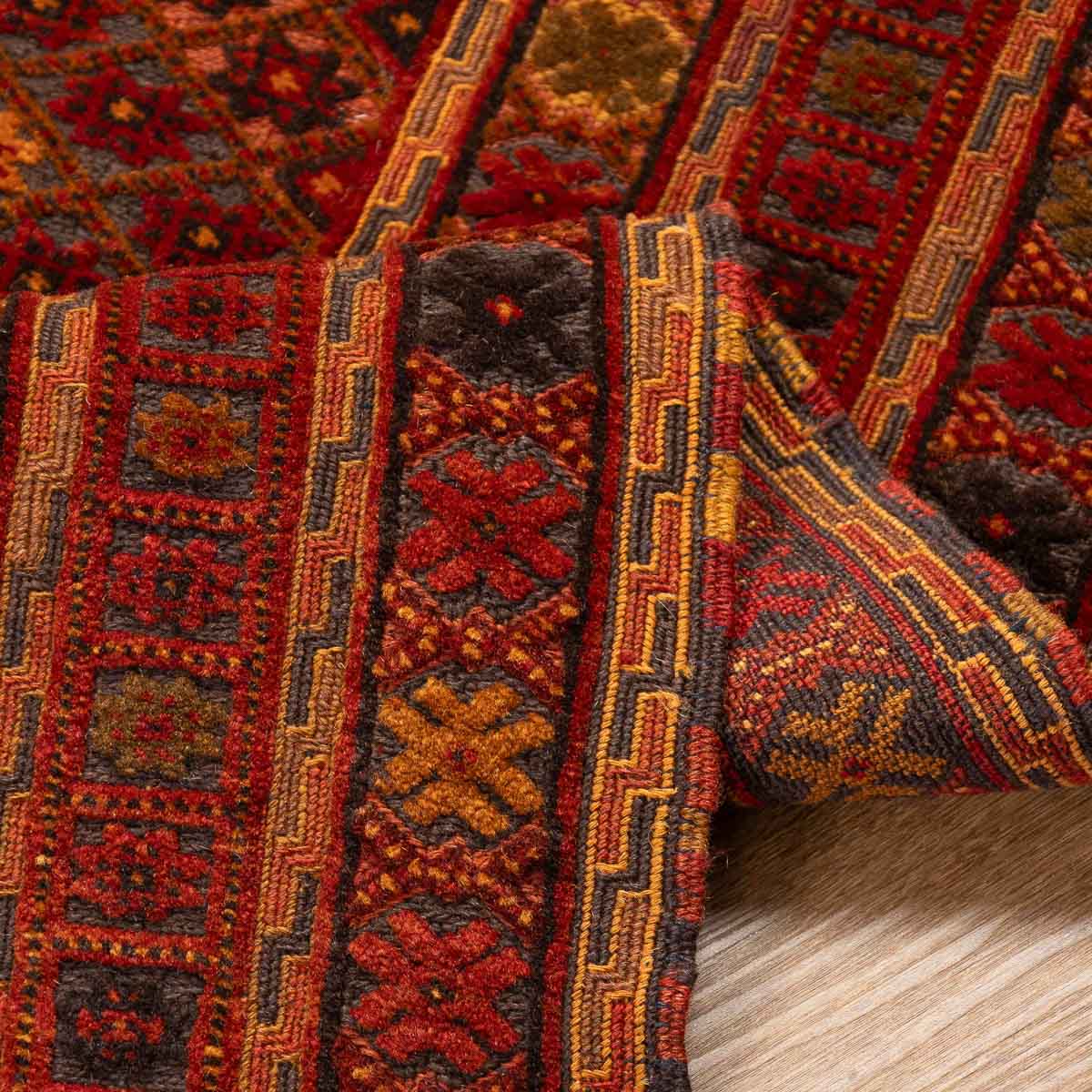 שטיח אוזבקי ייחודי בעבודת יד בגווני אדום עמוק, וכחול – משלב עיצוב גיאומטרי מסורתי עם נוכחות עוצמתית ואלגנטית בחלל. דוגמת היהלומים הקלאסית מעניקה תחושת תנועה ועומק, והופכת אותו לבחירה מושלמת לחללים המעוצבים בקו אתני או אקלקטי.