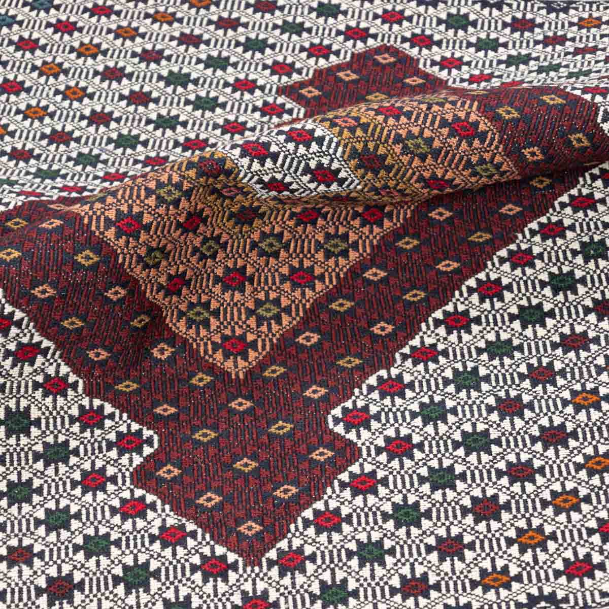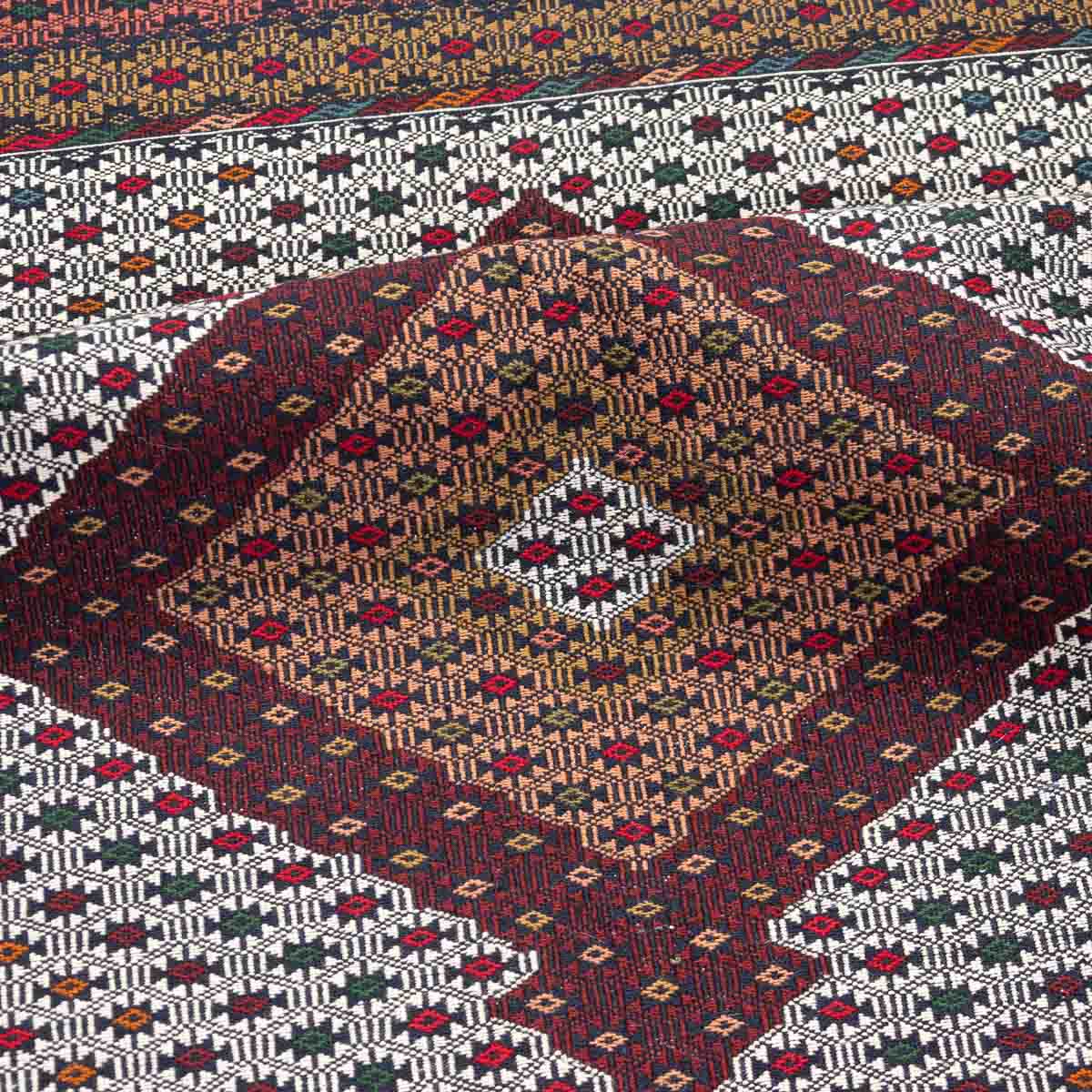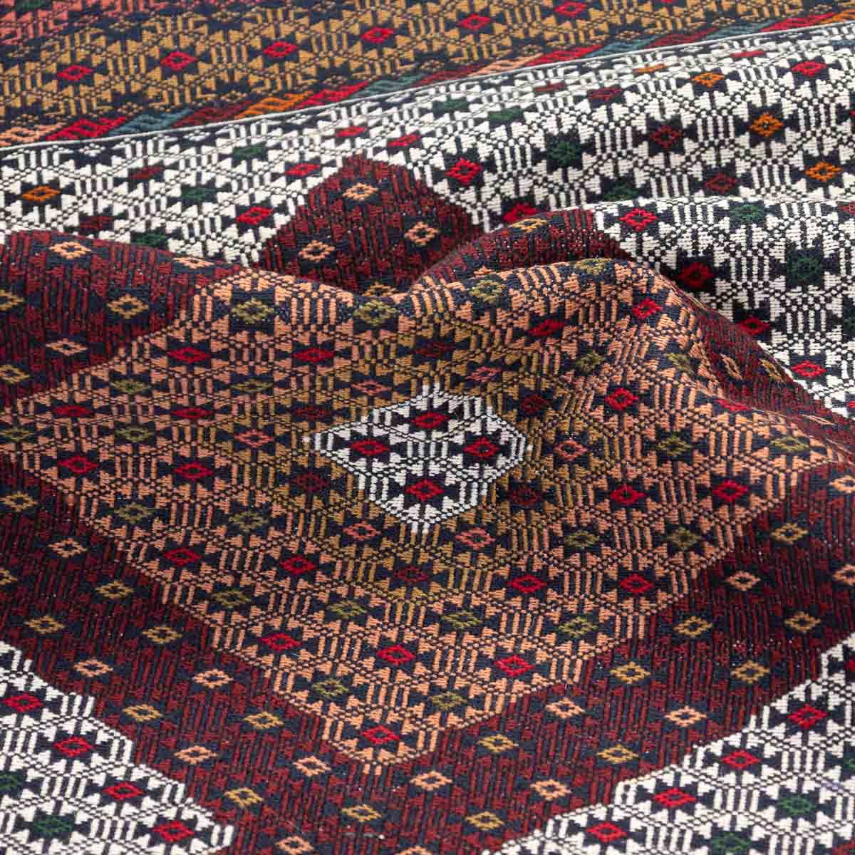 שטיח סומק פרסי אותנטי בעבודת יד, עם דוגמה גיאומטרית מורכבת ומרכז יהלום שמעניק לשטיח עומק ואופי מסורתי. הצבעוניות העשירה משלבת גווני בורדו, שמנת, כחול, ירקרק ונגיעות צבע קטנות שמוסיפות חיים ודיוק למארג האריגה. התוצאה היא שטיח שמספר סיפור של תרבות, מלאכת יד וסטייל פרסי עתיק.