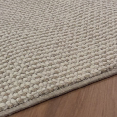 השטיח שזור באריגה גושנית צפופה של לולאות בגווני בז' וקרם. השילוב בין הגוונים הבהירים יוצר מראה רך ואחיד, שמתאים לכל סגנון עיצוב. המרקם המחוספס בעדינות מעניק תחושת עומק ומגע נעים מתחת לרגליים.