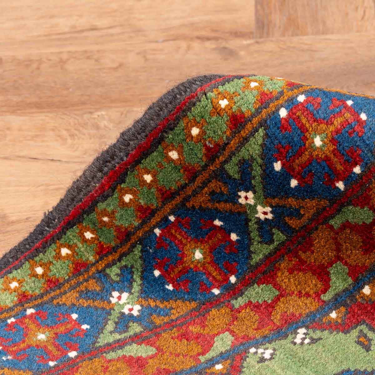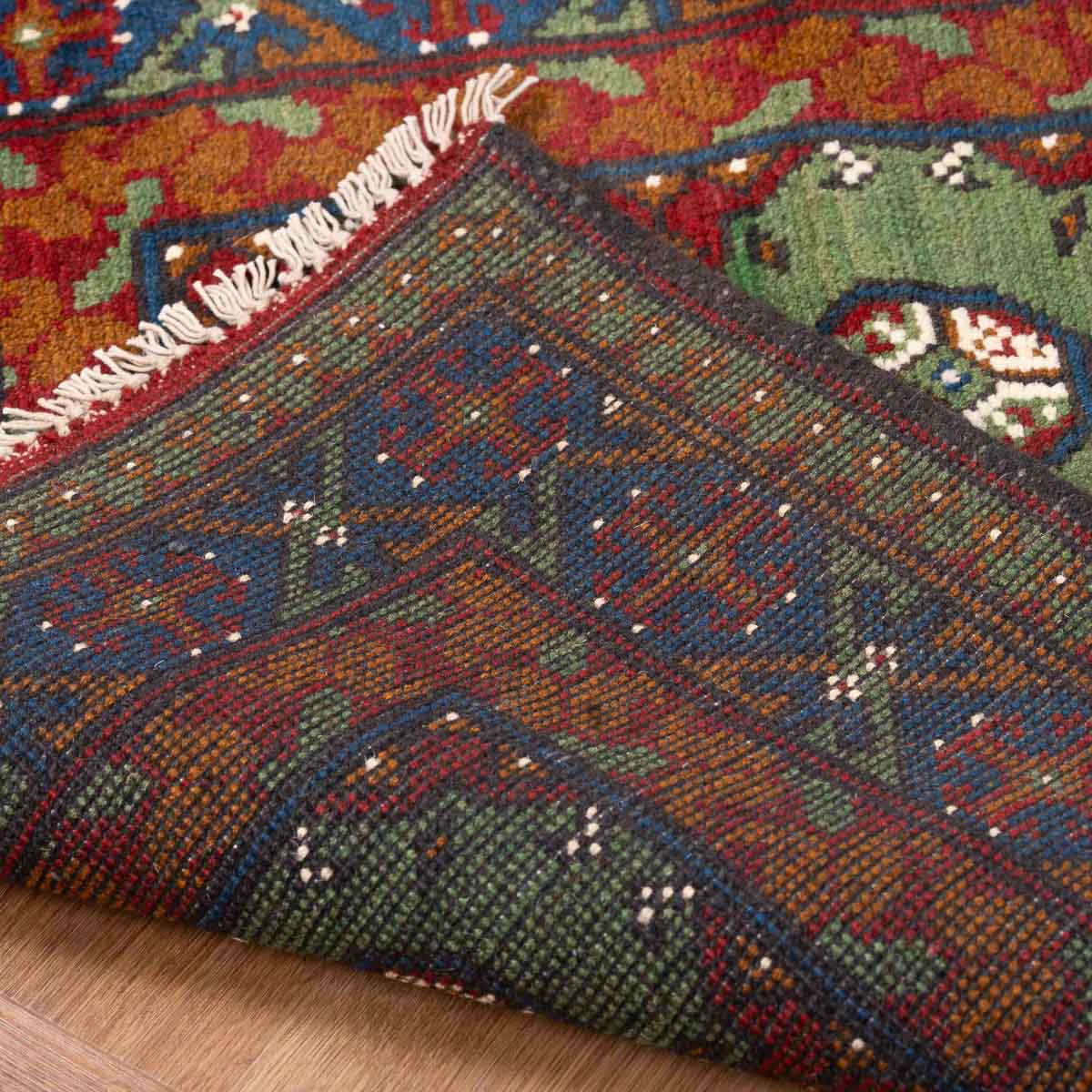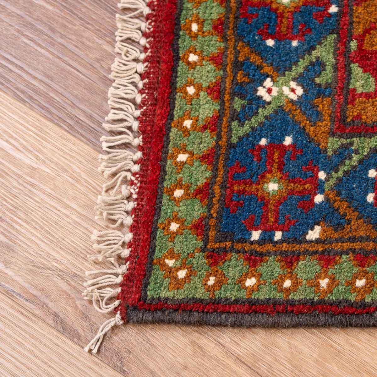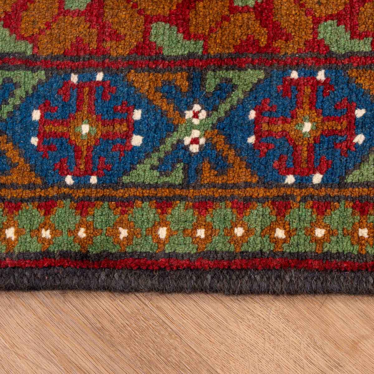 שטיח בוכרה אפגני בעבודת יד, דגם קלאסי בירוק עז בשילוב אדום וכחול עמוק. דגם זה מתאפיין בסימטריה מרשימה ובדוגמת מדליון החוזרת לאורך השטיח, המעניקה לו מראה עשיר ואלגנטי. השטיח מוסיף חמימות ותחושת יוקרה לכל חלל שבו הוא מונח.