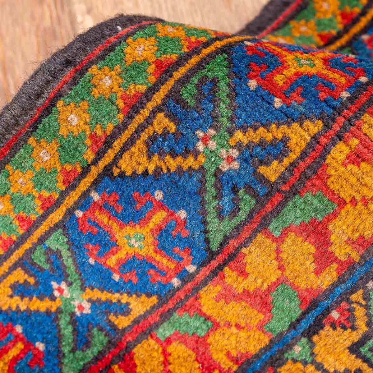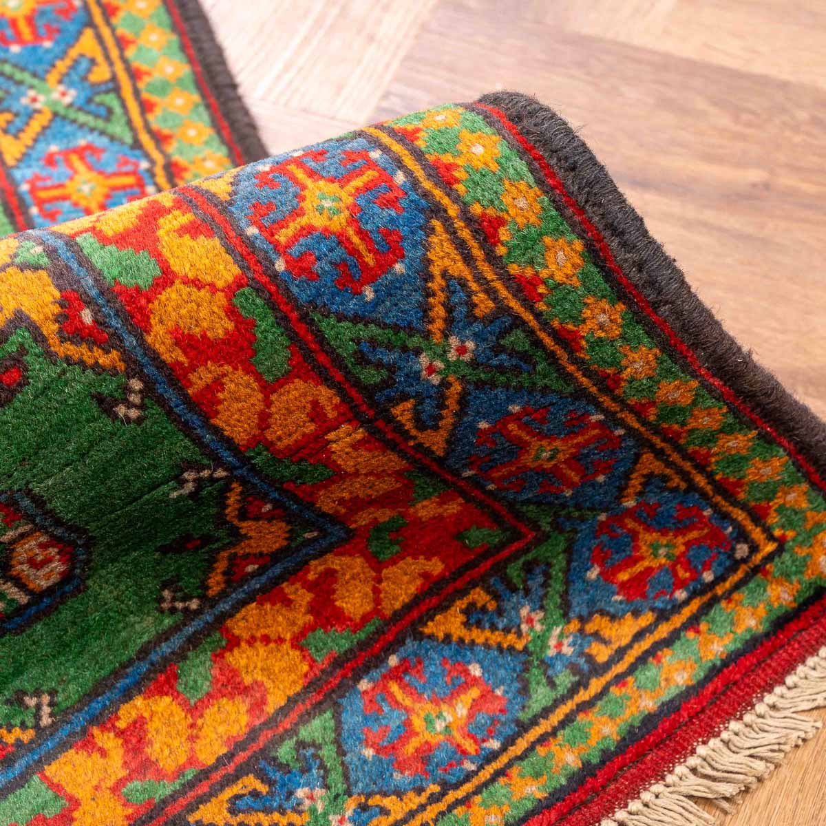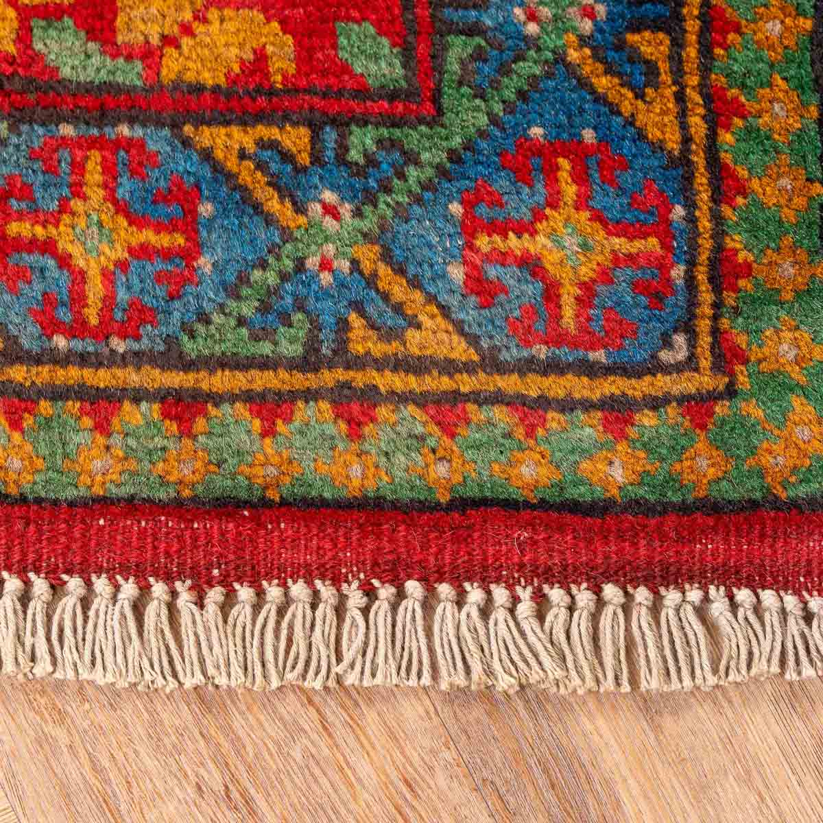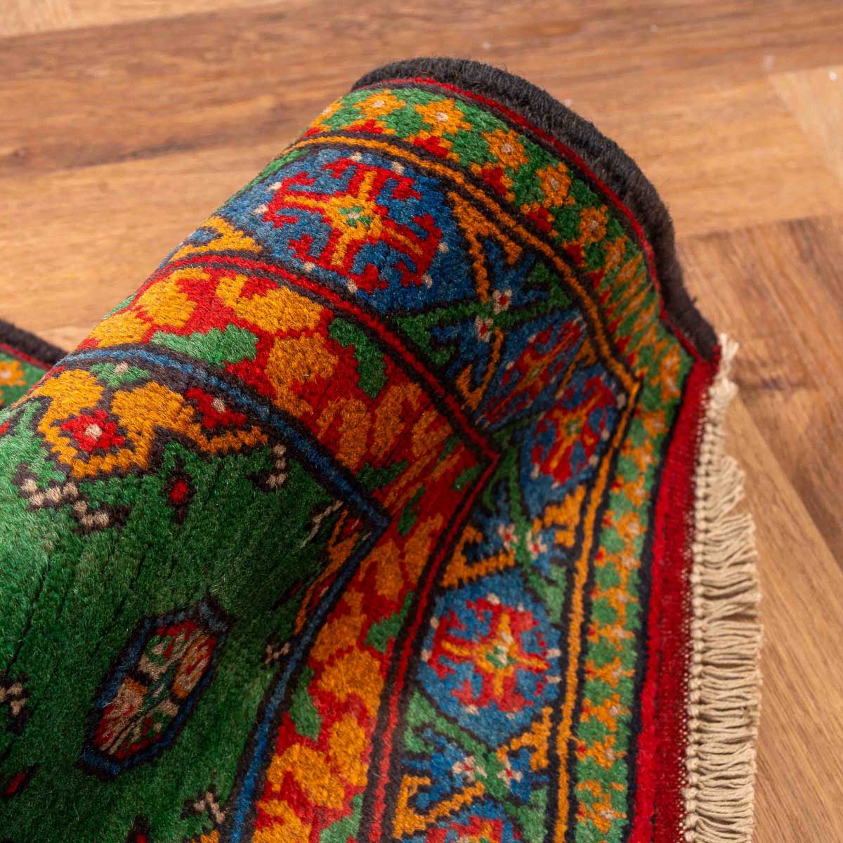 שטיח בוכרה אפגני בעבודת יד, דגם קלאסי בירוק עז בשילוב אדום וכחול עמוק. דגם זה מתאפיין בסימטריה מרשימה ובדוגמת מדליון החוזרת לאורך השטיח, המעניקה לו מראה עשיר ואלגנטי. השטיח מוסיף חמימות ותחושת יוקרה לכל חלל שבו הוא מונח.