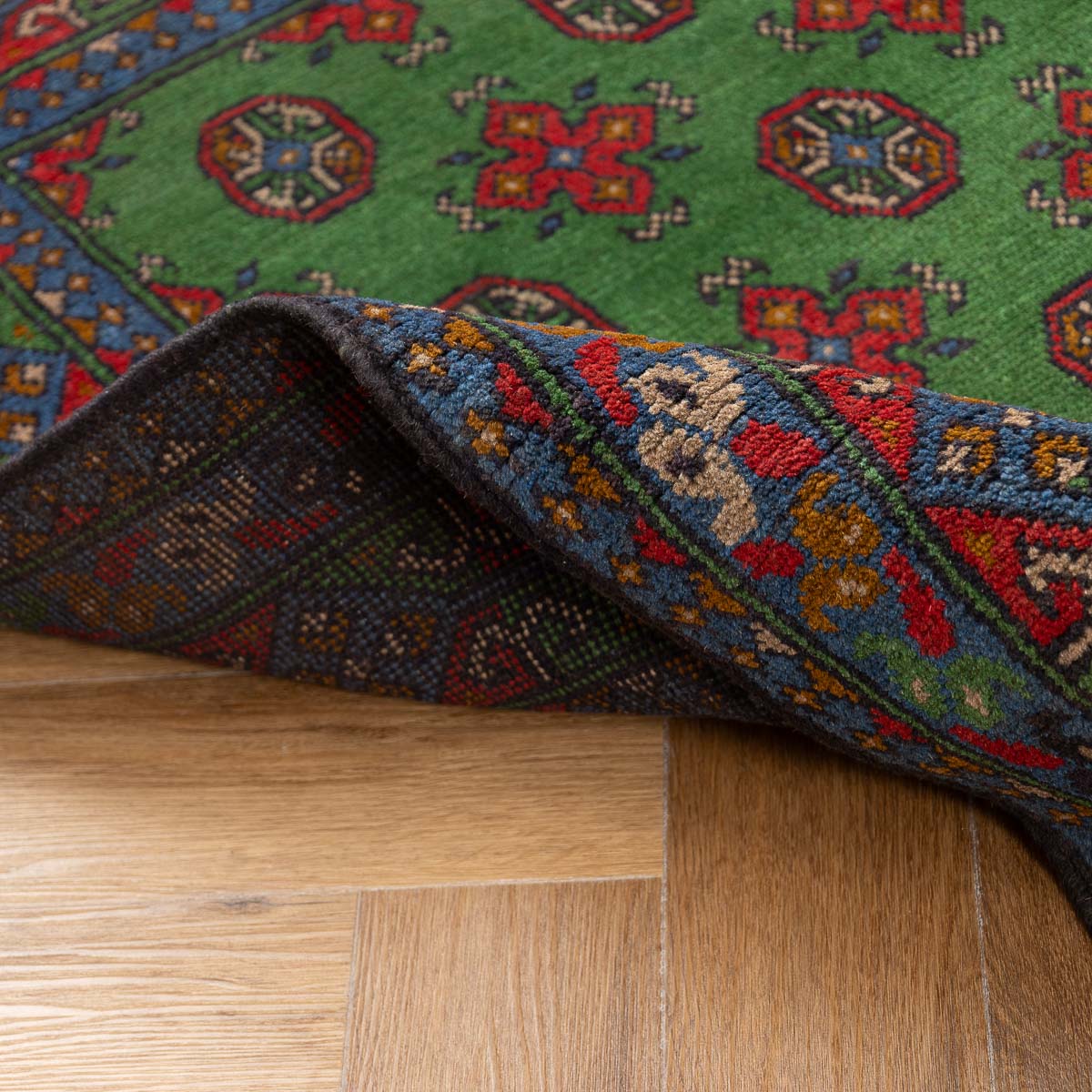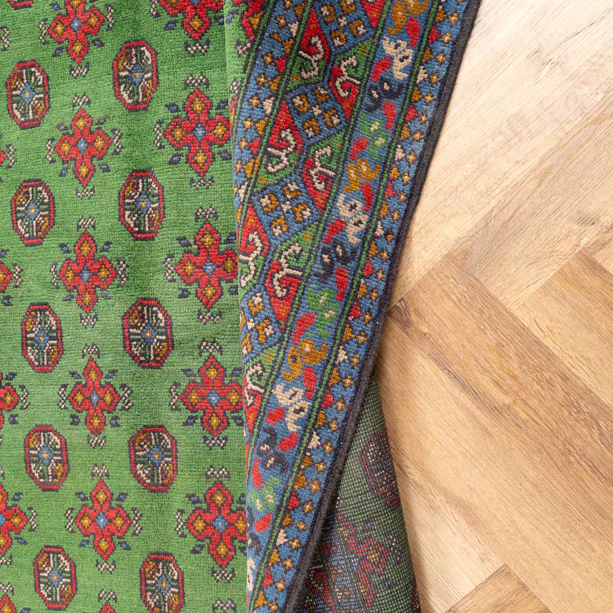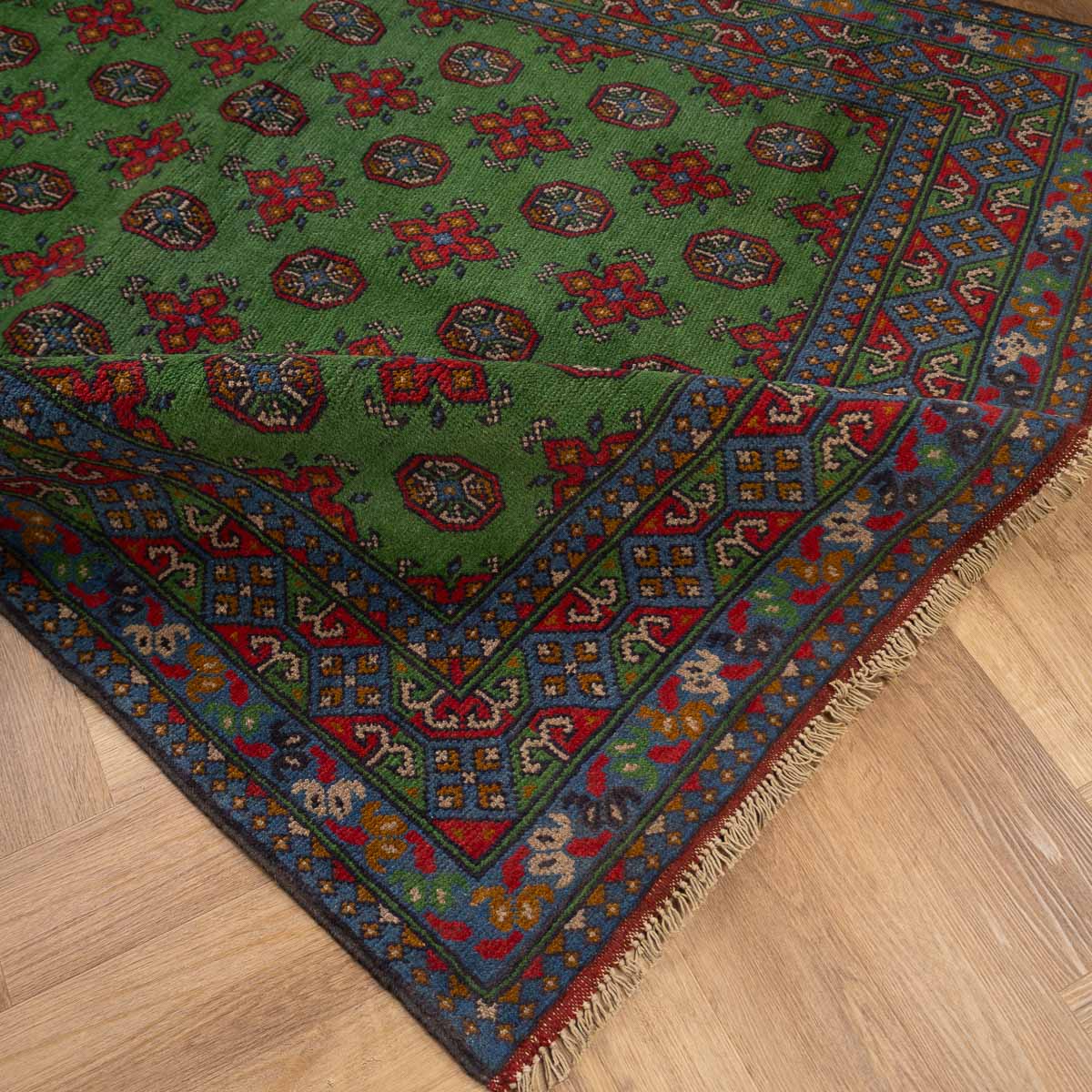 שטיח בוכרה אפגני בעבודת יד בגוון ירוק עמוק ומלא חיים. שילוב מרשים של מסורת עתיקה עם צבע נוכח וייחודי, שמכניס אופי, עומק ויוקרה לכל חלל.