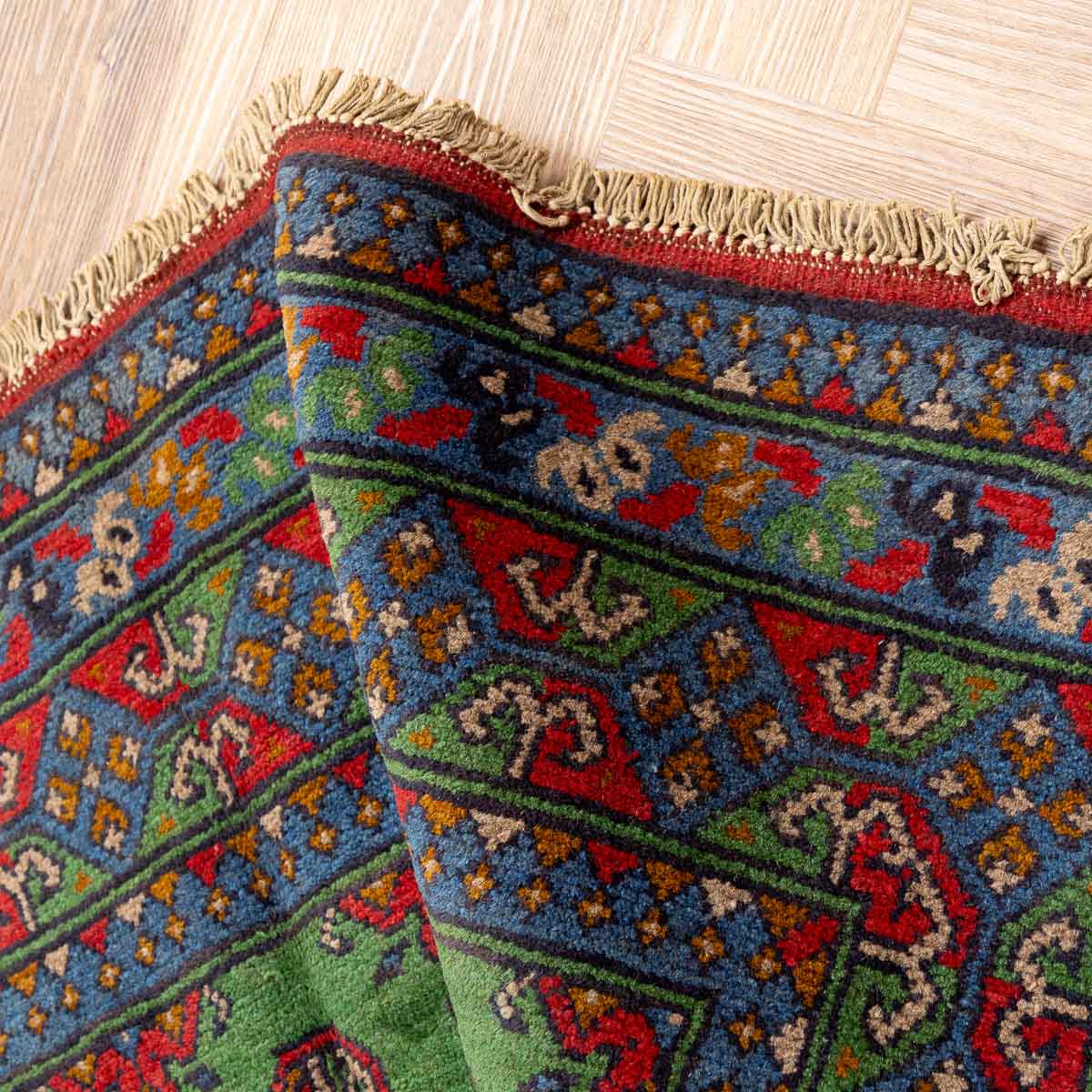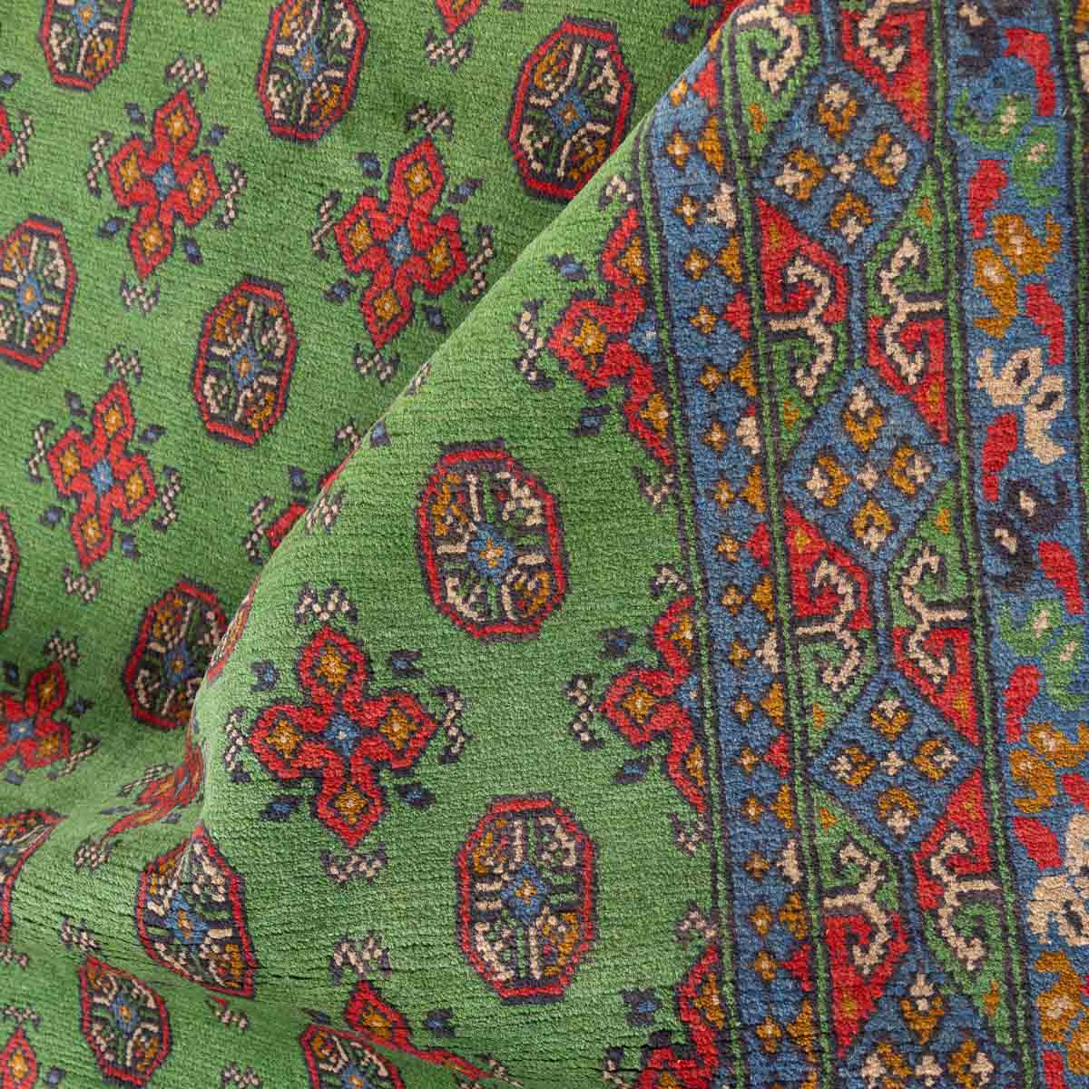 דוגמת בוכרה מסורתית הבנויה ממדליונים סימטריים החוזרים על עצמם בדיוק מופתי. שדה ירוק עשיר משולב באדומים, כחולים ונגיעות זהב וקרם, ויוצר מראה עשיר אך מאוזן. המסגרת הרב שכבתית מדגישה את מרכז השטיח ומעניקה תחושת עומק וסדר.