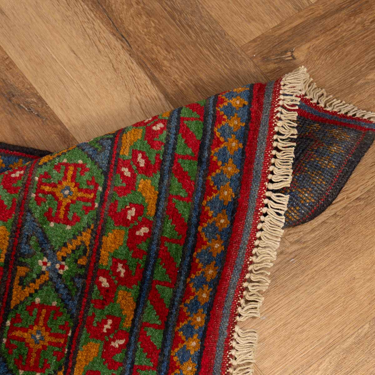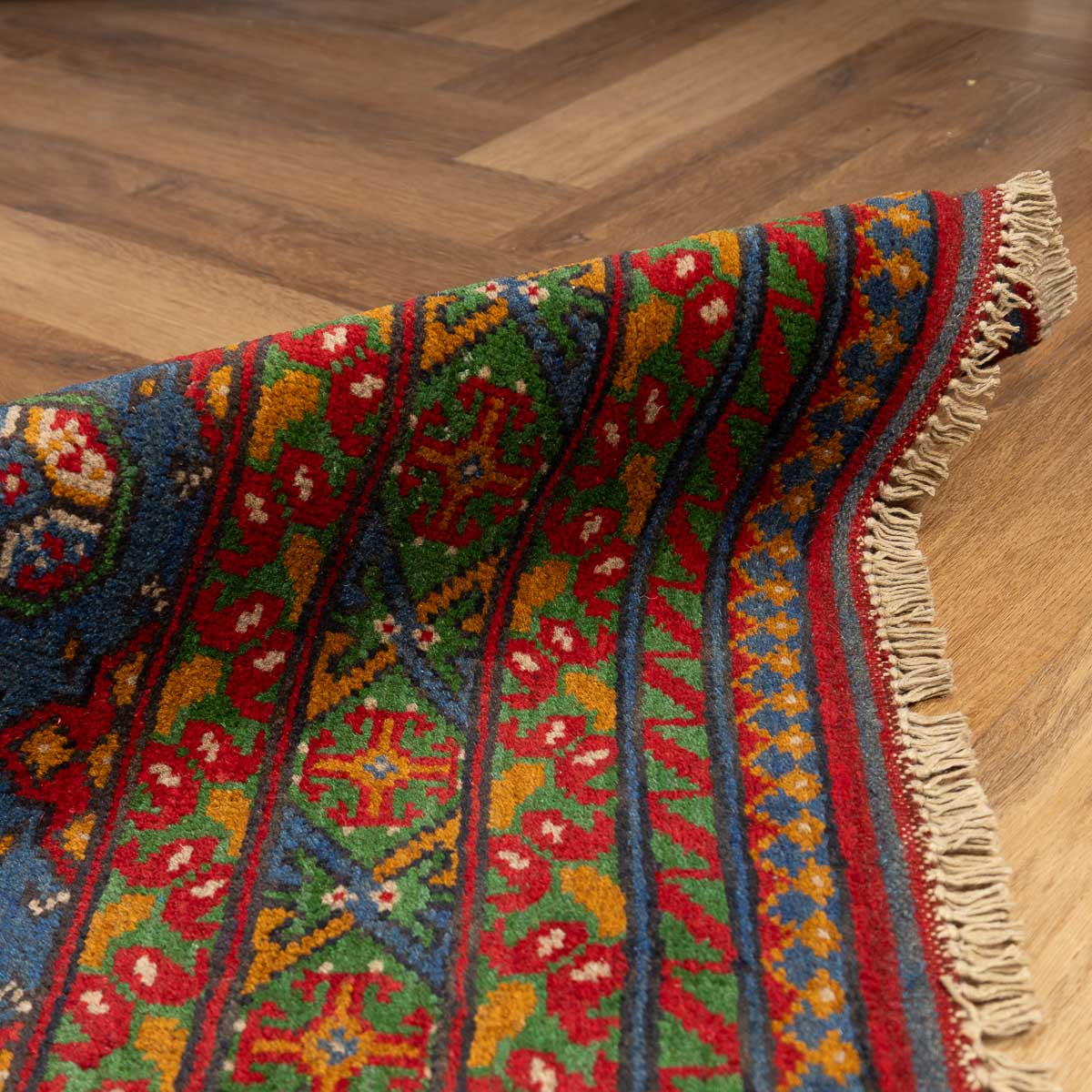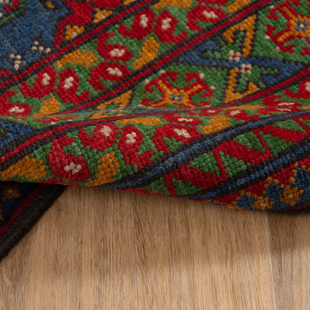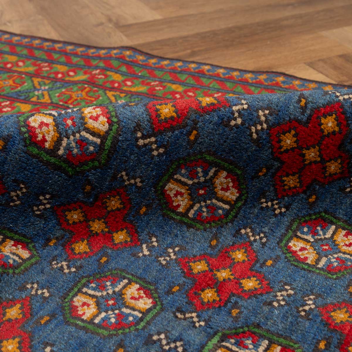 שטיח אפגני בעבודת יד מצמר טבעי, בשדה כחול עמוק עם מוטיבים גאומטריים סימטריים בגווני אדום, קרם וירוק. מסגרת עשירה ודוגמה צפופה יוצרות מראה מסורתי מדויק ומאוזן. המרקם רך אך יציב, עם גימור פרנזים עדין. מתאים לסלון, חדר עבודה או חלל אירוח עם אופי קלאסי.