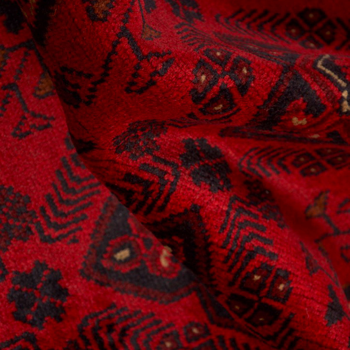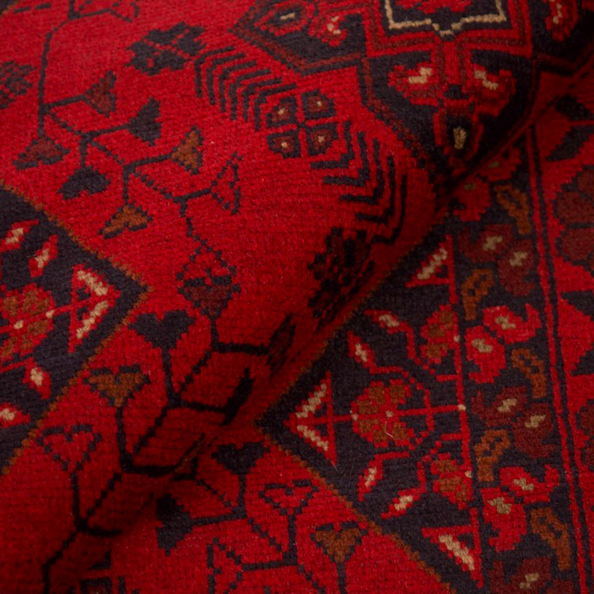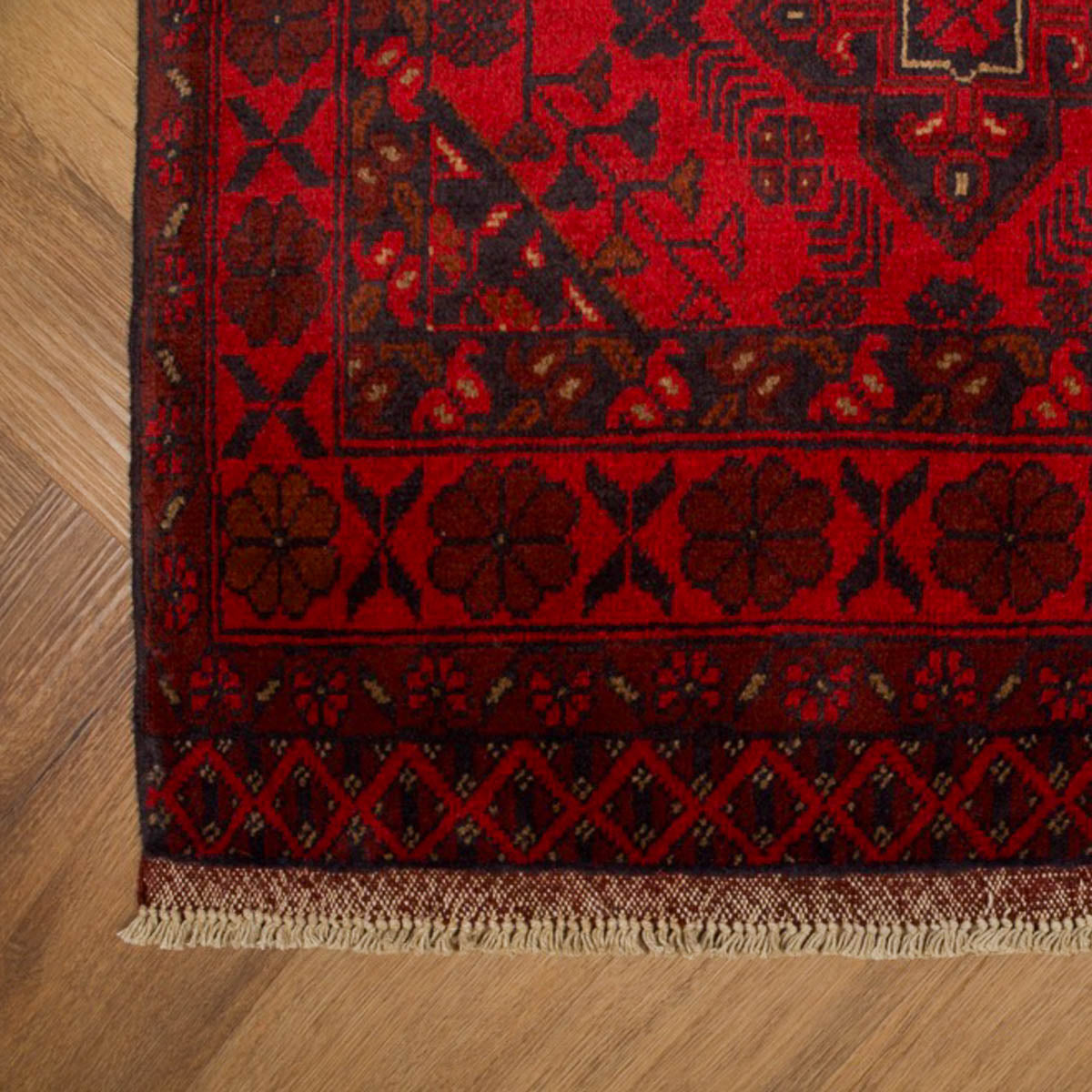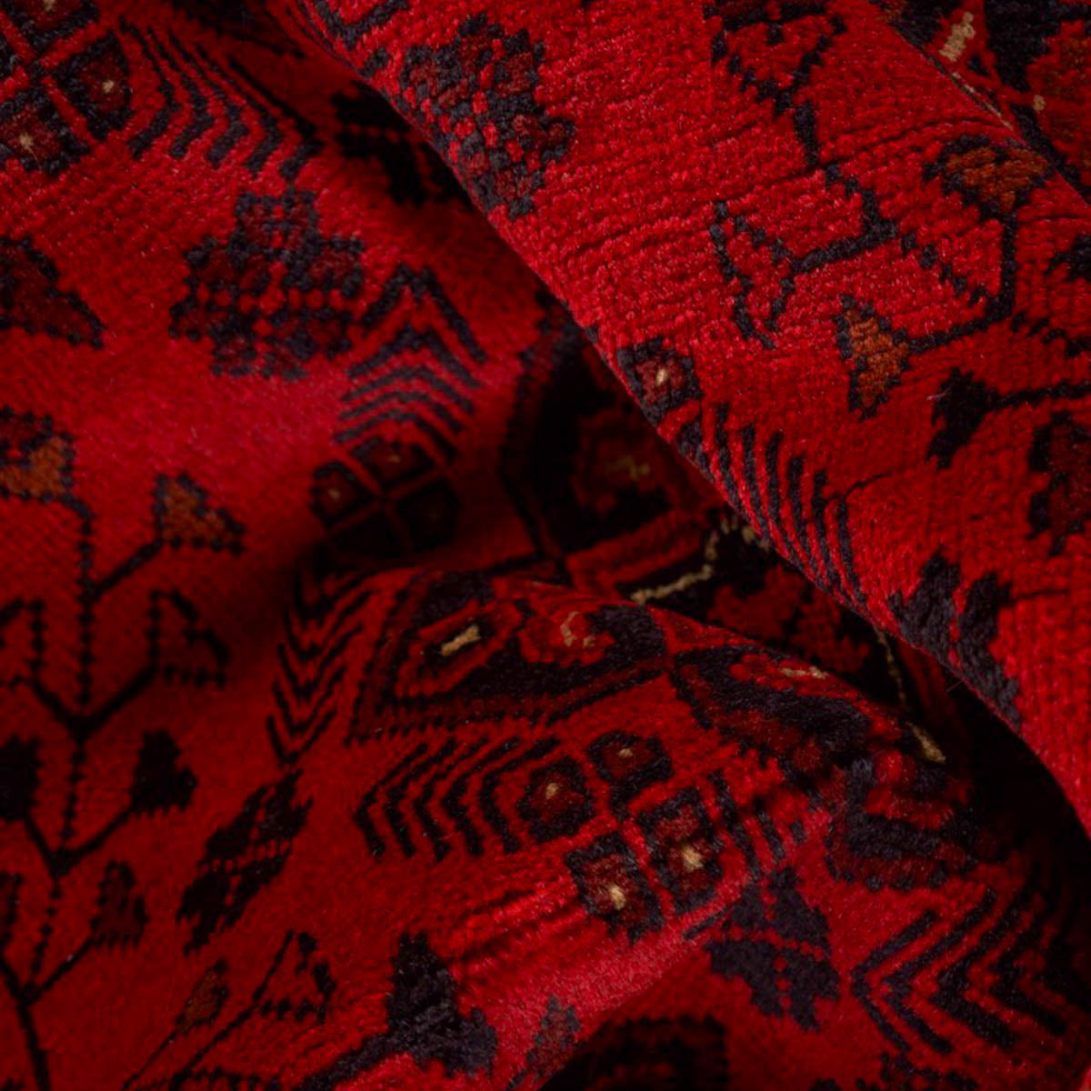 שטיח אפגני חלממדי בעבודת יד, עשיר בגוונים אדומים עמוקים ובדוגמאות שבטיות מסורתיות. שטיח עם נוכחות חזקה, חום ואופי, שמכניס עומק ואותנטיות לכל חלל.