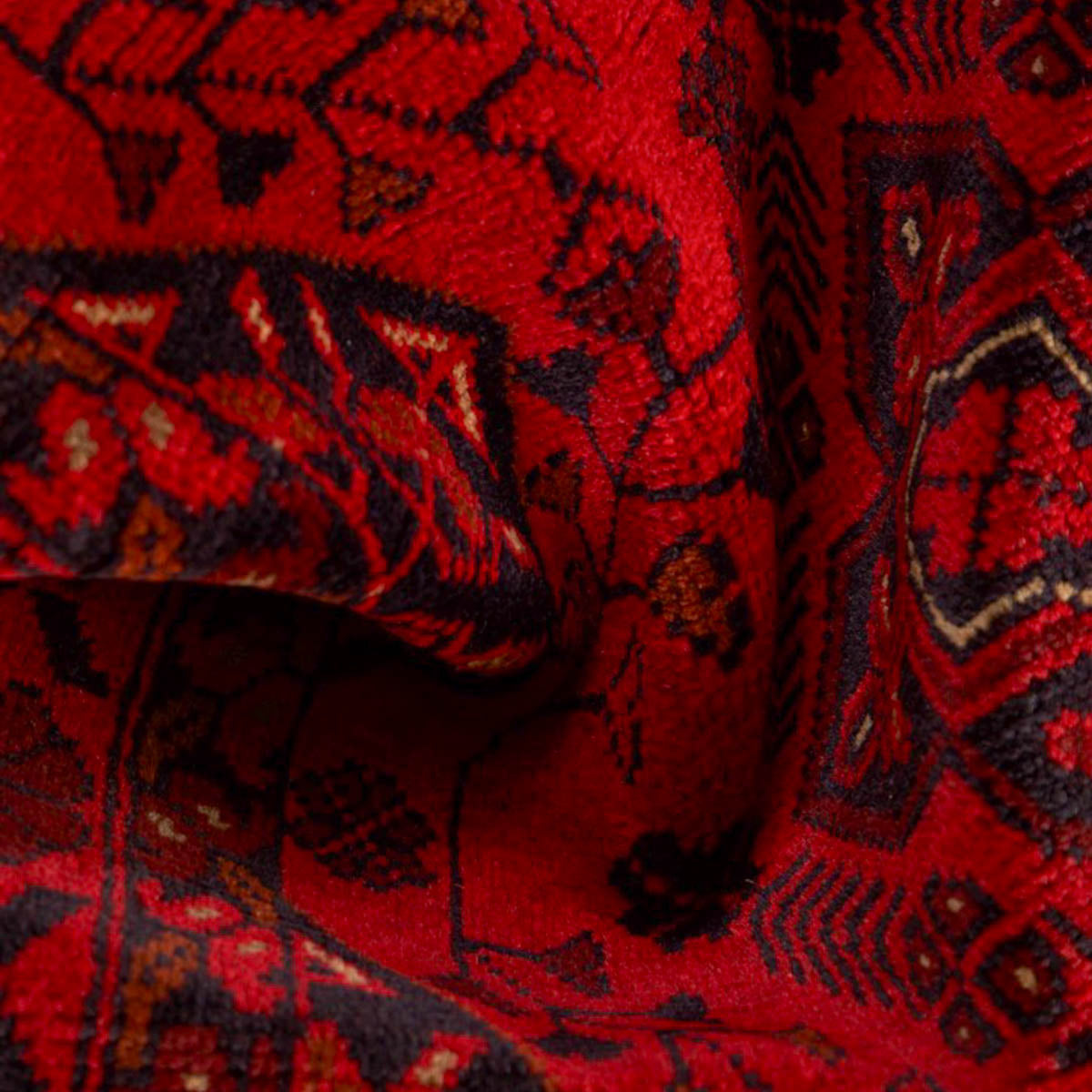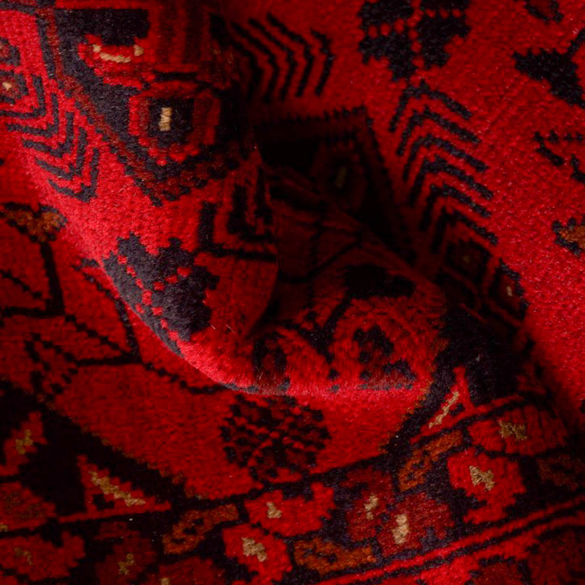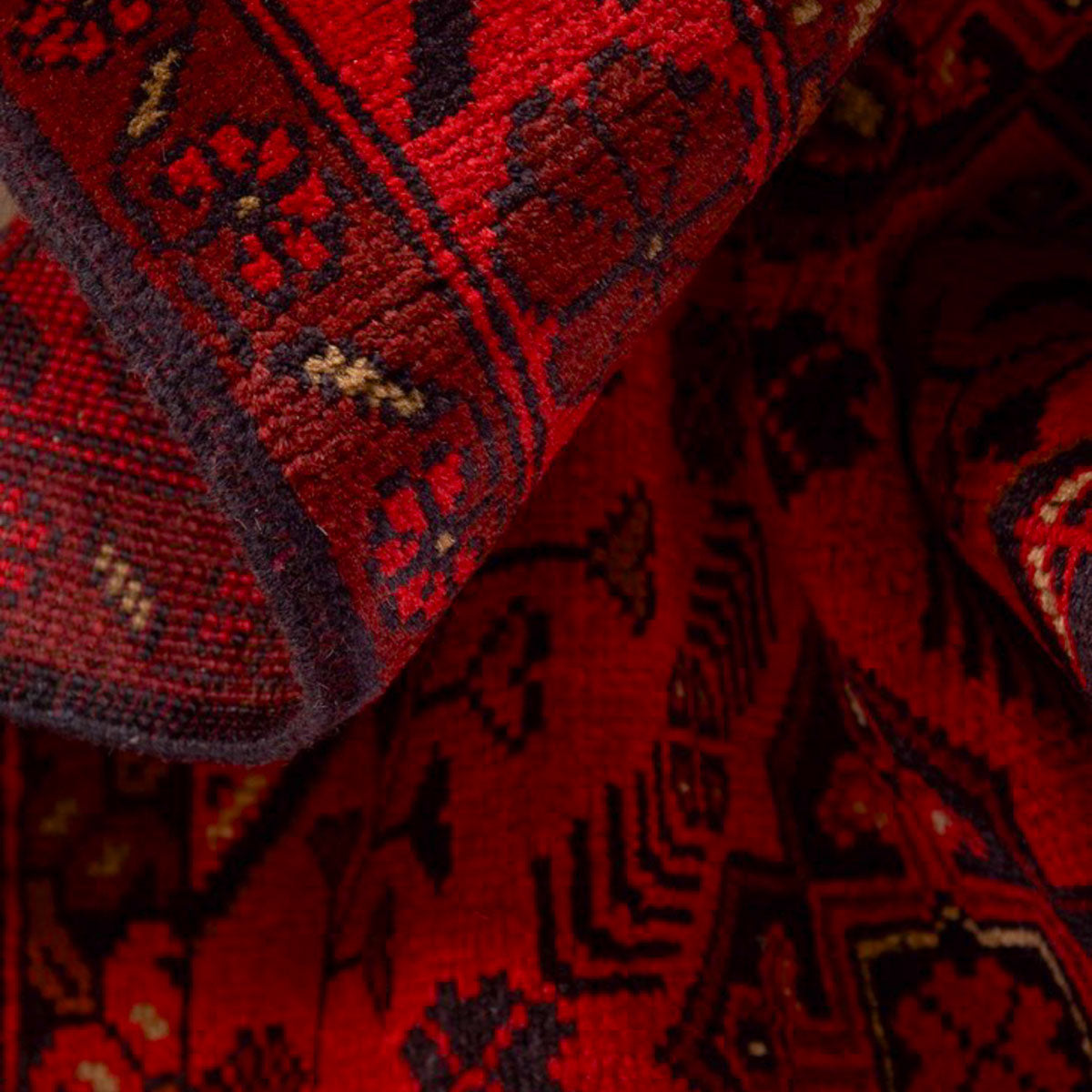 שטיח אפגני חלממדי בעבודת יד, עשיר בגוונים אדומים עמוקים ובדוגמאות שבטיות מסורתיות. שטיח עם נוכחות חזקה, חום ואופי, שמכניס עומק ואותנטיות לכל חלל.
