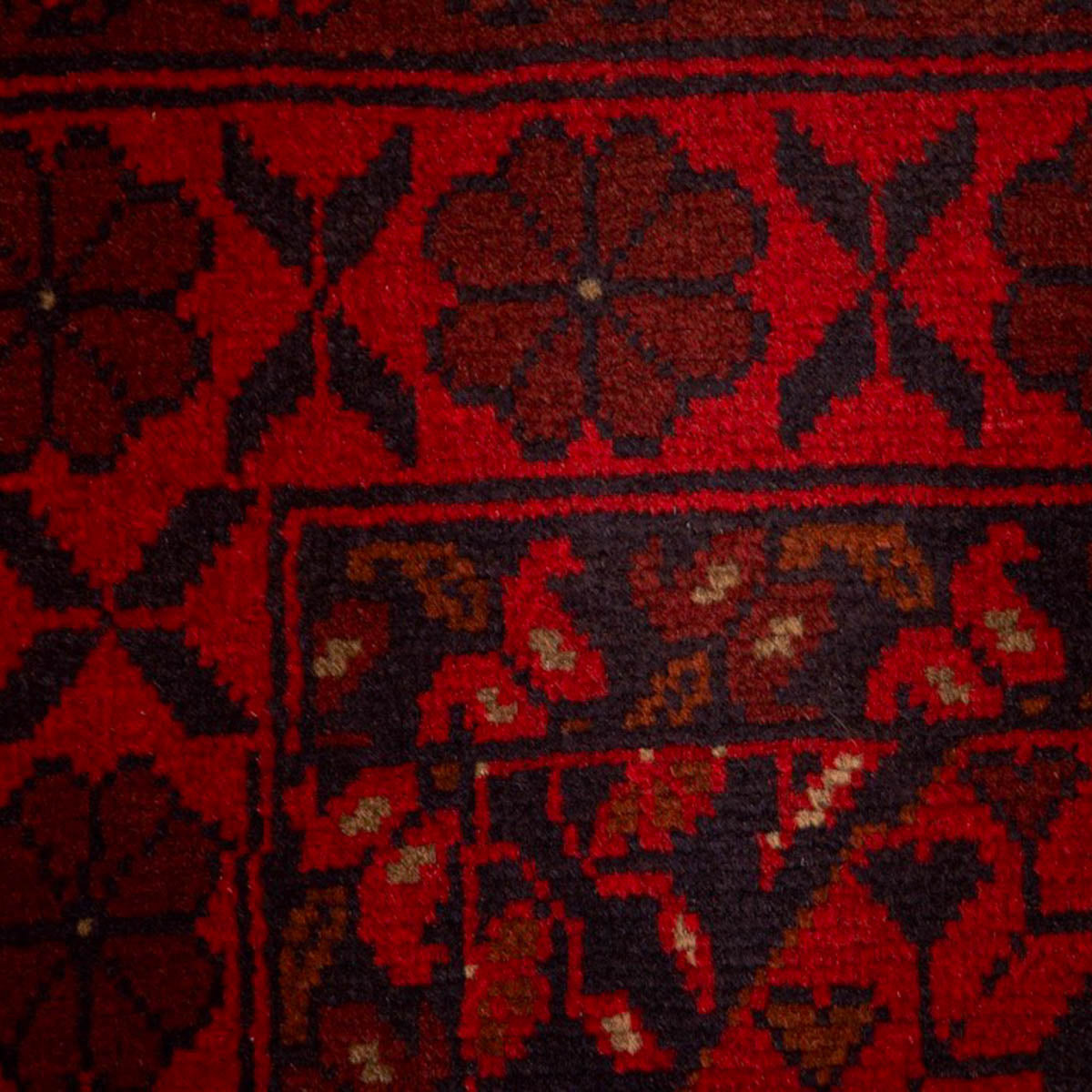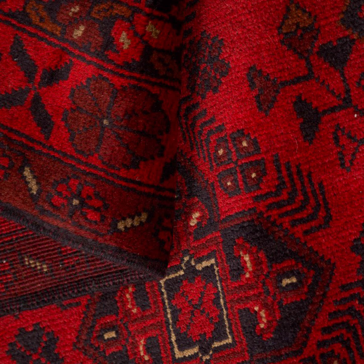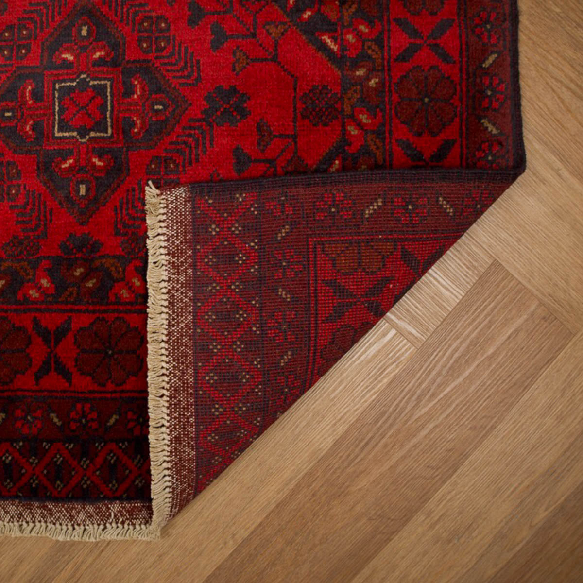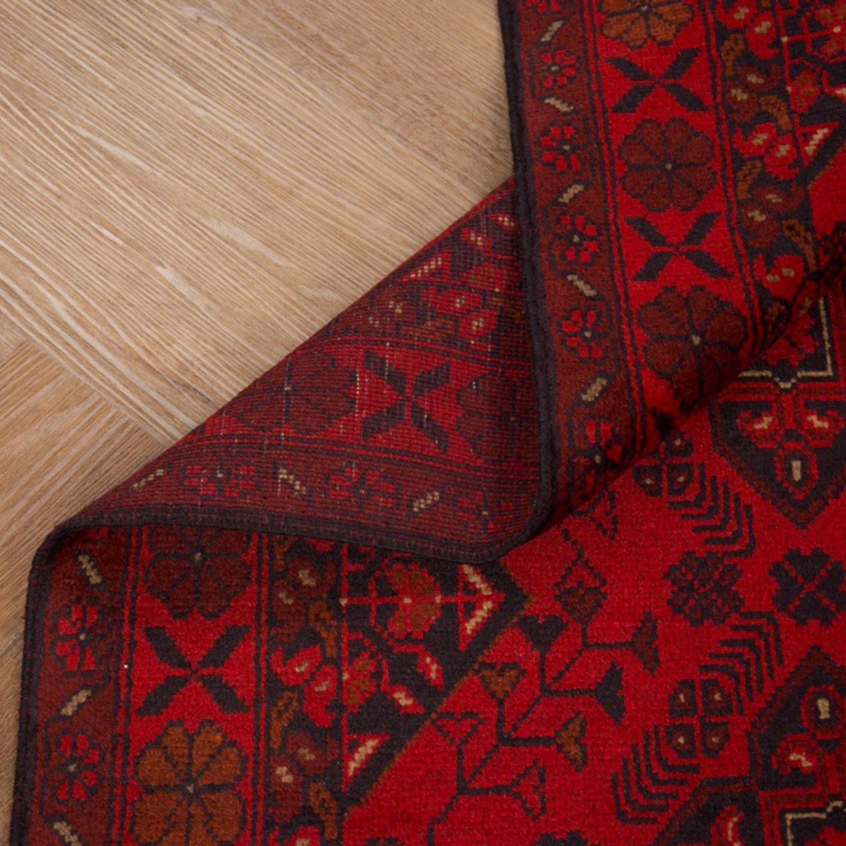 שטיח אפגני חלממדי בעבודת יד, עשיר בגוונים אדומים עמוקים ובדוגמאות שבטיות מסורתיות. שטיח עם נוכחות חזקה, חום ואופי, שמכניס עומק ואותנטיות לכל חלל.