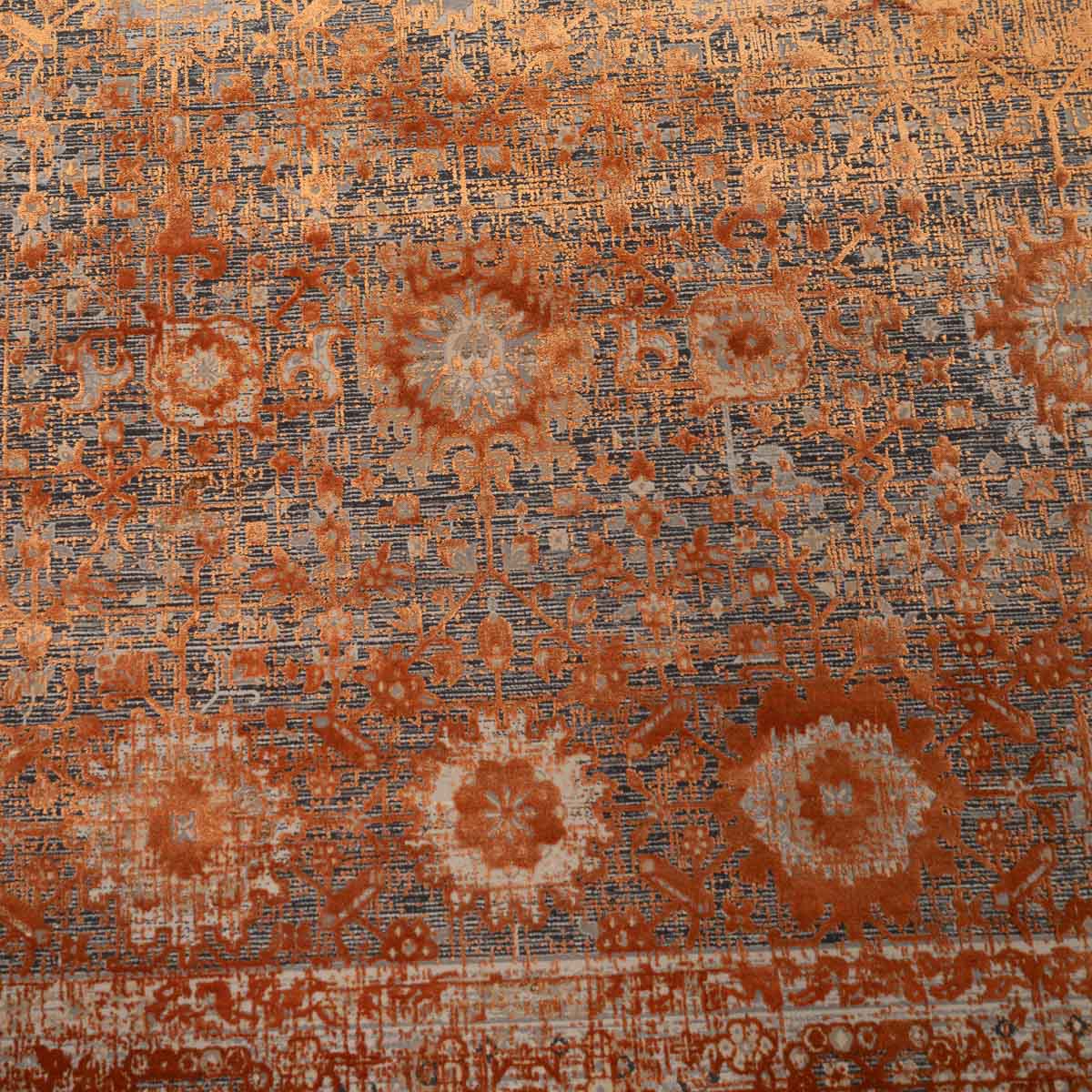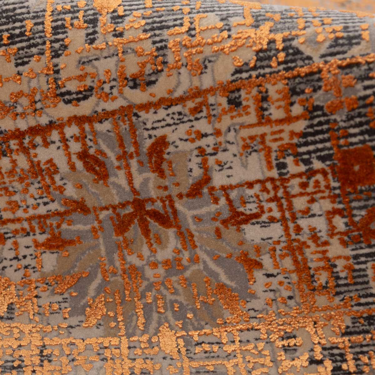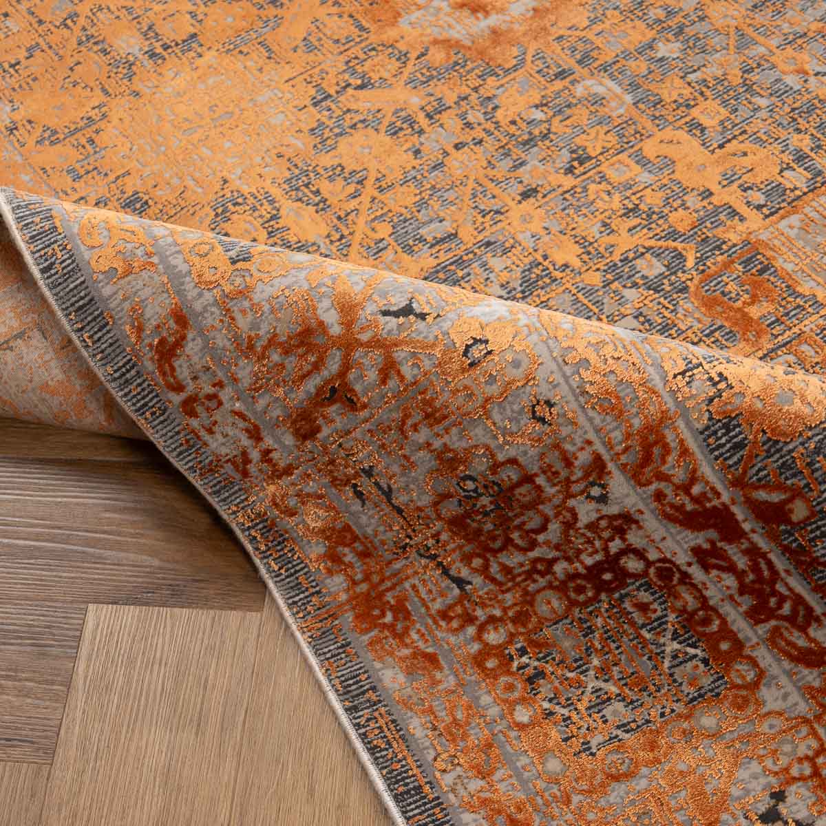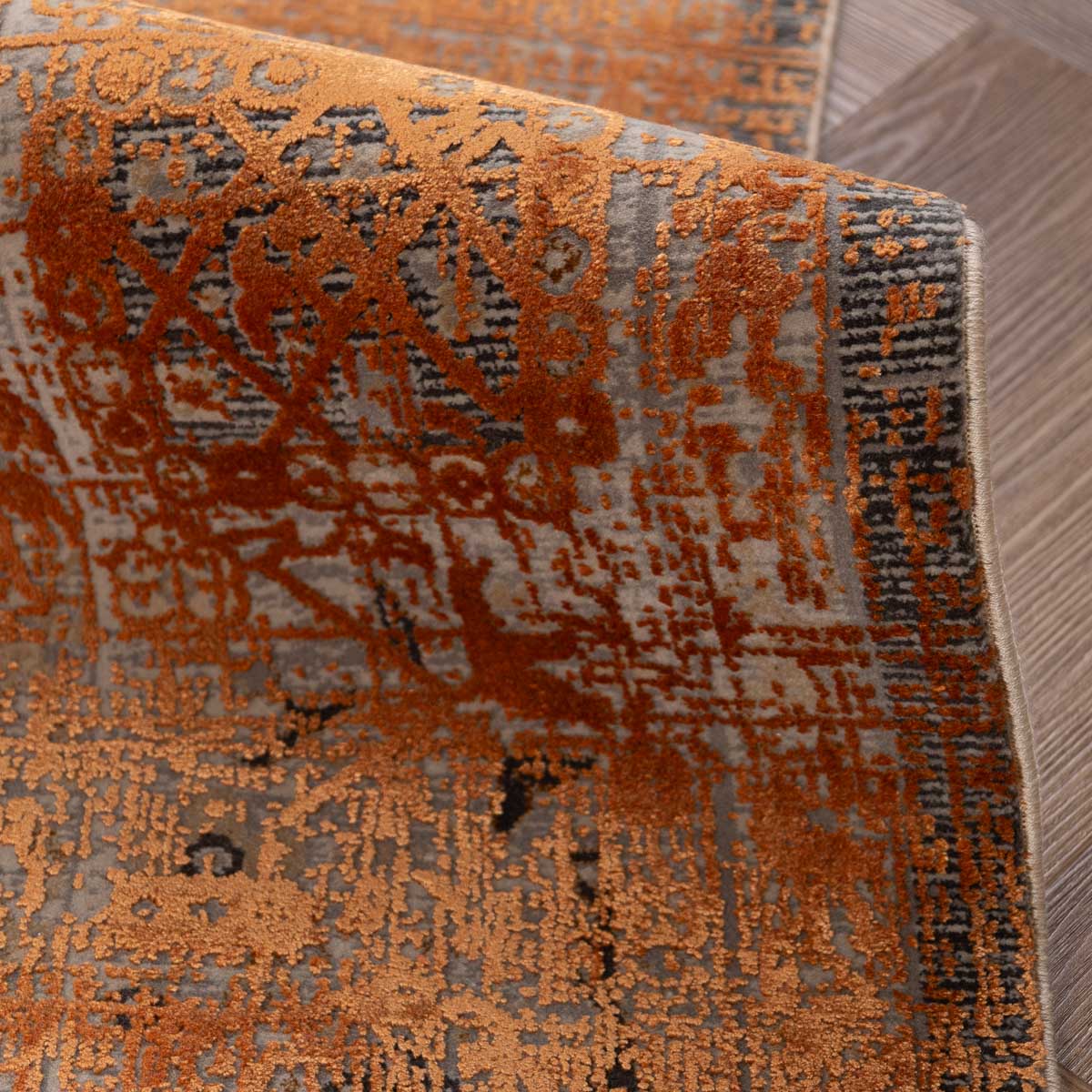 שטיח מסדרת היסטוריה, בעיצוב עוצמתי המשלב בין גווני אפור רגועים לכתום עז ודומיננטי. הדוגמה המיוחדת מעניקה לשטיח אופי ייחודי של וינטג' מודרני. השטיח נארג בצפיפות גבוהה במיוחד של 2 מיליון קשר, ועבר תהליך עישון סטון וואש שמעניק לו מראה עתיק ותחושת יוקרה אמיתית.