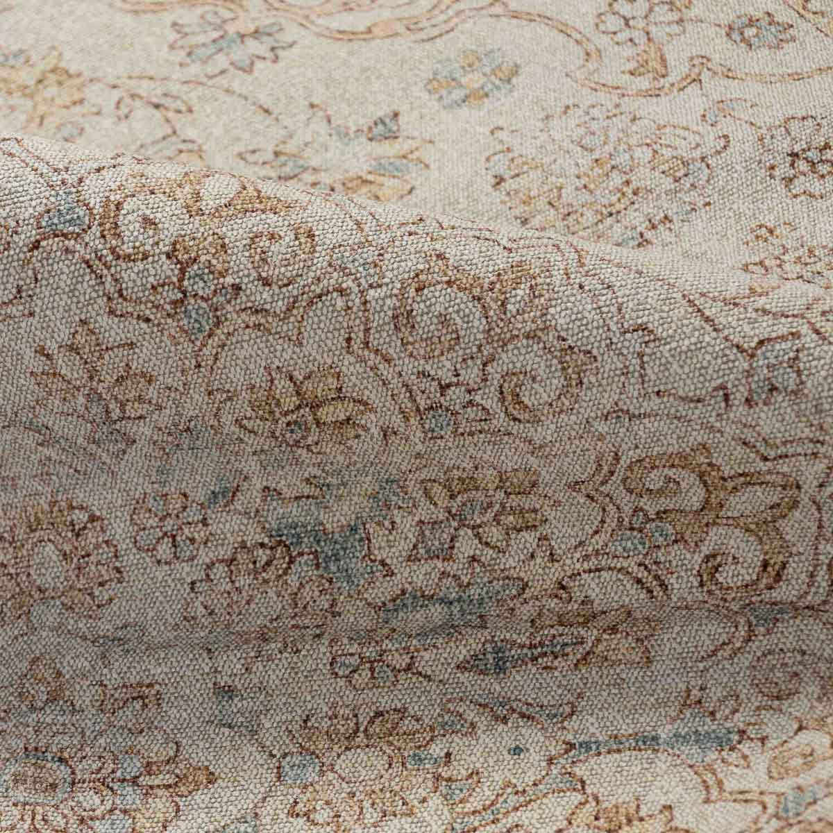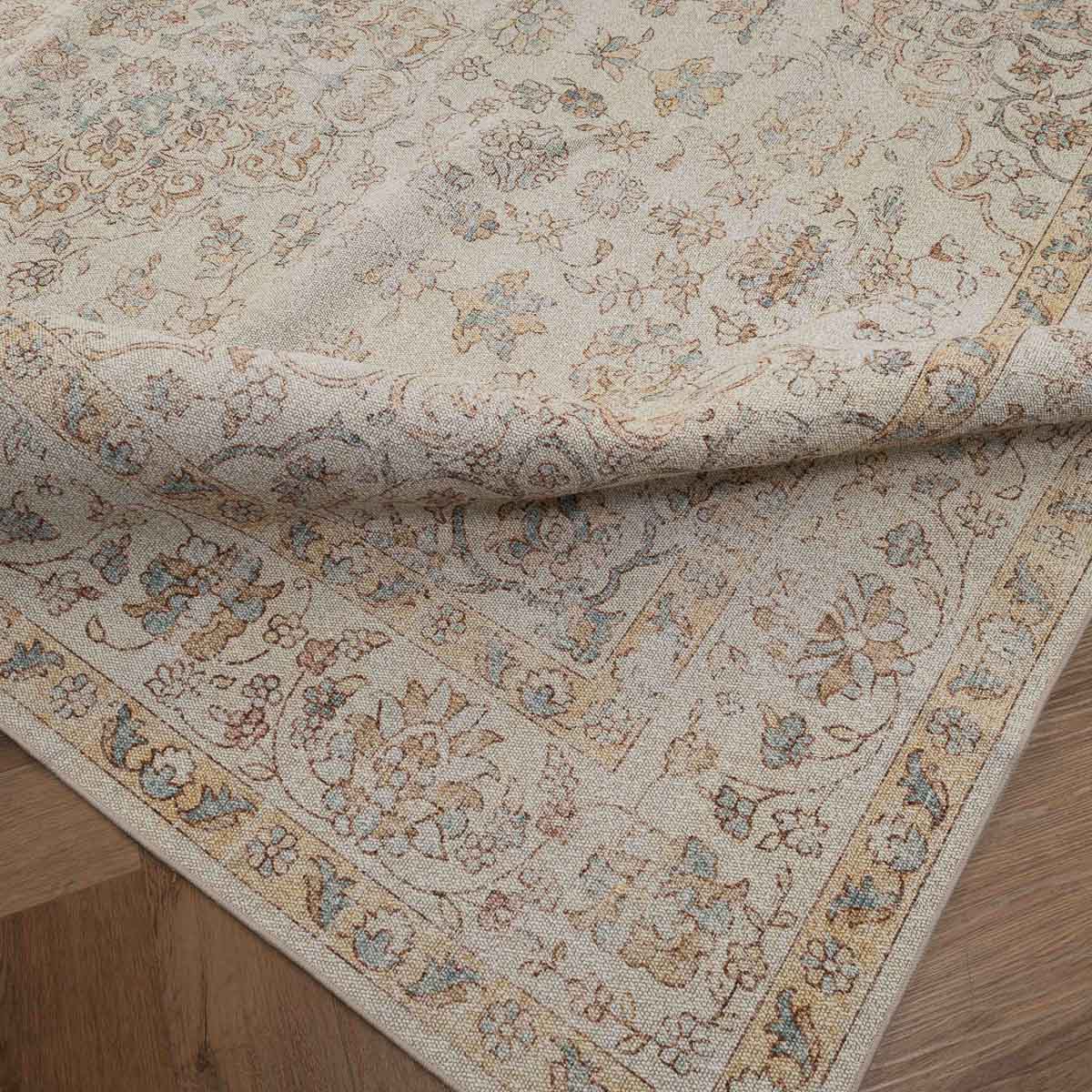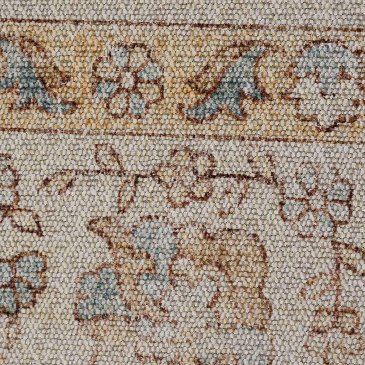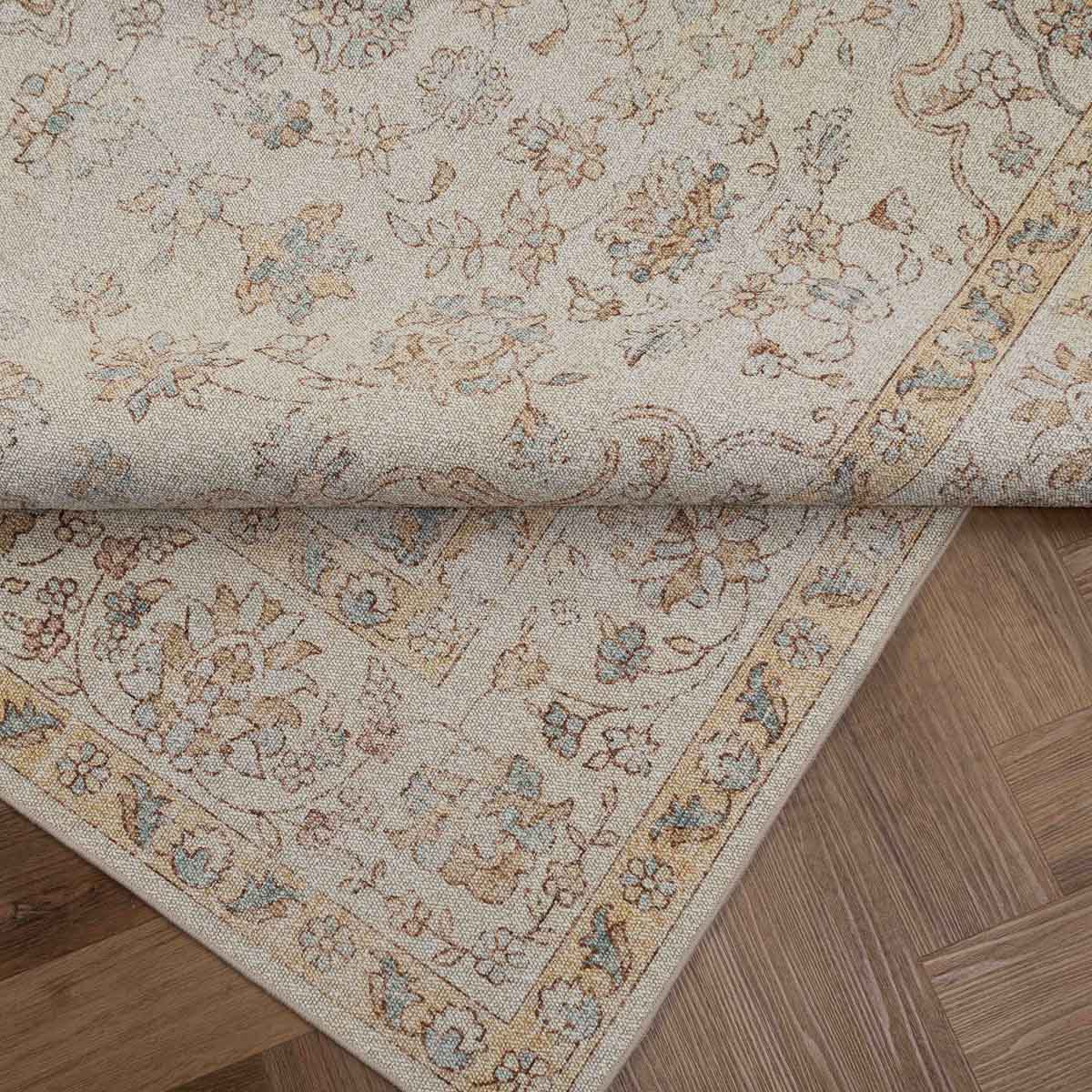 השטיח מעוצב בהשראת שטיחי הוינטאז' האירופאיים, עם דוגמה פרחונית עדינה שפרוסה בצורה מאוזנת על פני פני השטיח. הגוונים הקרמיים המשולבים בנגיעות כחול-שמיים, אוקר ובריק עדין יוצרים מראה נעים, חם ומואר.