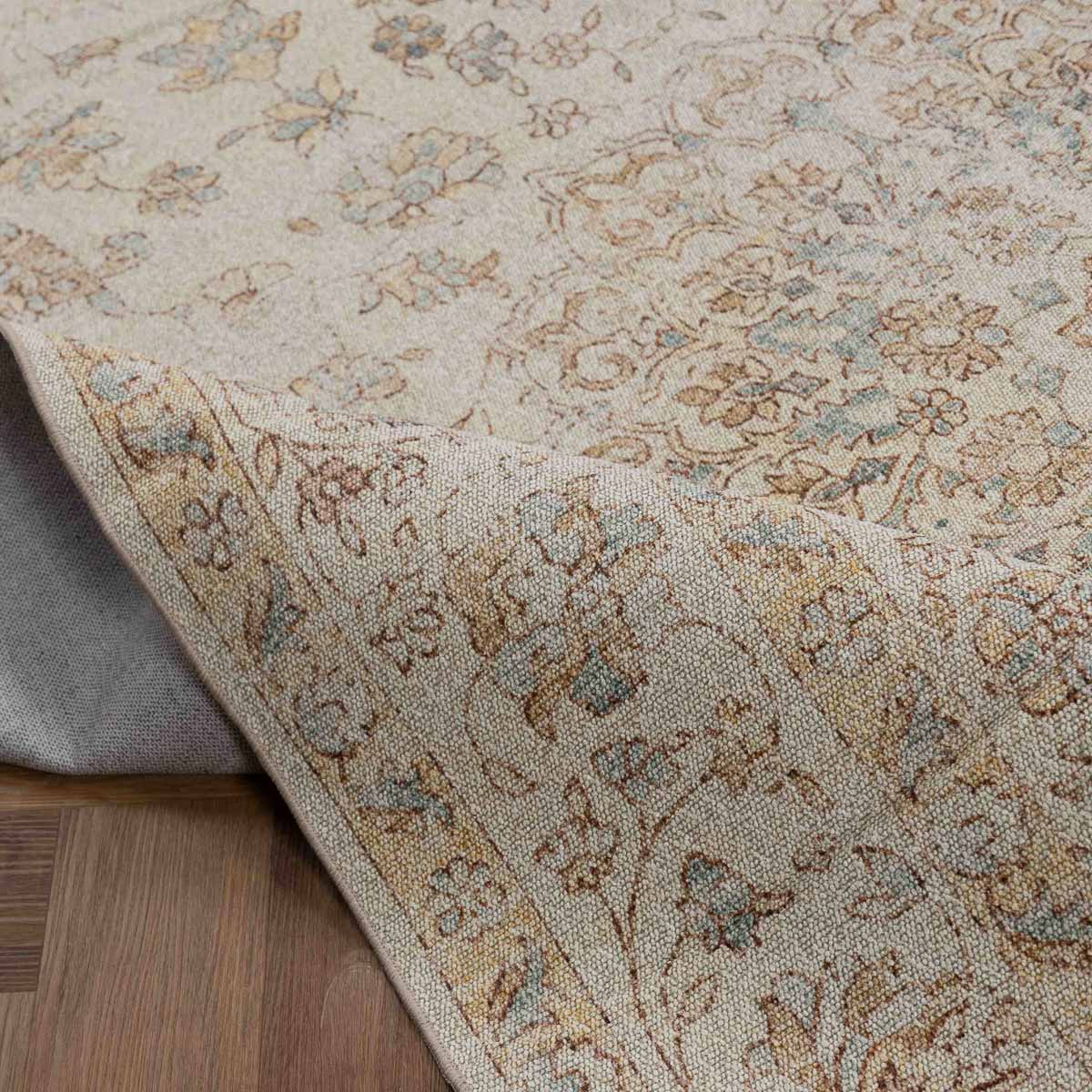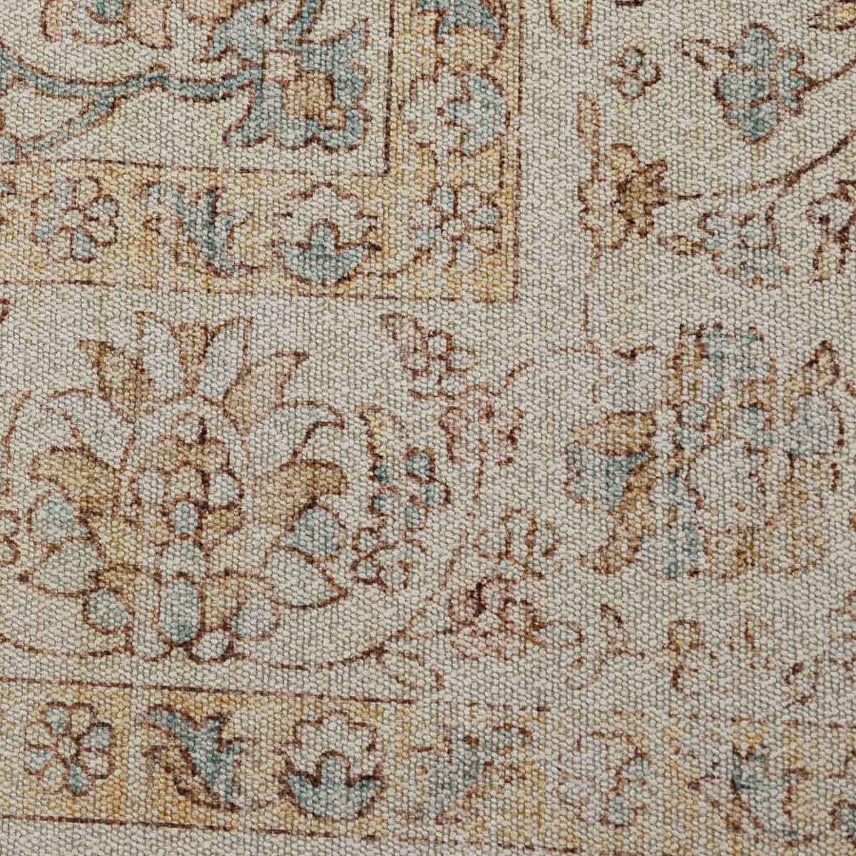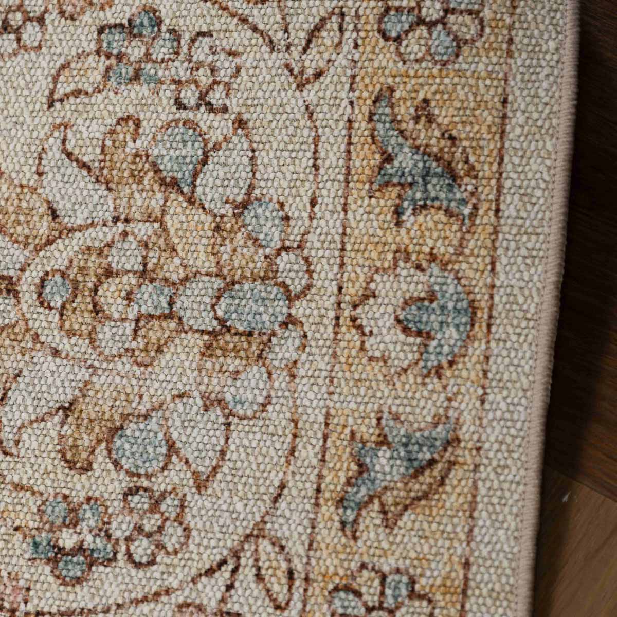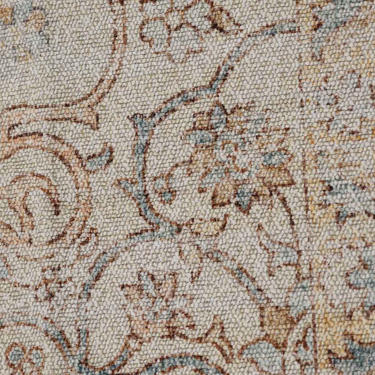 השטיח מעוצב בהשראת שטיחי הוינטאז' האירופאיים, עם דוגמה פרחונית עדינה שפרוסה בצורה מאוזנת על פני פני השטיח. הגוונים הקרמיים המשולבים בנגיעות כחול-שמיים, אוקר ובריק עדין יוצרים מראה נעים, חם ומואר.