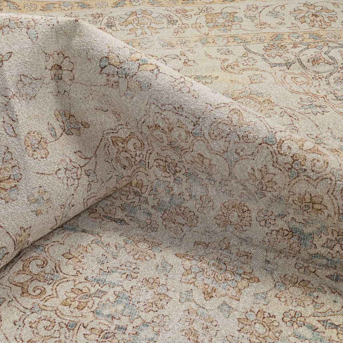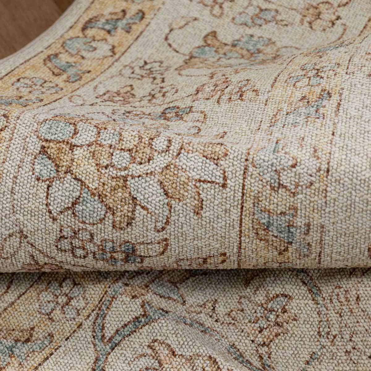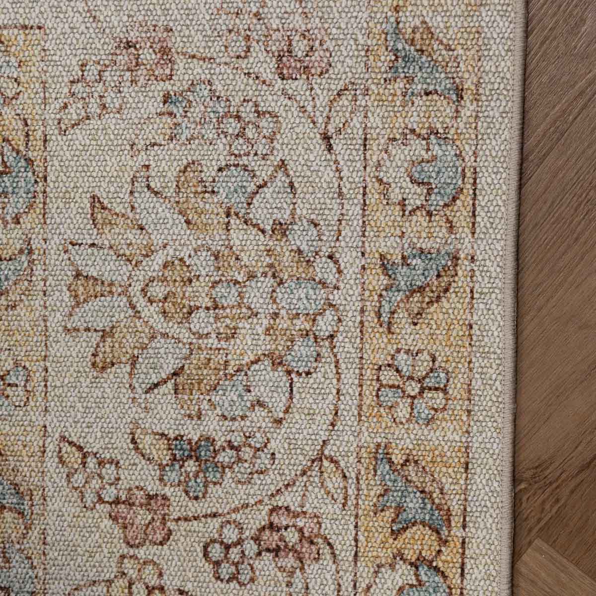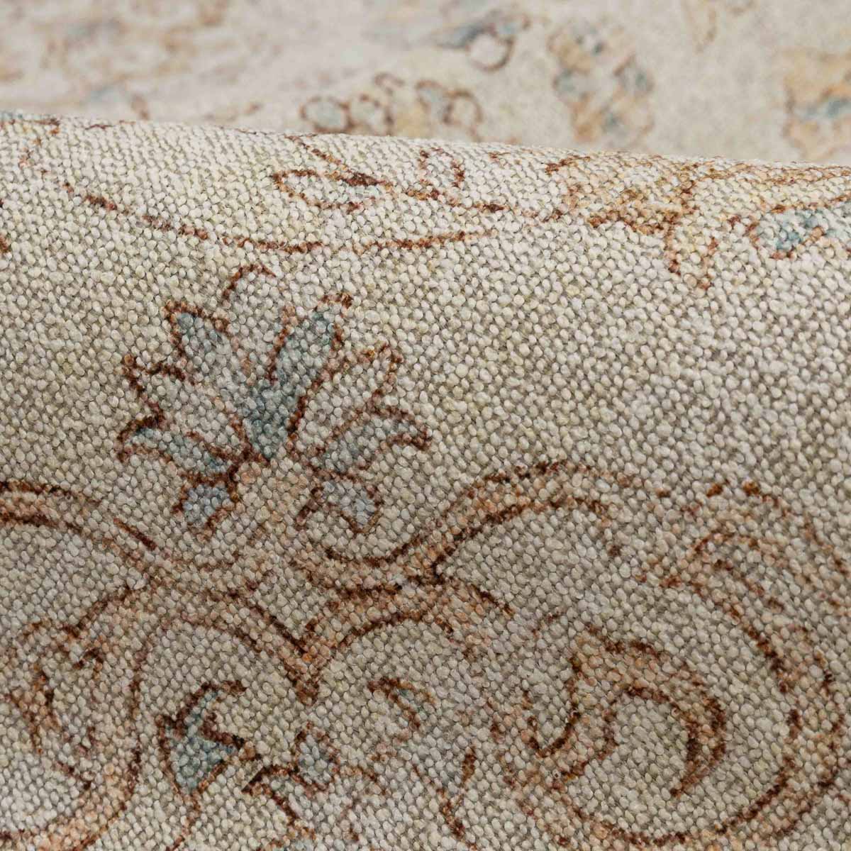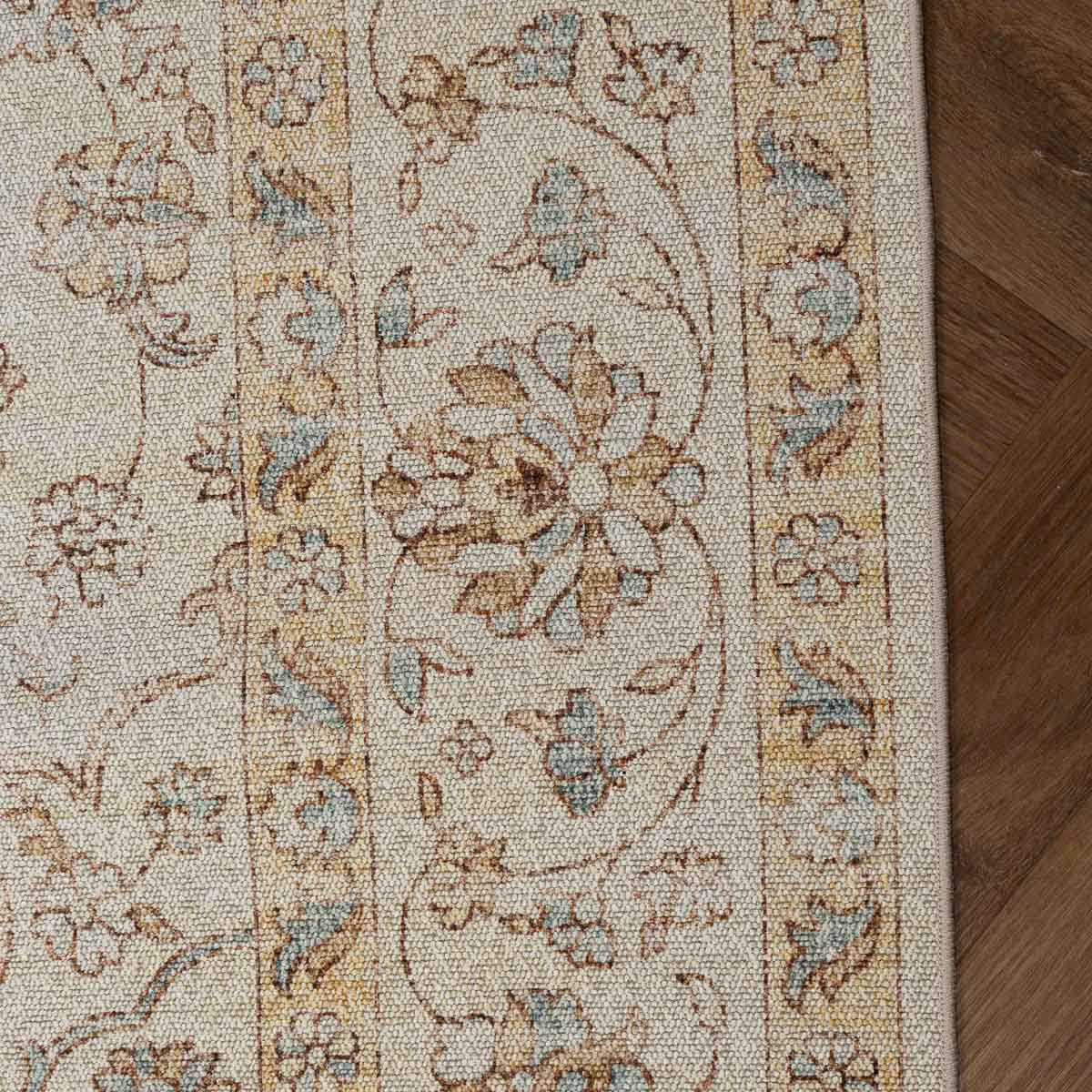 השטיח מעוצב בהשראת שטיחי הוינטאז' האירופאיים, עם דוגמה פרחונית עדינה שפרוסה בצורה מאוזנת על פני פני השטיח. הגוונים הקרמיים המשולבים בנגיעות כחול-שמיים, אוקר ובריק עדין יוצרים מראה נעים, חם ומואר.