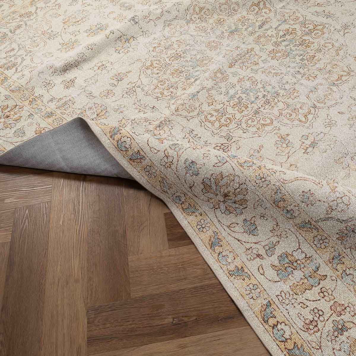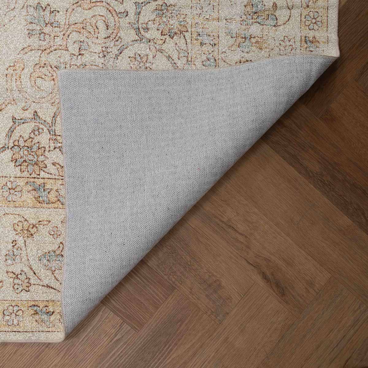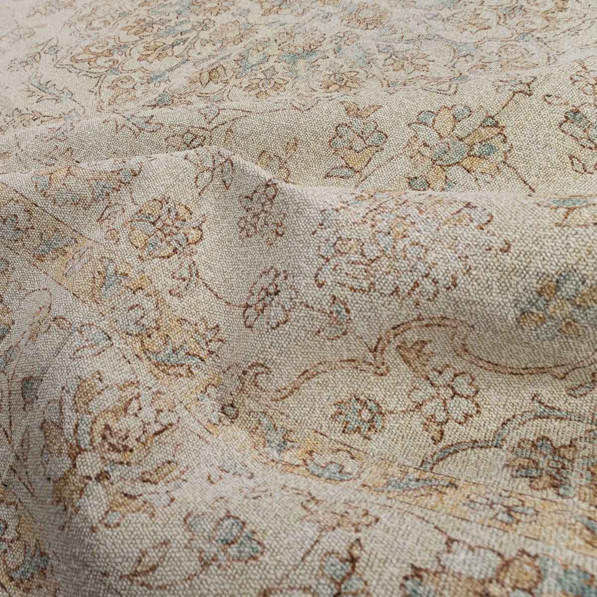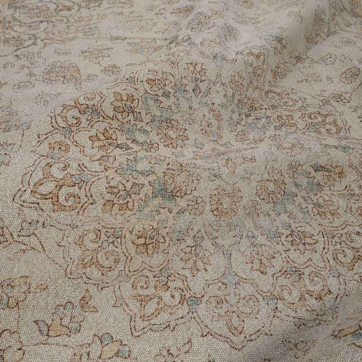 השטיח מעוצב בהשראת שטיחי הוינטאז' האירופאיים, עם דוגמה פרחונית עדינה שפרוסה בצורה מאוזנת על פני פני השטיח. הגוונים הקרמיים המשולבים בנגיעות כחול-שמיים, אוקר ובריק עדין יוצרים מראה נעים, חם ומואר.