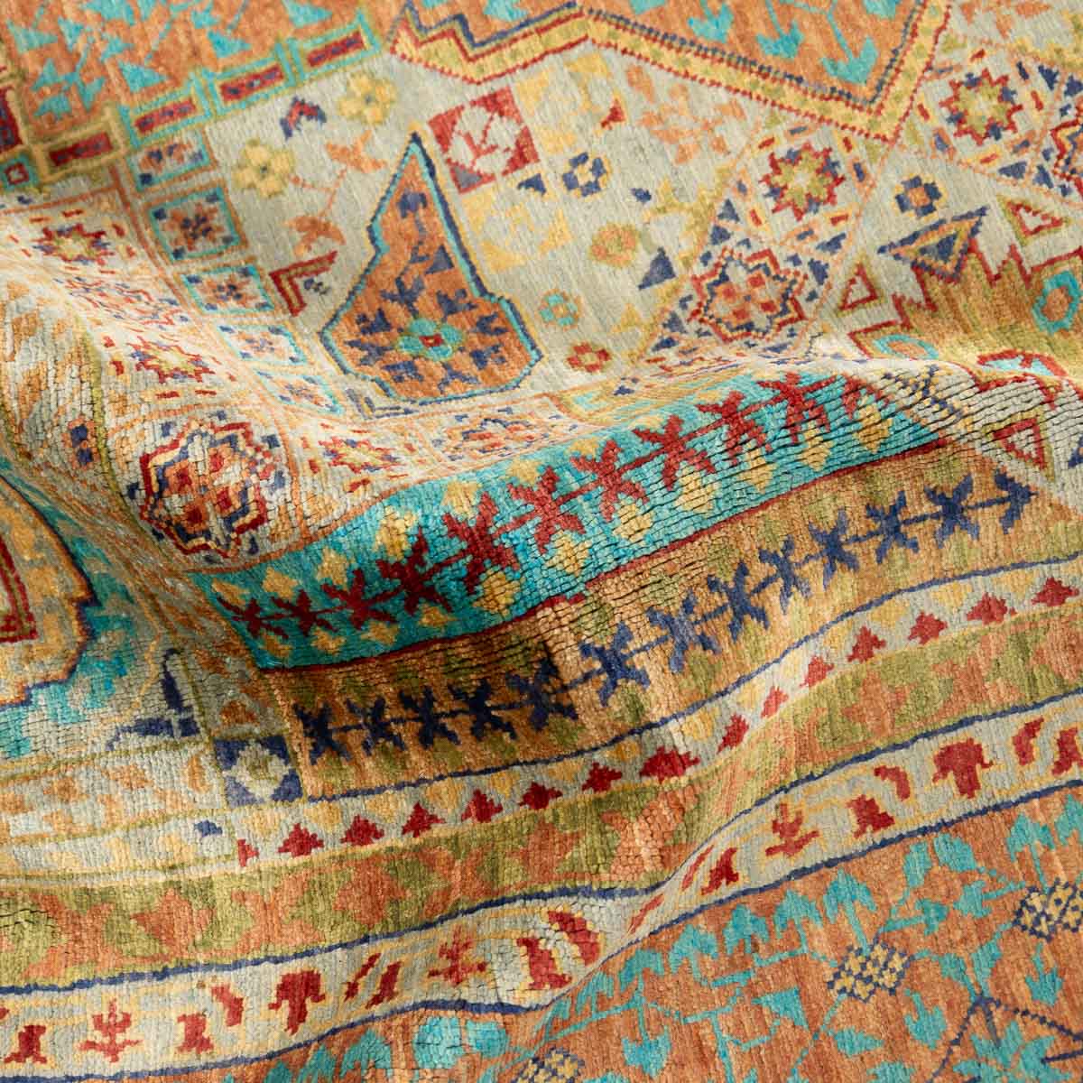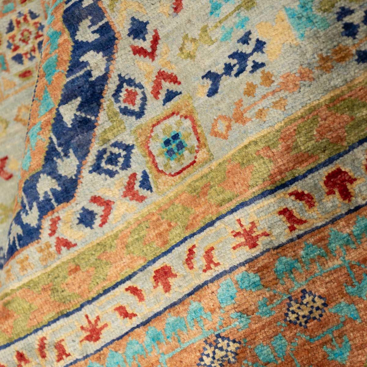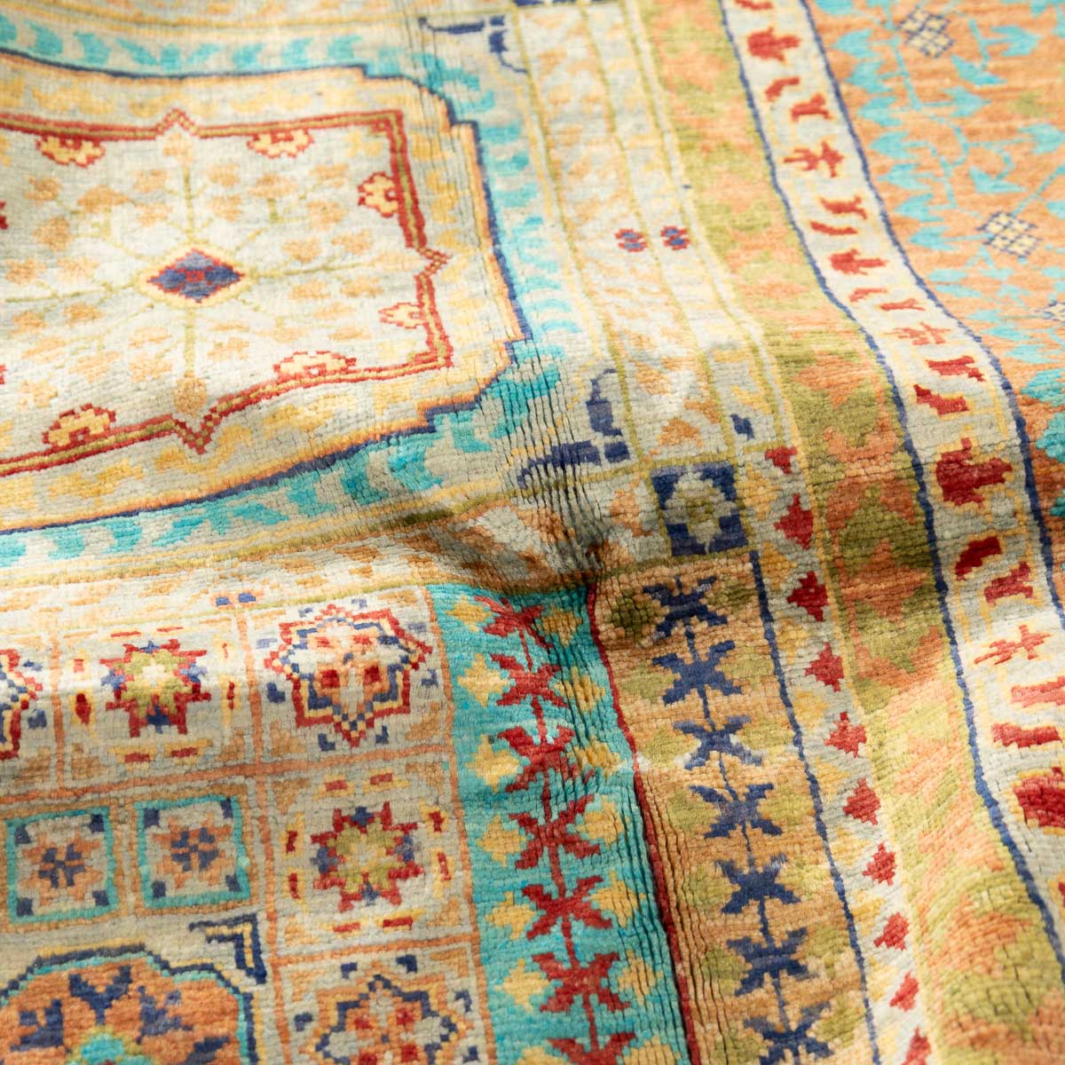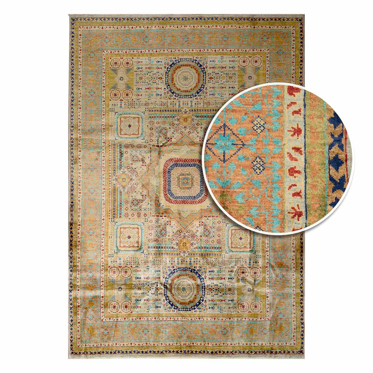שטיח עבודת יד, צפוף במיוחד ונארג ברמת גימור גבוהה. הדוגמה הממלוכית הקלאסית משלבת מדליונים גיאומטריים ועיטורים מורכבים בגווני טורקיז, זהב חם, כחול עמוק ואדום על בסיס בהיר.