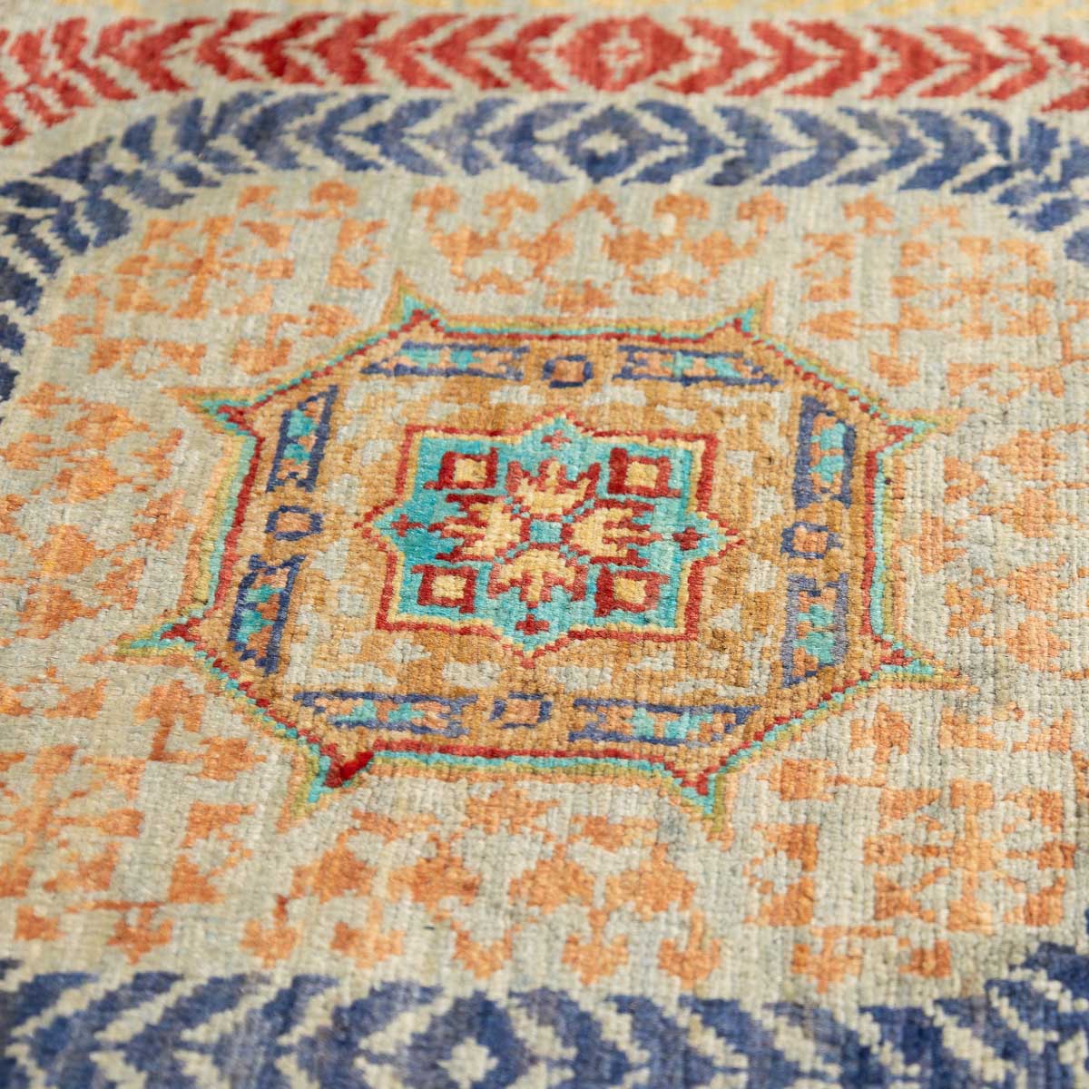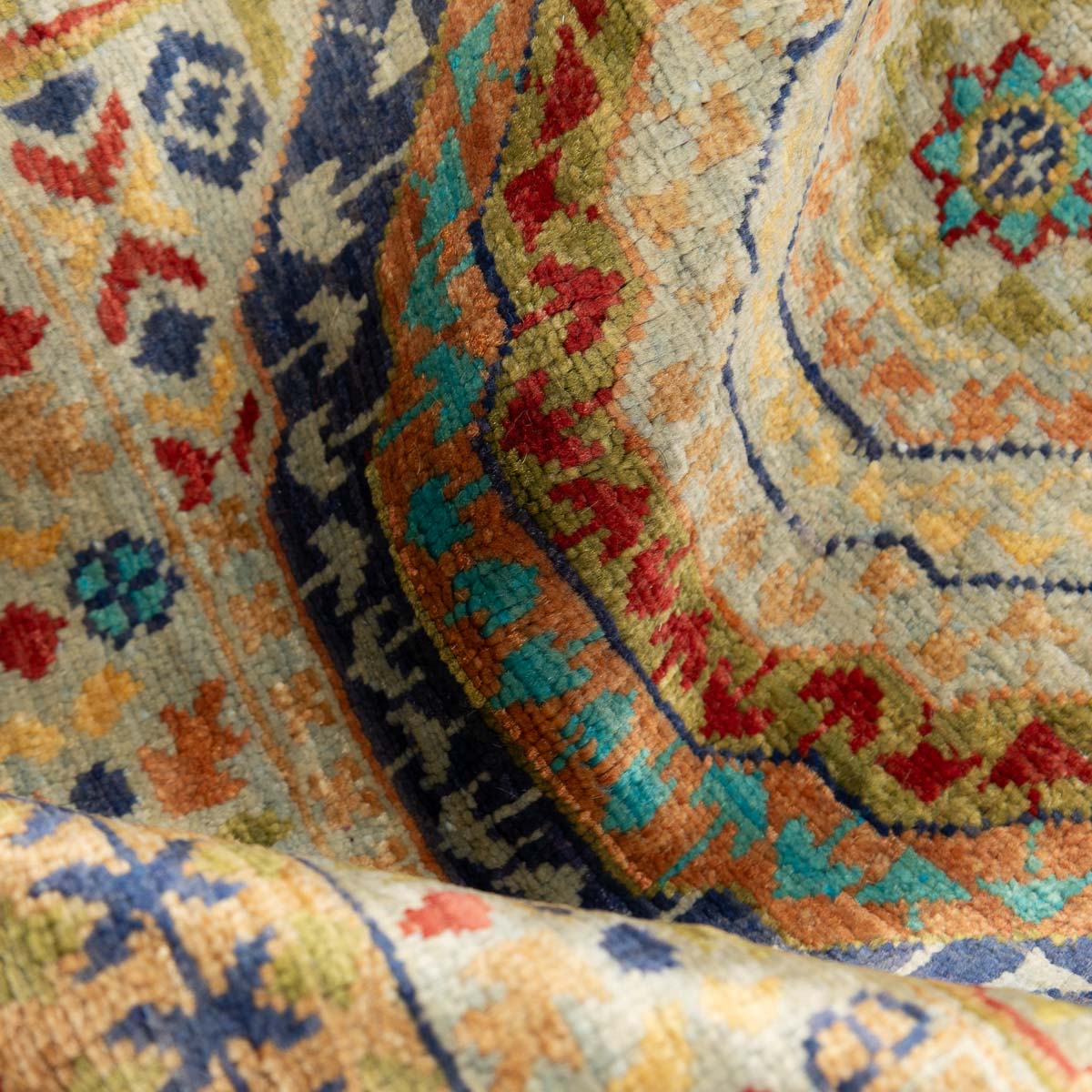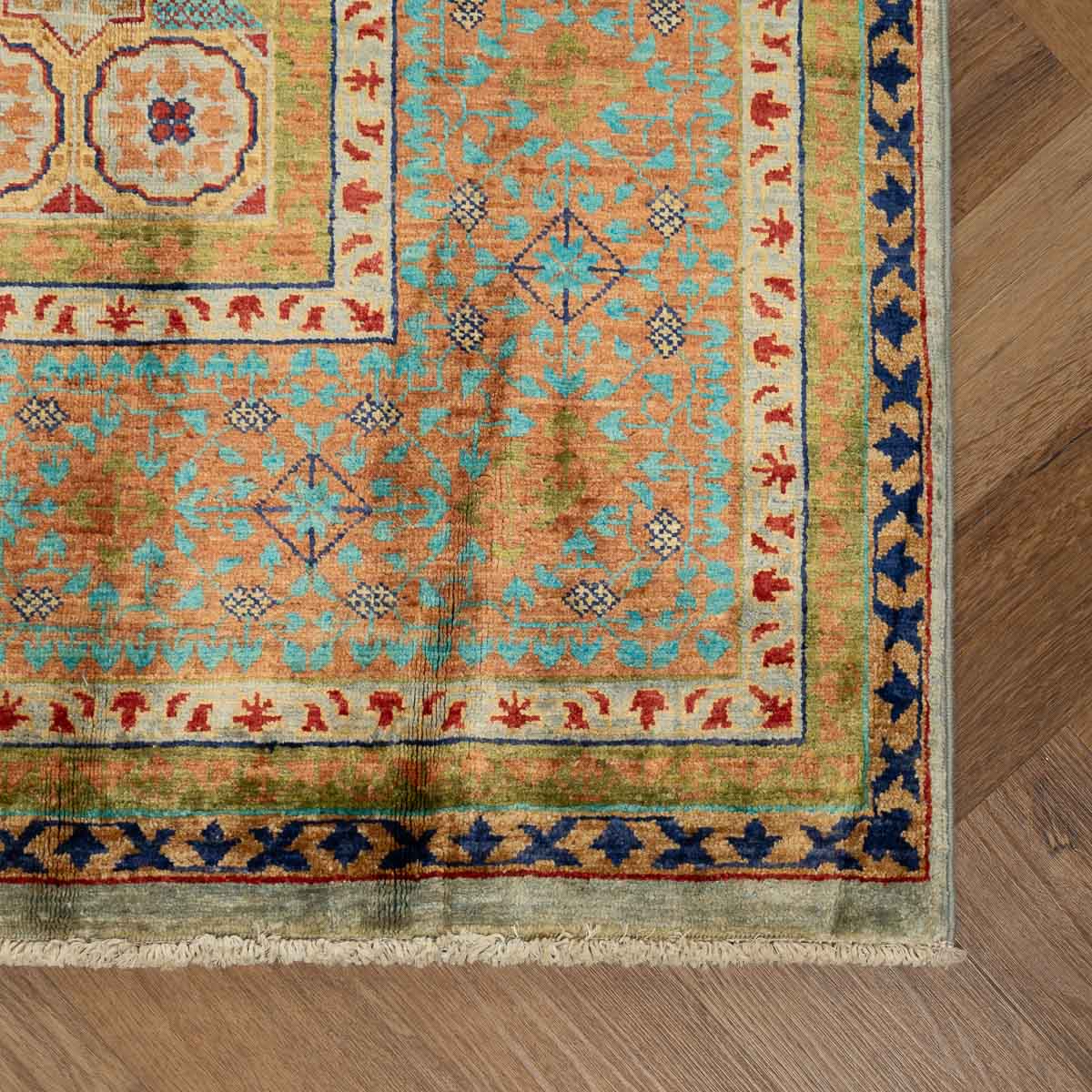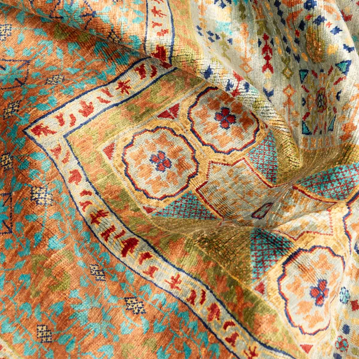 שטיח עבודת יד, צפוף במיוחד ונארג ברמת גימור גבוהה. הדוגמה הממלוכית הקלאסית משלבת מדליונים גיאומטריים ועיטורים מורכבים בגווני טורקיז, זהב חם, כחול עמוק ואדום על בסיס בהיר.