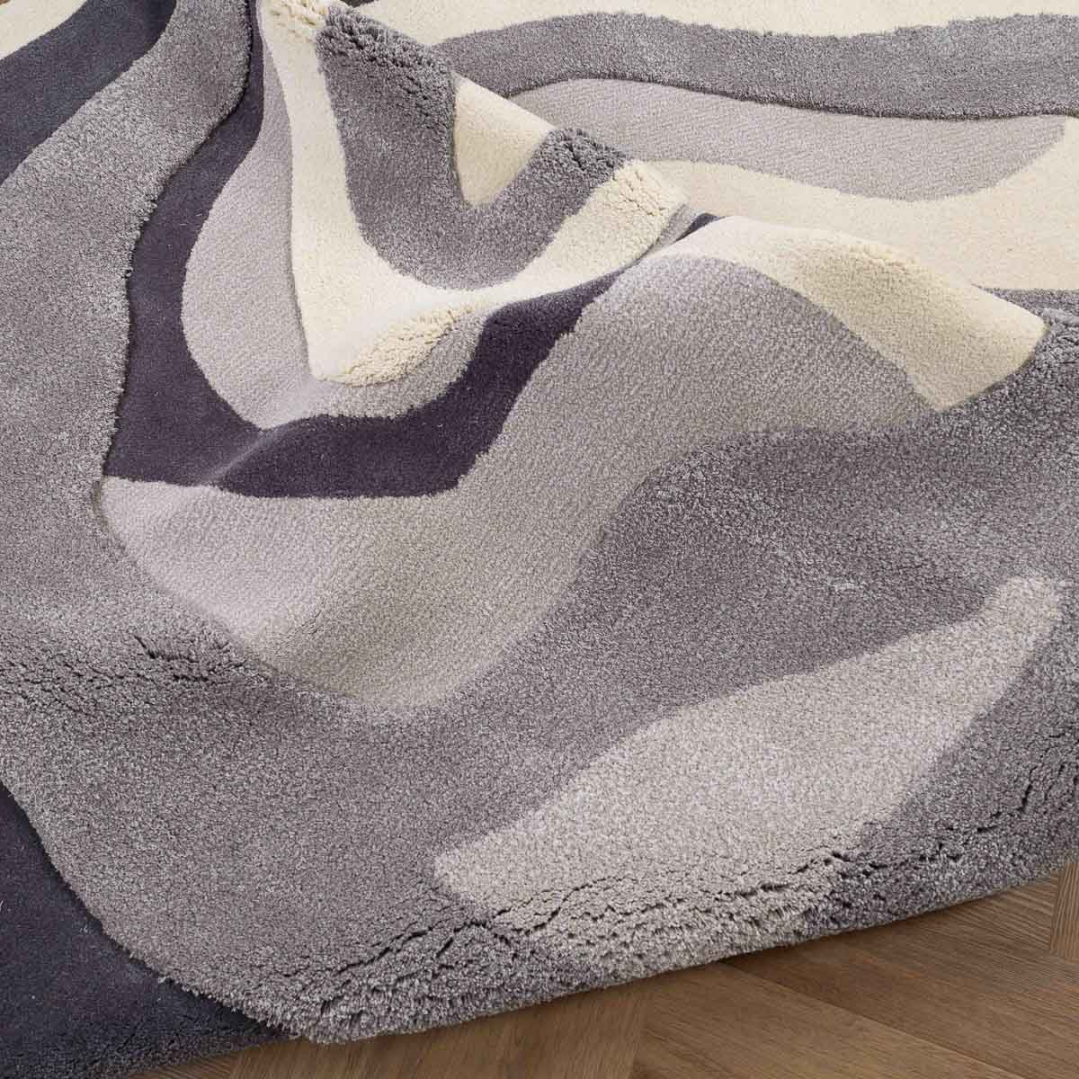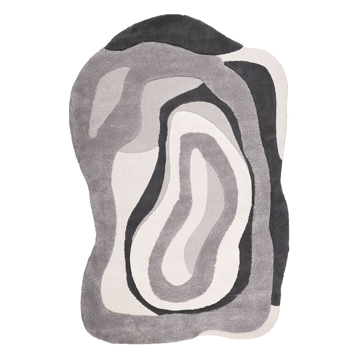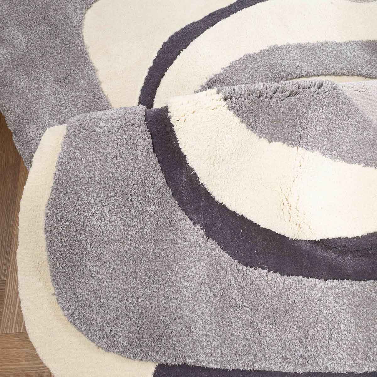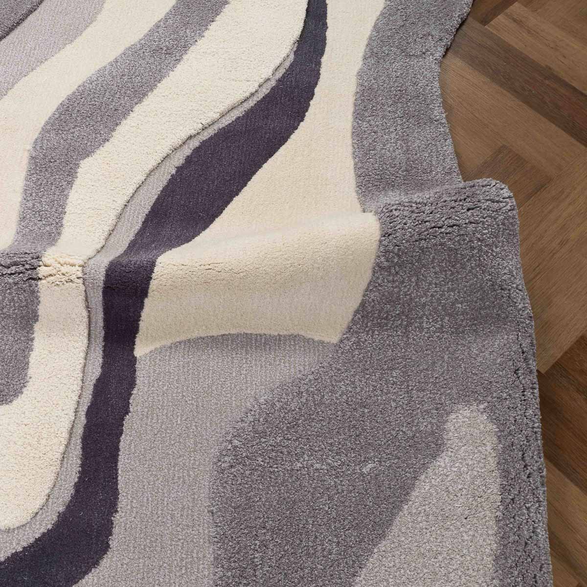 שטיח בגוונים של אפור, פחם ולבן המשתלבים בהרמוניה עכשווית ואלגנטית. הצורה הלא סימטרית מעניקה אופי ייחודי לכל חלל – מושלם לסלונים מודרניים, חללי עבודה מעוצבים או חדרי שינה יוקרתיים. המשחק בין עומקי האריגה יוצר תחושת תלת־ממד מרהיבה ונעימה לעין.