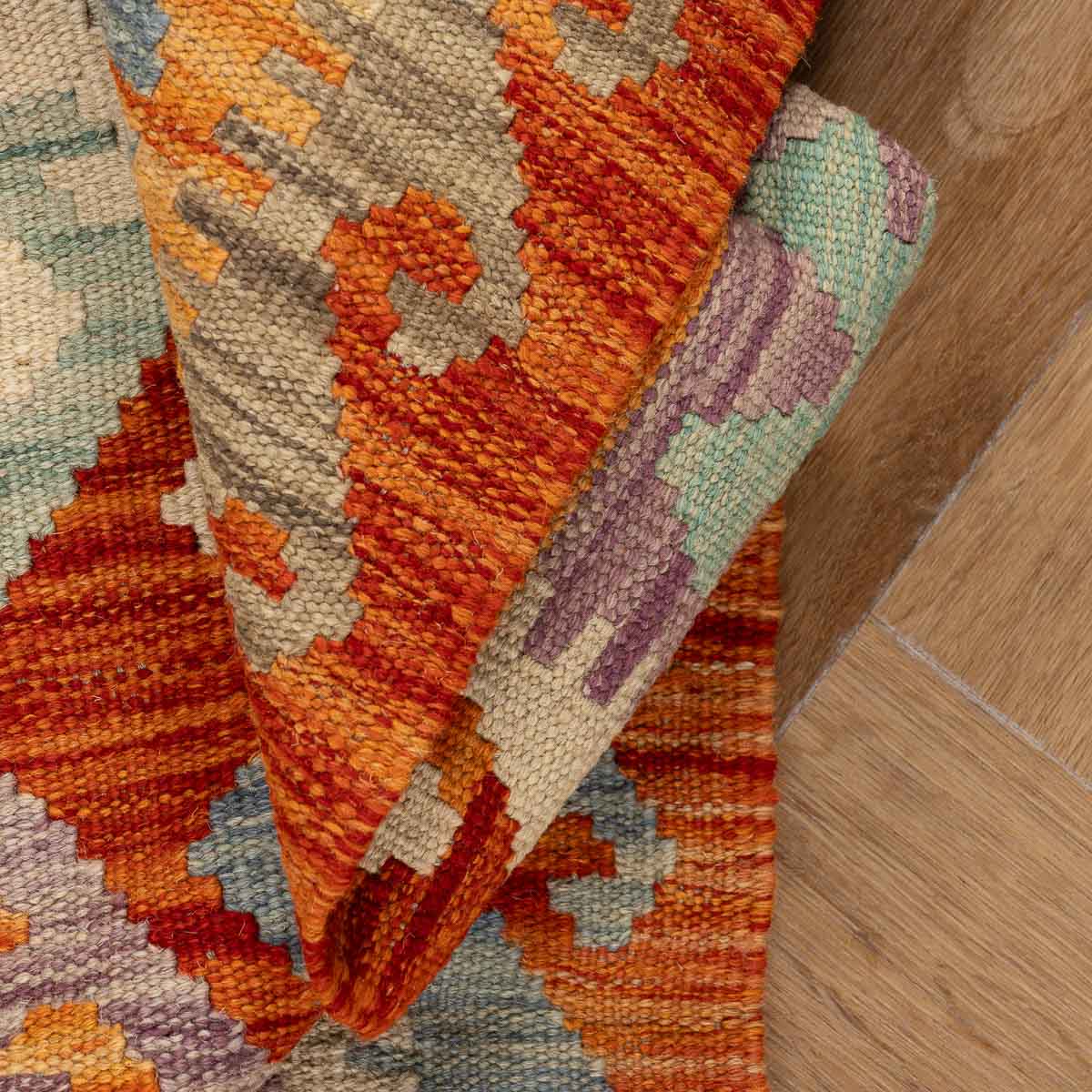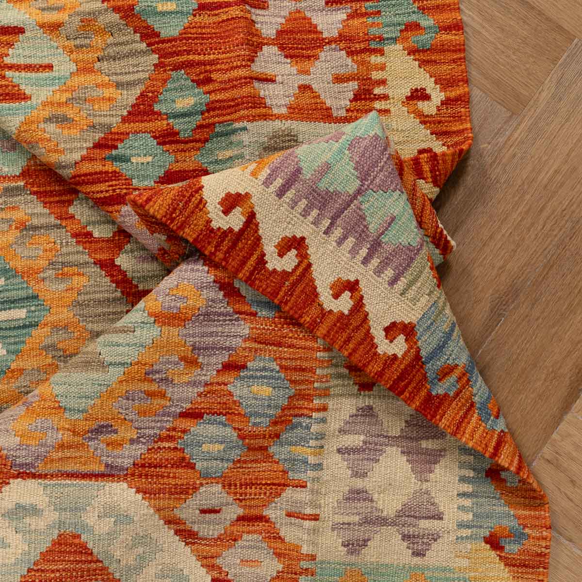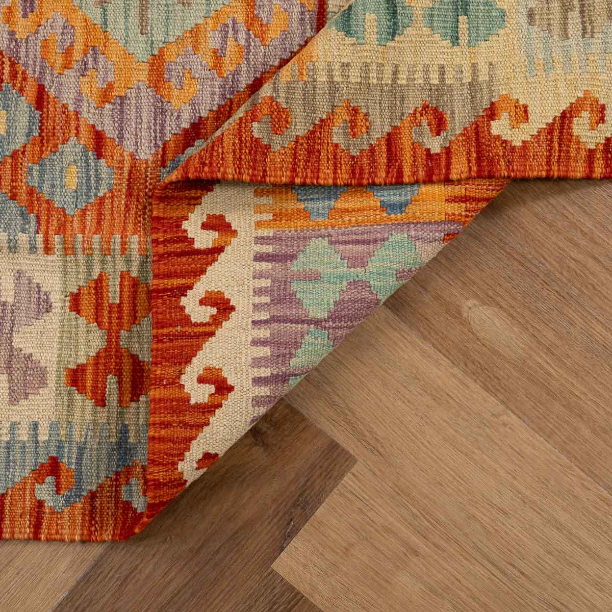 שטיח קילים אפגני בעבודת יד מצמר טבעי, פריט ייחודי עם נוכחות חזקה ואופי אותנטי. נבחר בקפידה ומביא איתו צבע, עומק וסיפור.