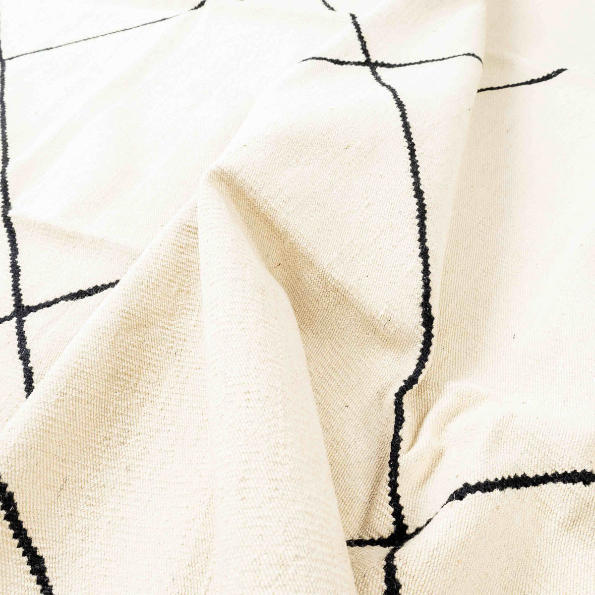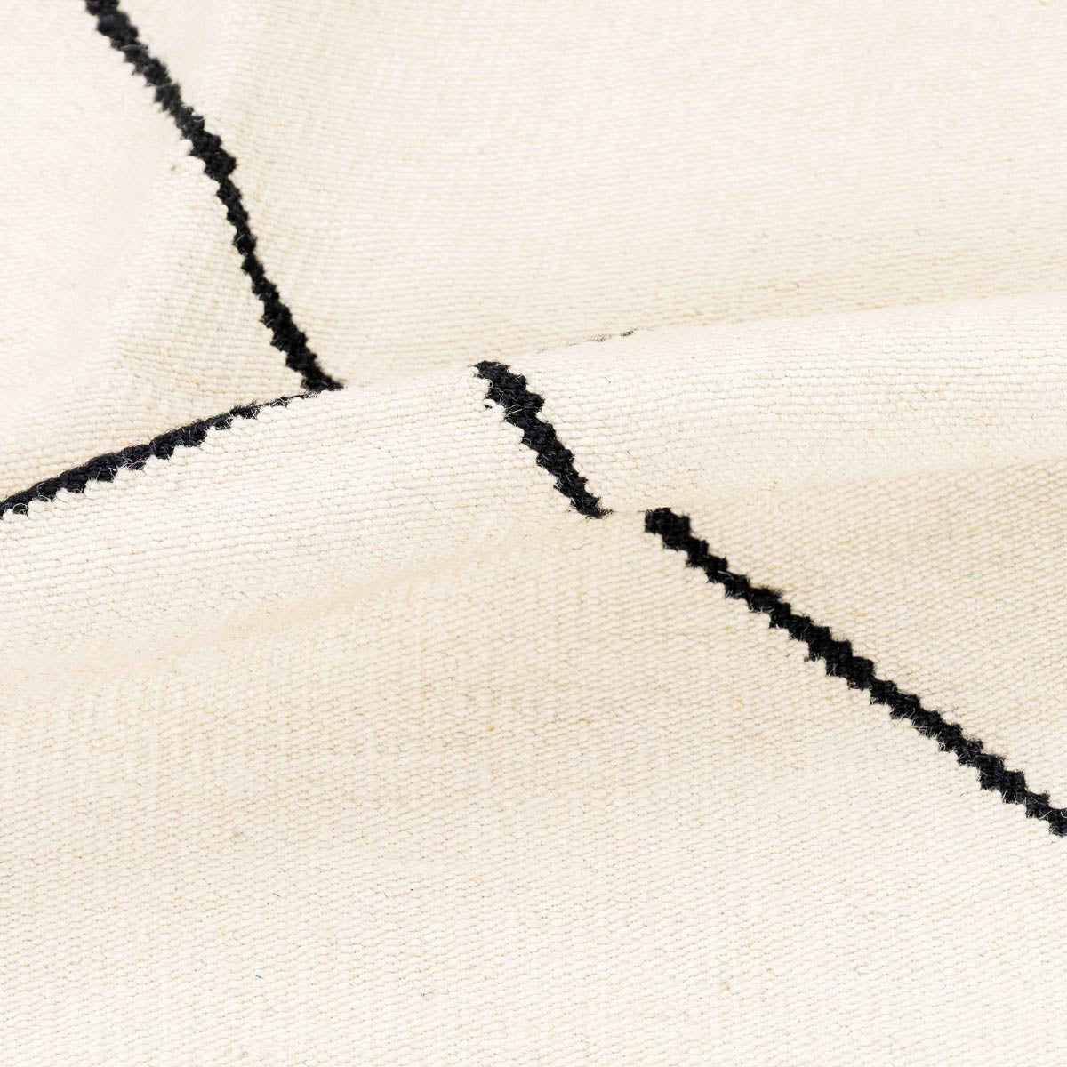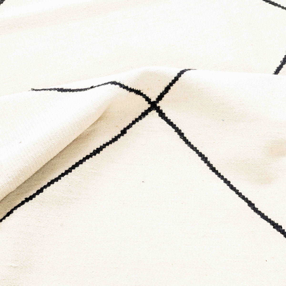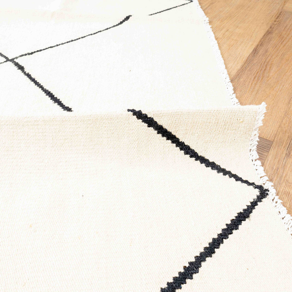 השטיח שזור באריגה שטוחה בגוון קרם אחיד, ועליו קווים דקים בשחור שיוצרים דוגמת יהלומים גדולה ומאווררת. הסגנון מינימליסטי אך לא ריק, כזה שמוסיף עניין בלי להעמיס.