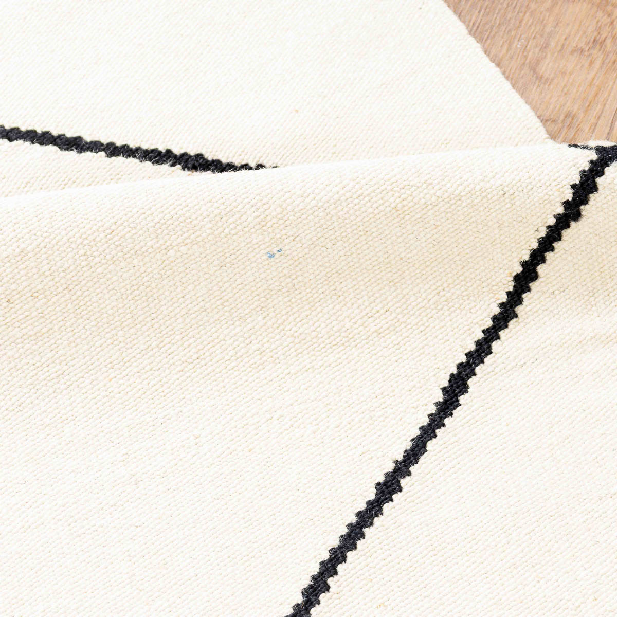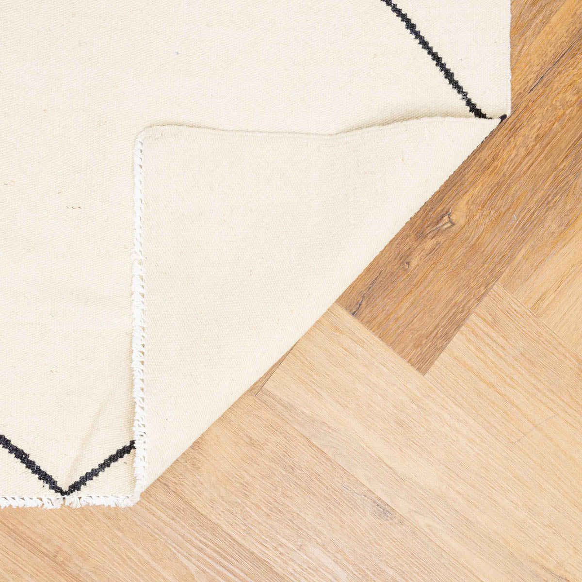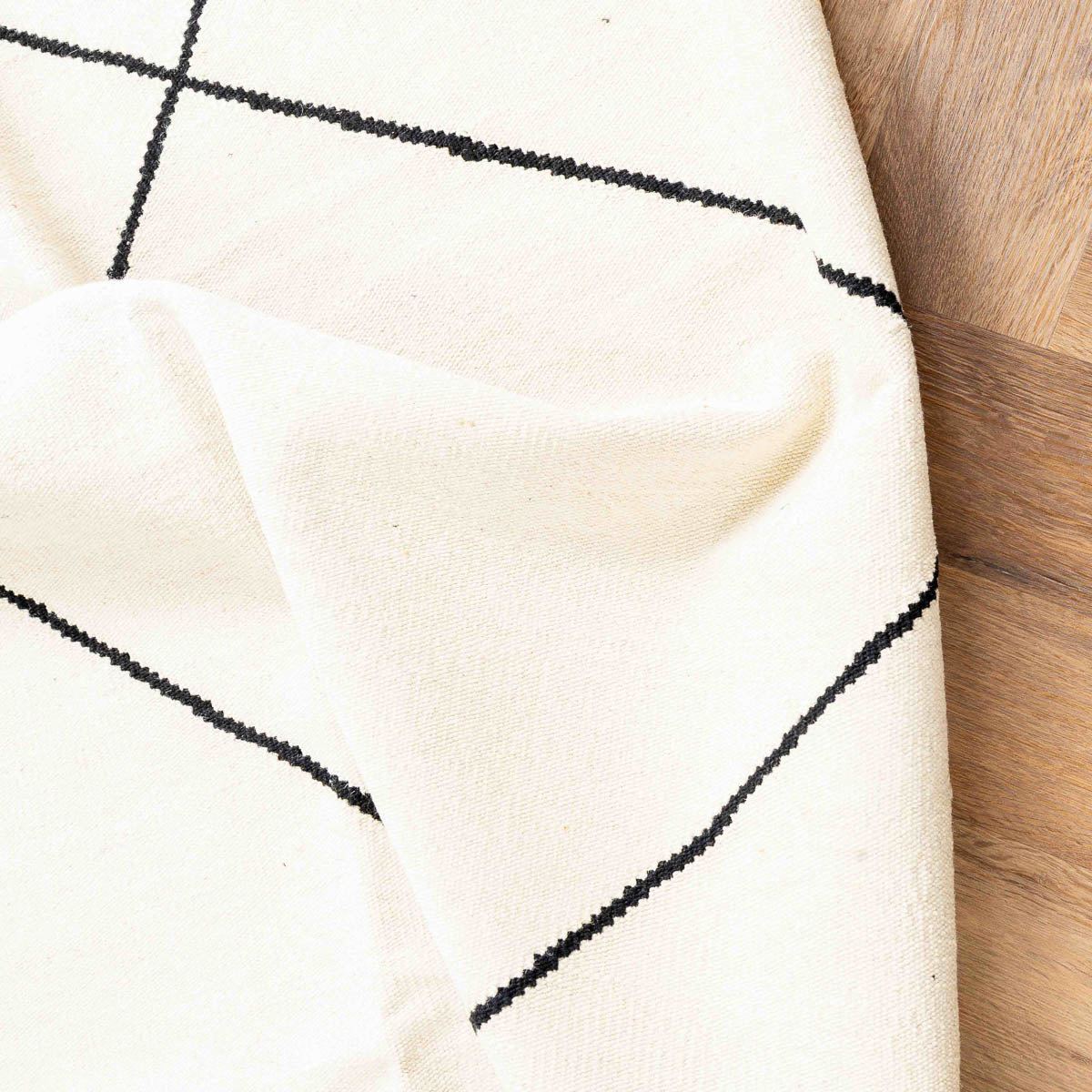 השטיח שזור באריגה שטוחה בגוון קרם אחיד, ועליו קווים דקים בשחור שיוצרים דוגמת יהלומים גדולה ומאווררת. הסגנון מינימליסטי אך לא ריק, כזה שמוסיף עניין בלי להעמיס.