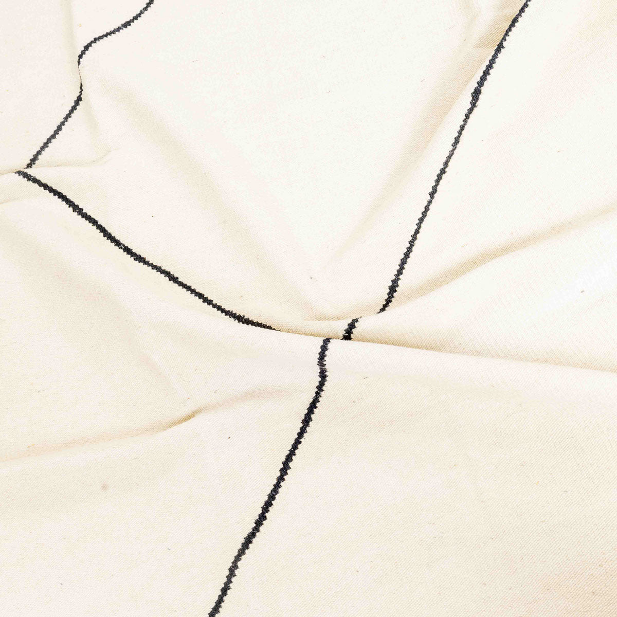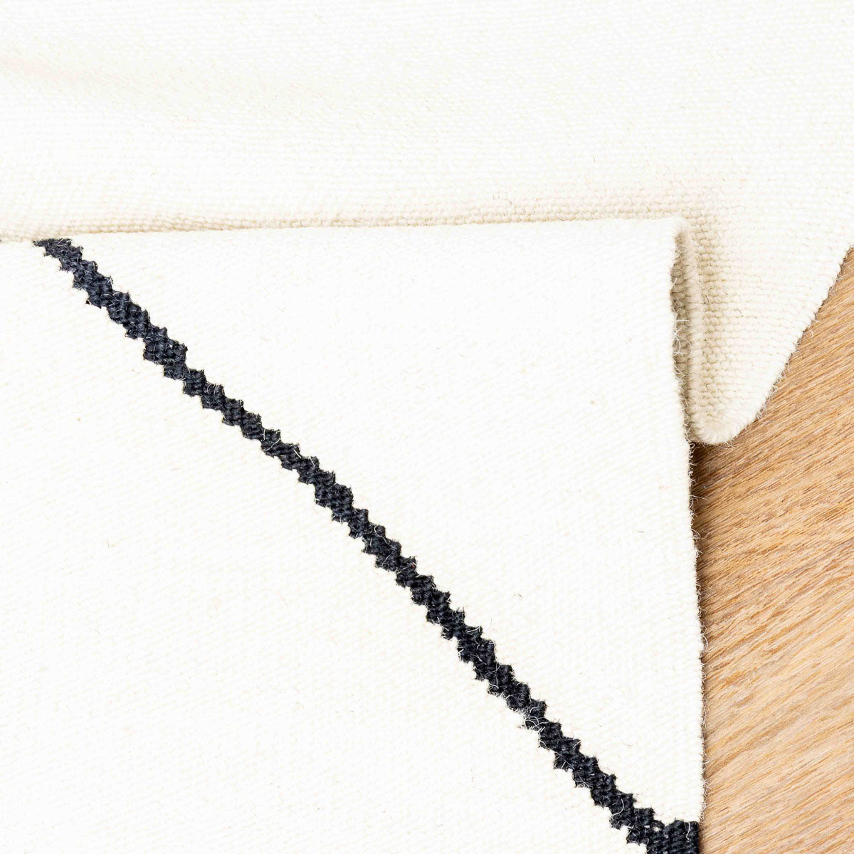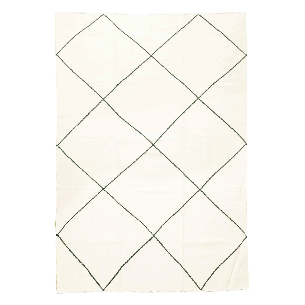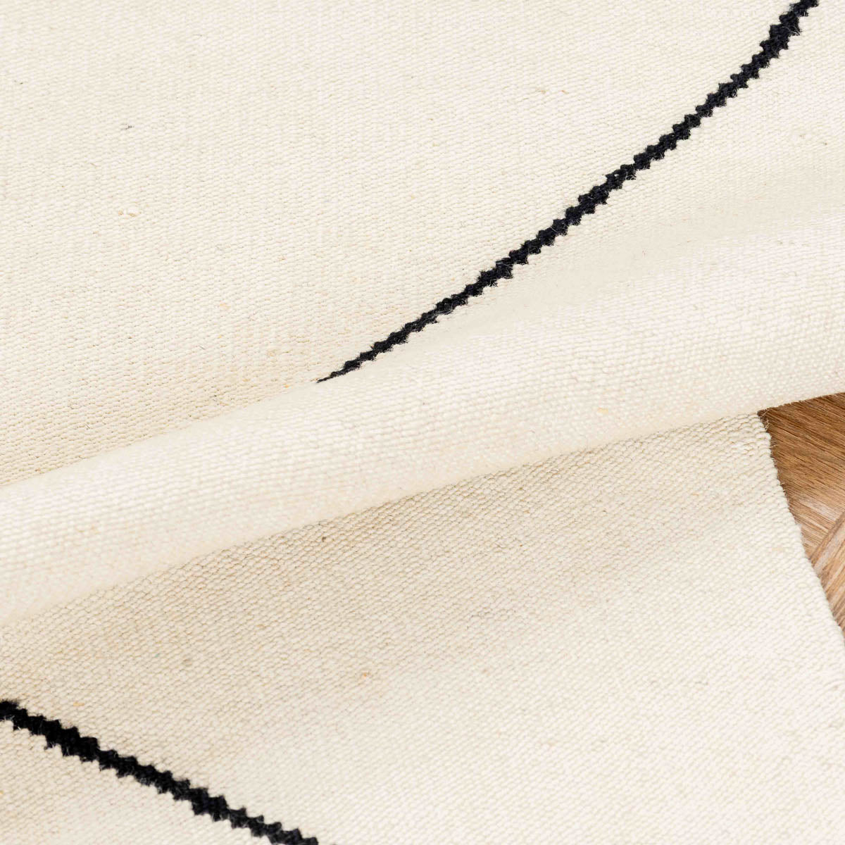 השטיח שזור באריגה שטוחה בגוון קרם אחיד, ועליו קווים דקים בשחור שיוצרים דוגמת יהלומים גדולה ומאווררת. הסגנון מינימליסטי אך לא ריק, כזה שמוסיף עניין בלי להעמיס.
