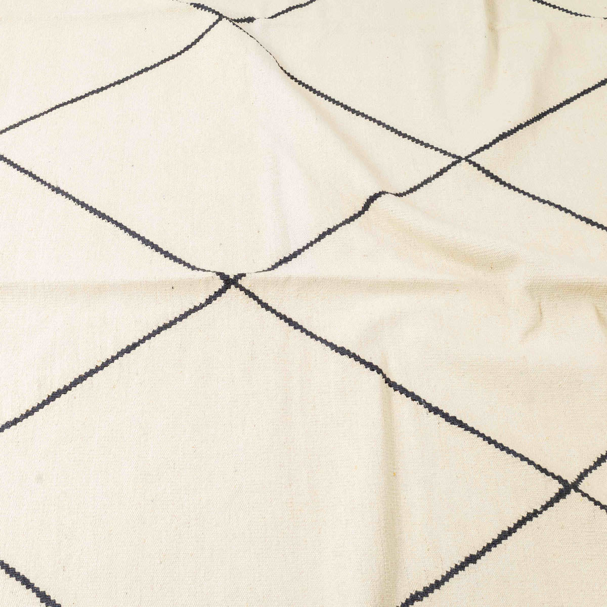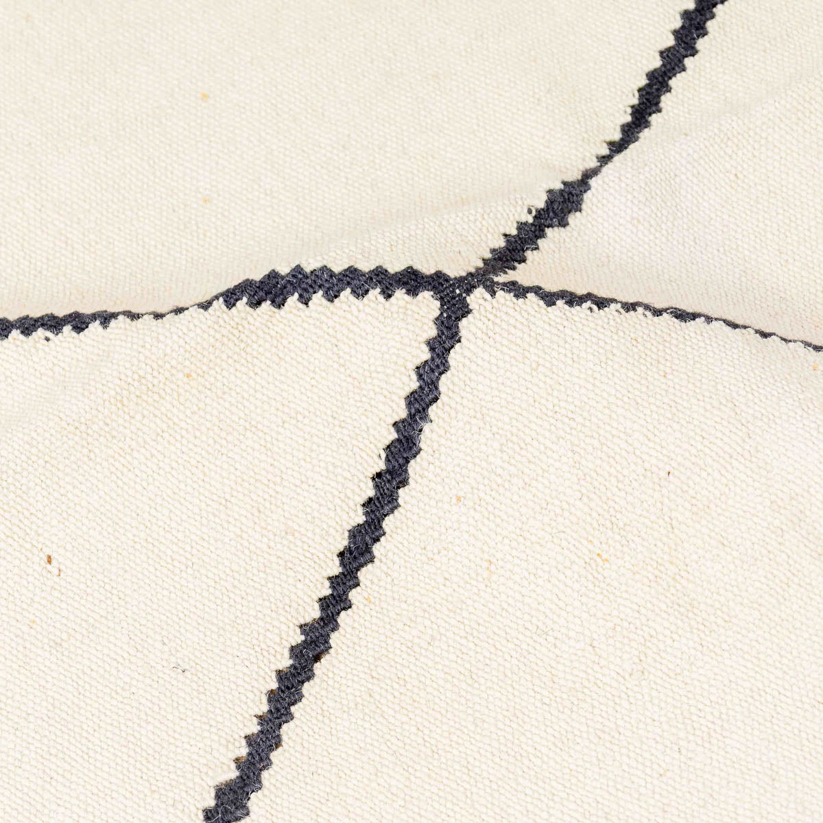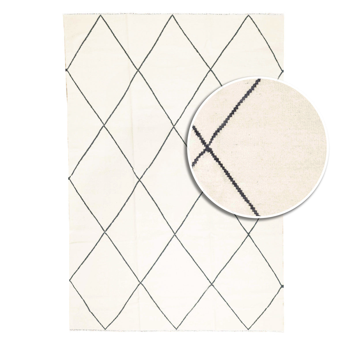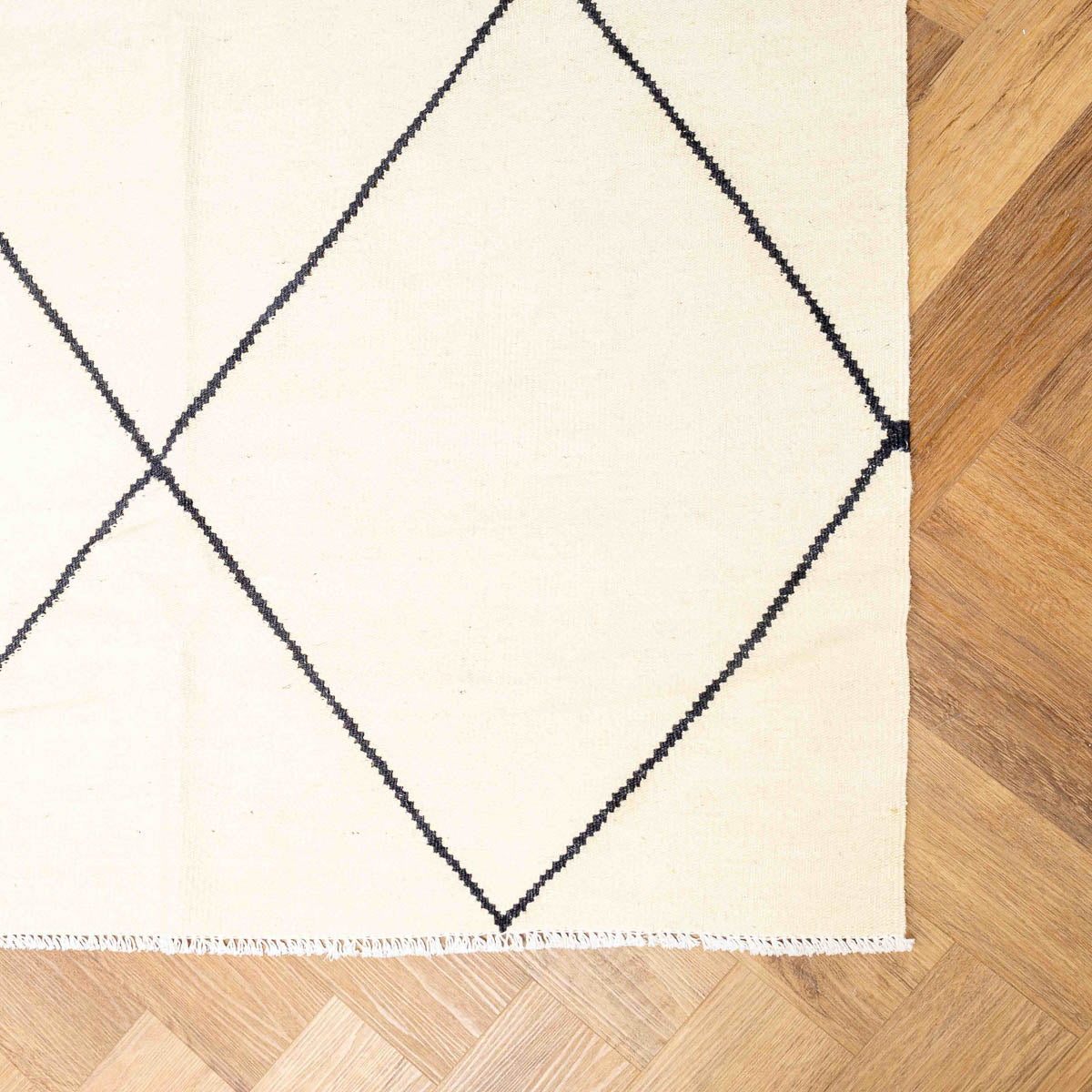 השטיח עשוי אריגה שטוחה בגוון קרם בהיר, ועליו דוגמת יהלומים גדולה ועדינה בקווים שחורים דקים. המראה המינימליסטי יוצר תחושת מרחב וקלילות, ומתאים במיוחד לחללים מודרניים, סקנדינביים ובוהו נקי.