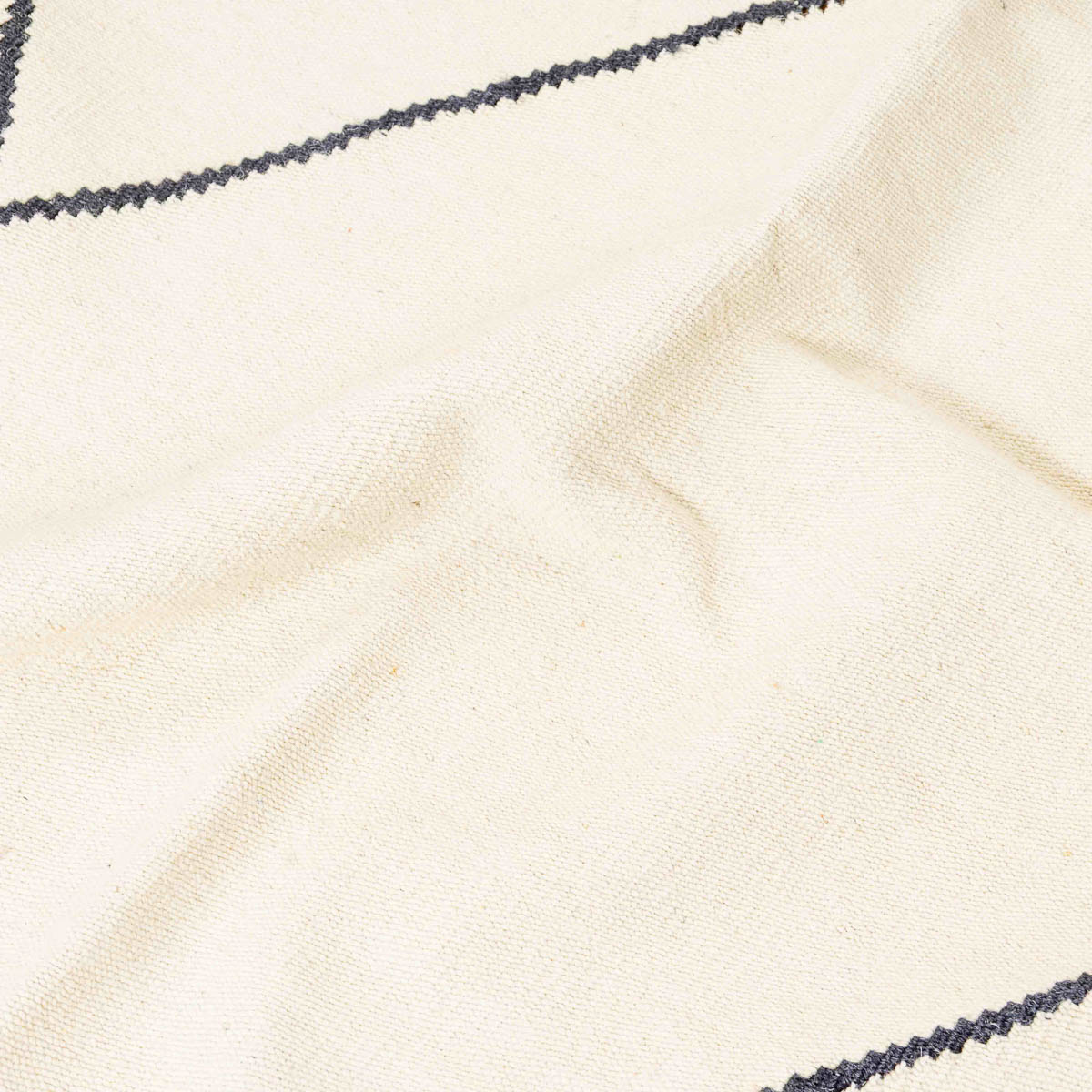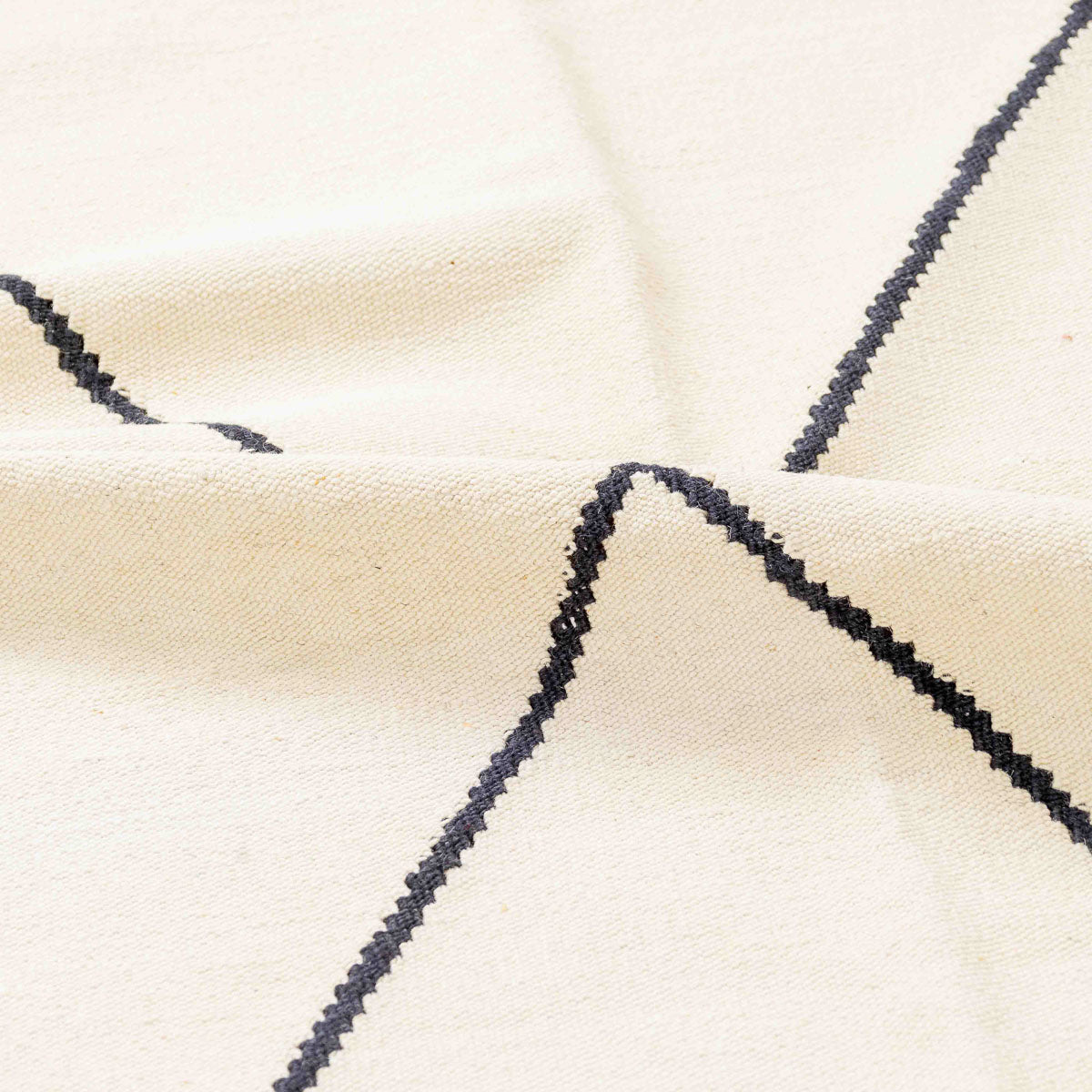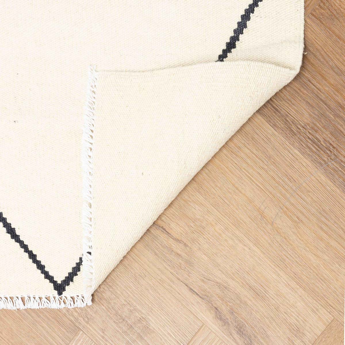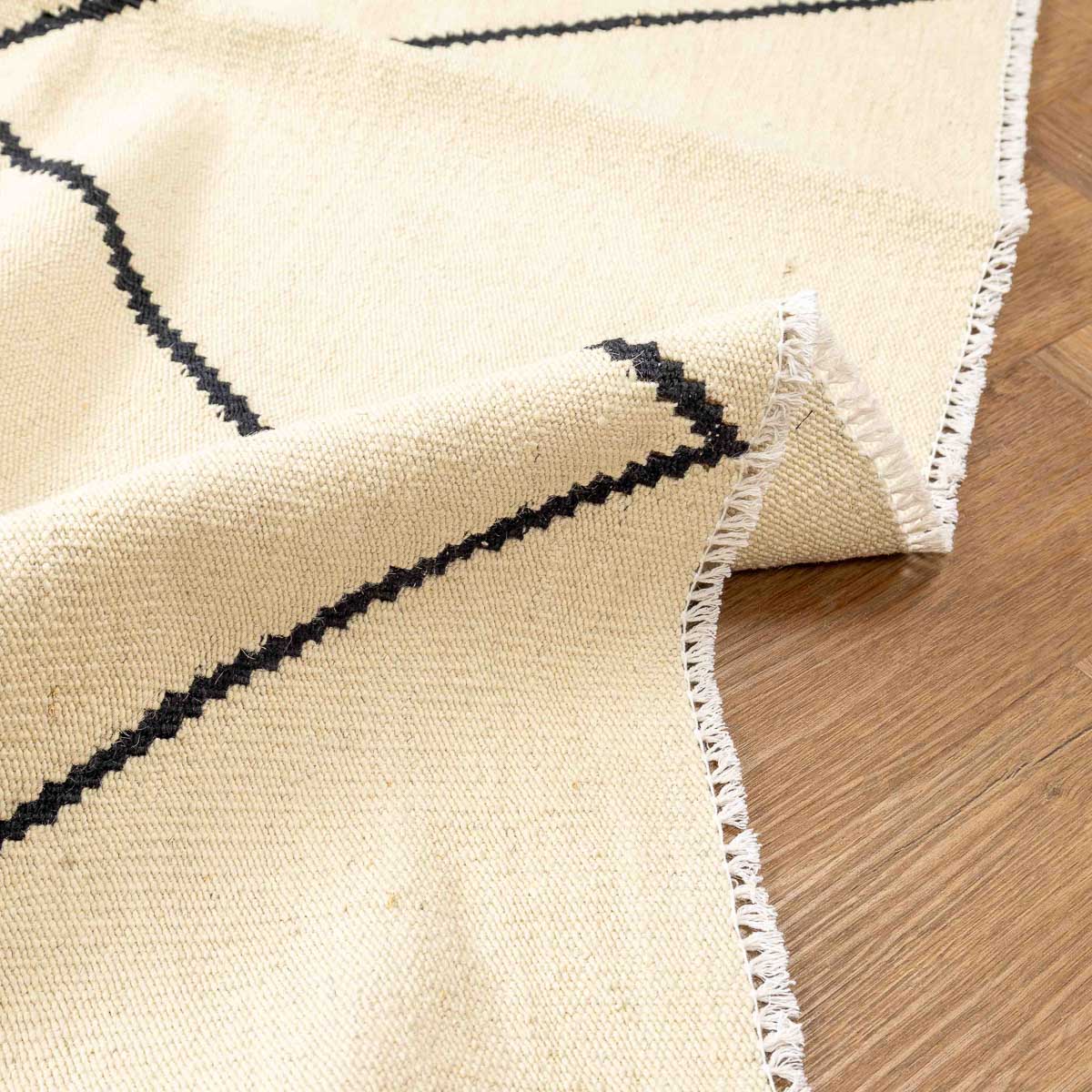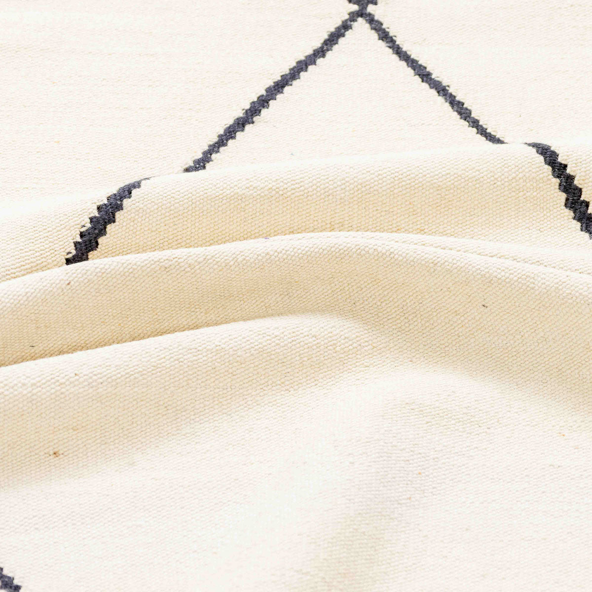 השטיח עשוי אריגה שטוחה בגוון קרם בהיר, ועליו דוגמת יהלומים גדולה ועדינה בקווים שחורים דקים. המראה המינימליסטי יוצר תחושת מרחב וקלילות, ומתאים במיוחד לחללים מודרניים, סקנדינביים ובוהו נקי.