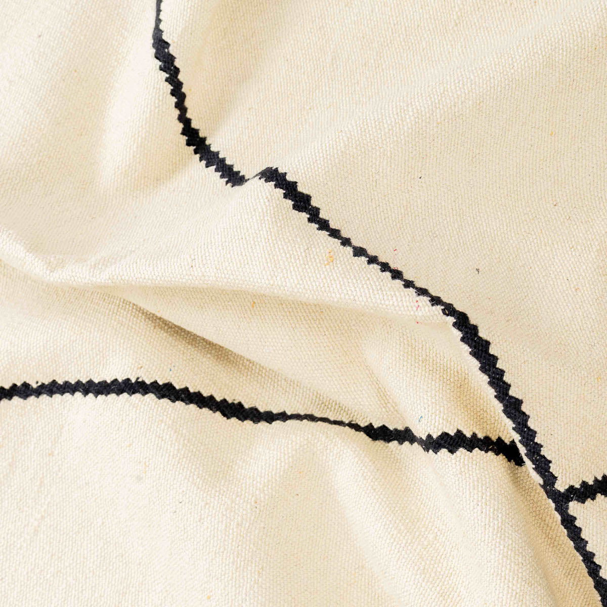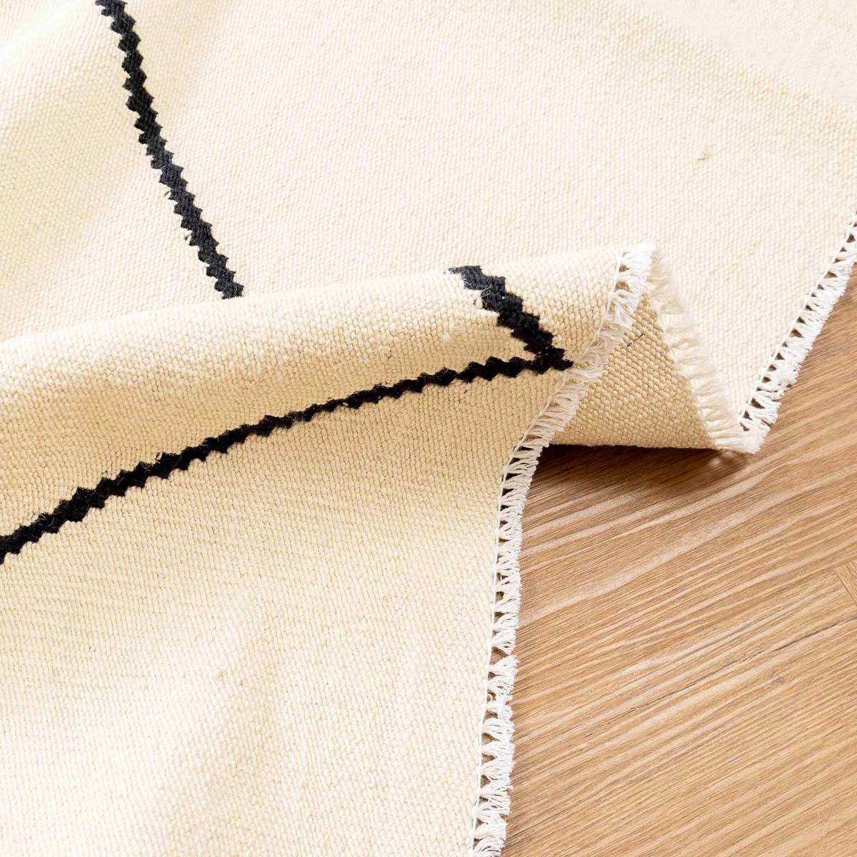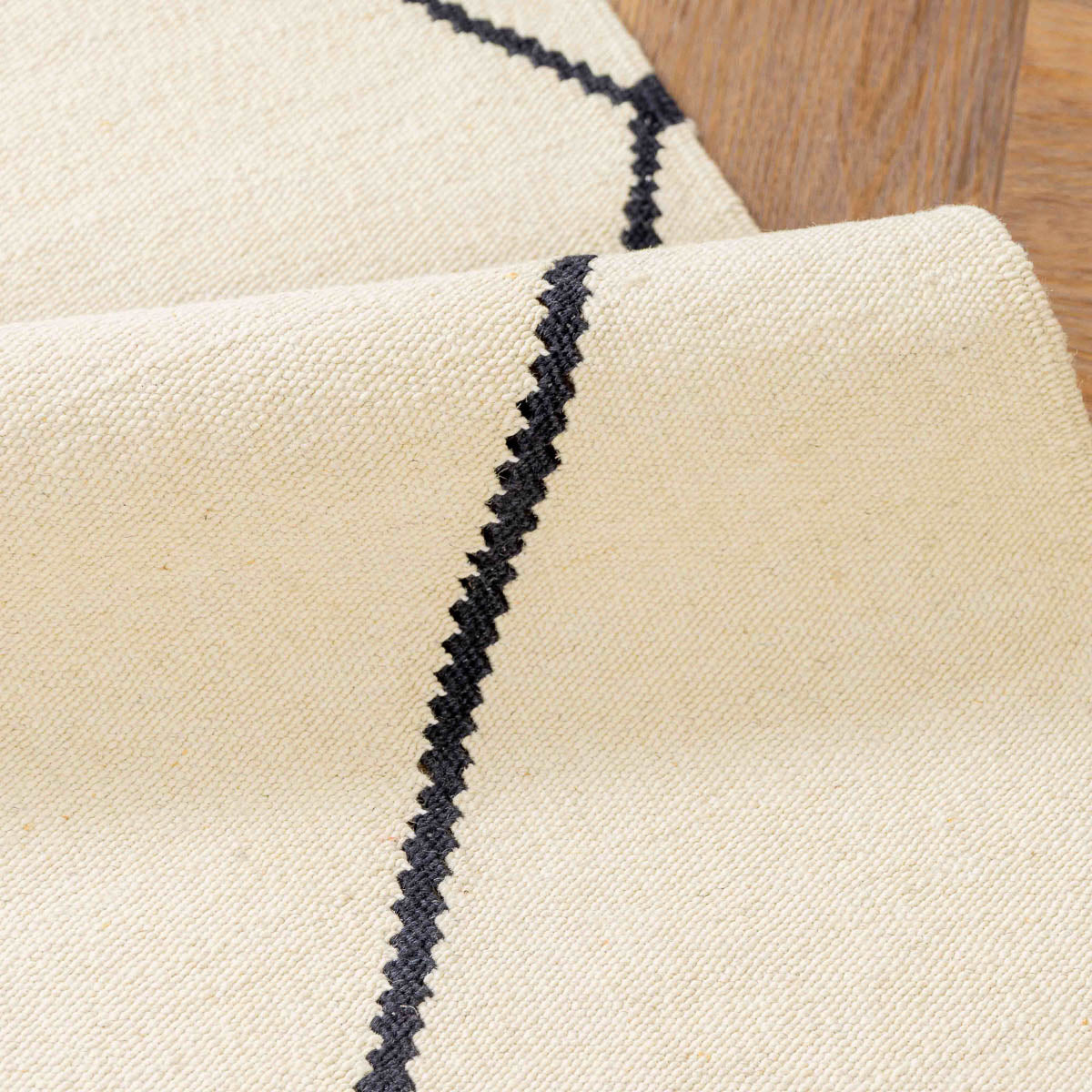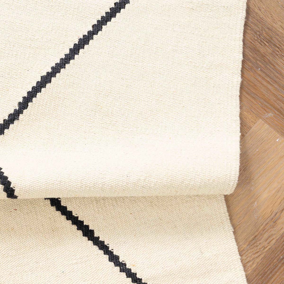 השטיח עשוי אריגה שטוחה בגוון קרם בהיר, ועליו דוגמת יהלומים גדולה ועדינה בקווים שחורים דקים. המראה המינימליסטי יוצר תחושת מרחב וקלילות, ומתאים במיוחד לחללים מודרניים, סקנדינביים ובוהו נקי.