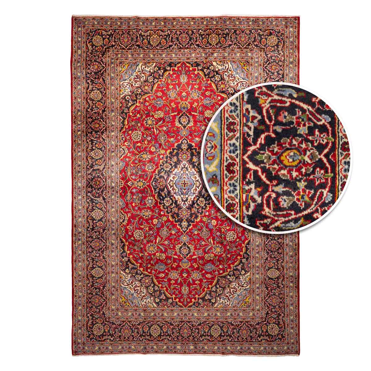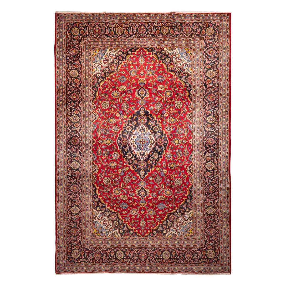תיאור המוצר: שטיח הקשאן 00 הוא אחד הדגמים המזוהים ביותר עם אמנות השטיחים הפרסית. הוא מתאפיין בשדה מרכזי בצבע אדום עמוק (אדום-יין), המעוטר במדליון מרכזי דומיננטי ובעיטורי פרחים וערבסקות צפופים. הניגודיות המרהיבה בין הרקע האדום החם לבין המסגרות בגווני כחול נייבי וקרם מעניקה לשטיח מראה יוקרתי ומכובד. כל קשר בשטיח נארג ידנית על ידי אומנים מיומנים, מה שהופך כל פריט ליחיד במינו.