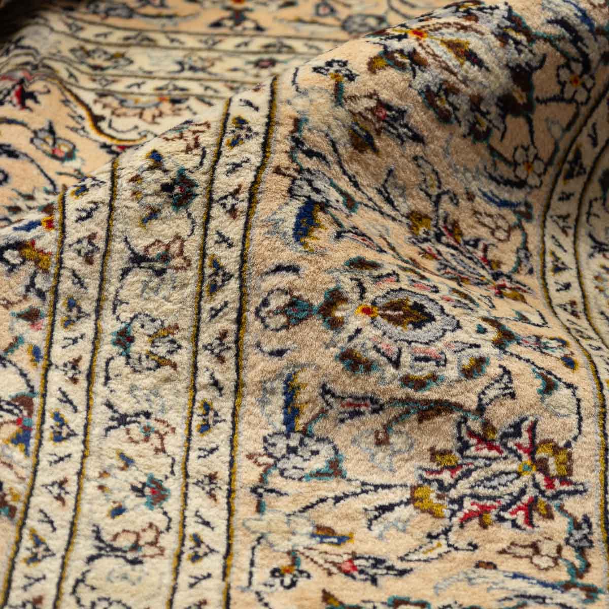 שטיח קשאן (Kashan) פרסי עבודת יד – יוקרה מוארת בבז'שורת מחץ: אצילות פרסית שנארגה ביד – שטיח צמר טהור בעיצוב מדליון מלכותי, המכניס אור, חמימות וסטטוס ללב הבית.