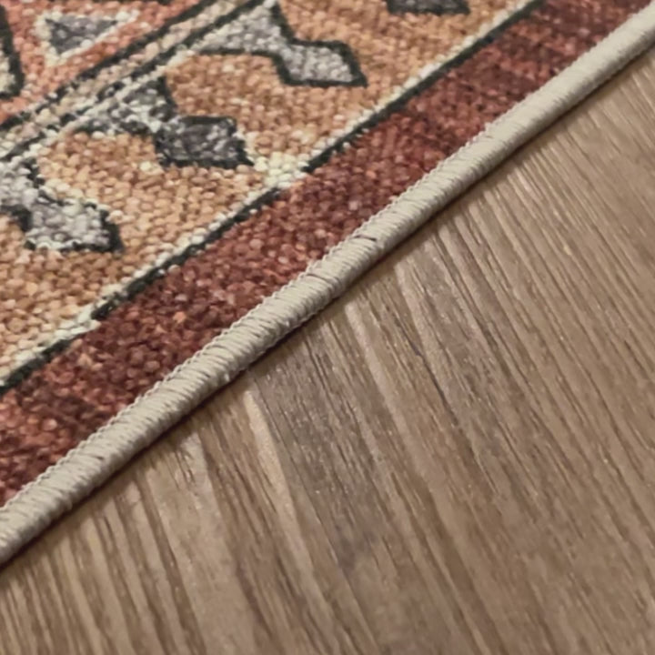 השטיח משלב גווני אדום, בז', אפור וצהוב עם דוגמה גיאומטרית קלאסית שמעניקה עומק ומראה עתיק. המרקם שטוח ונעים למגע ומתאים למראה נקי ומודרני יחד עם נגיעה מסורתית.