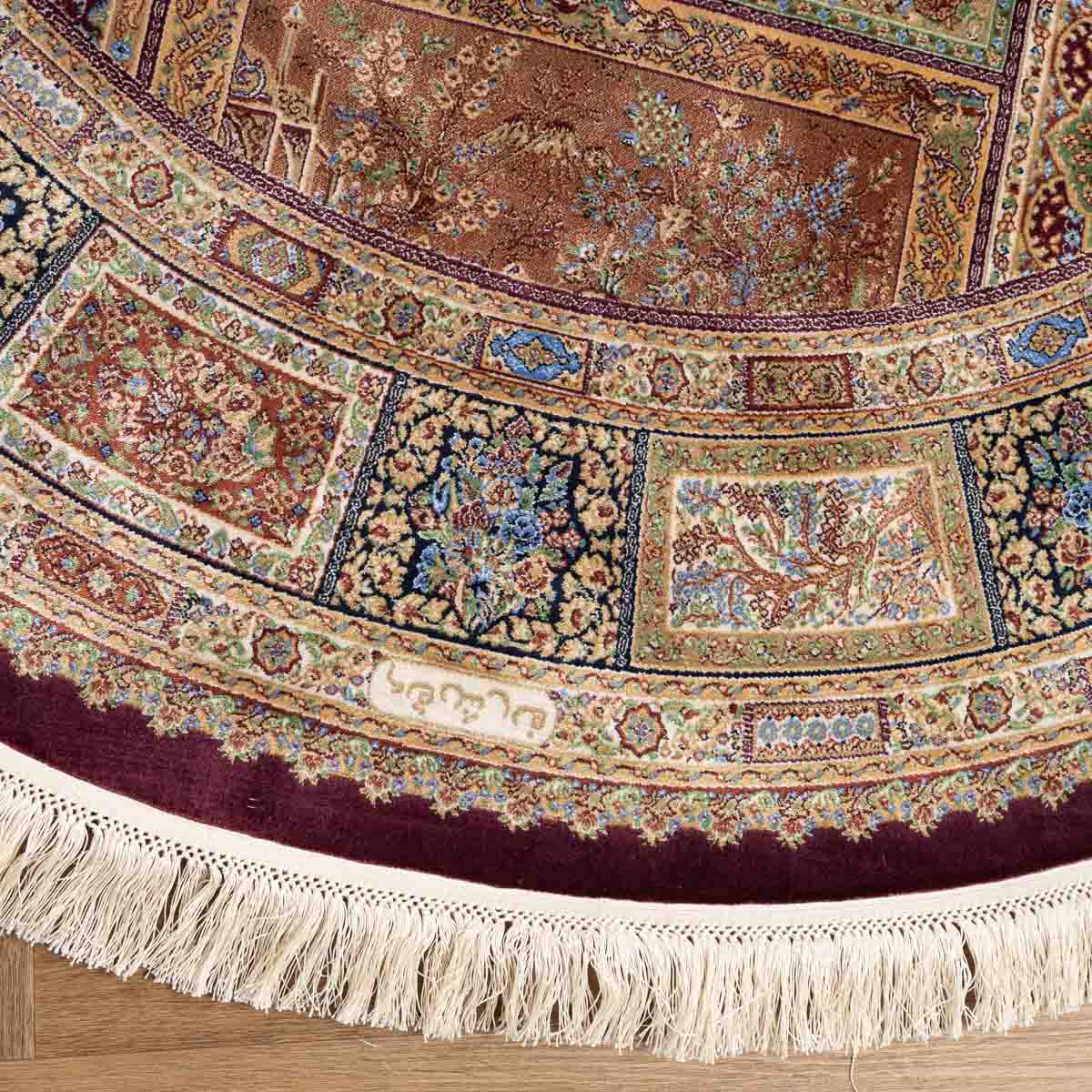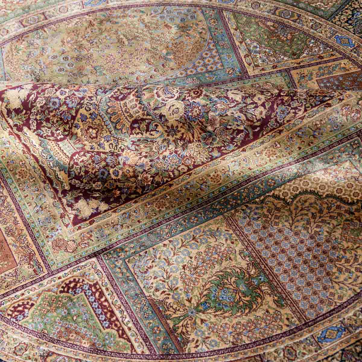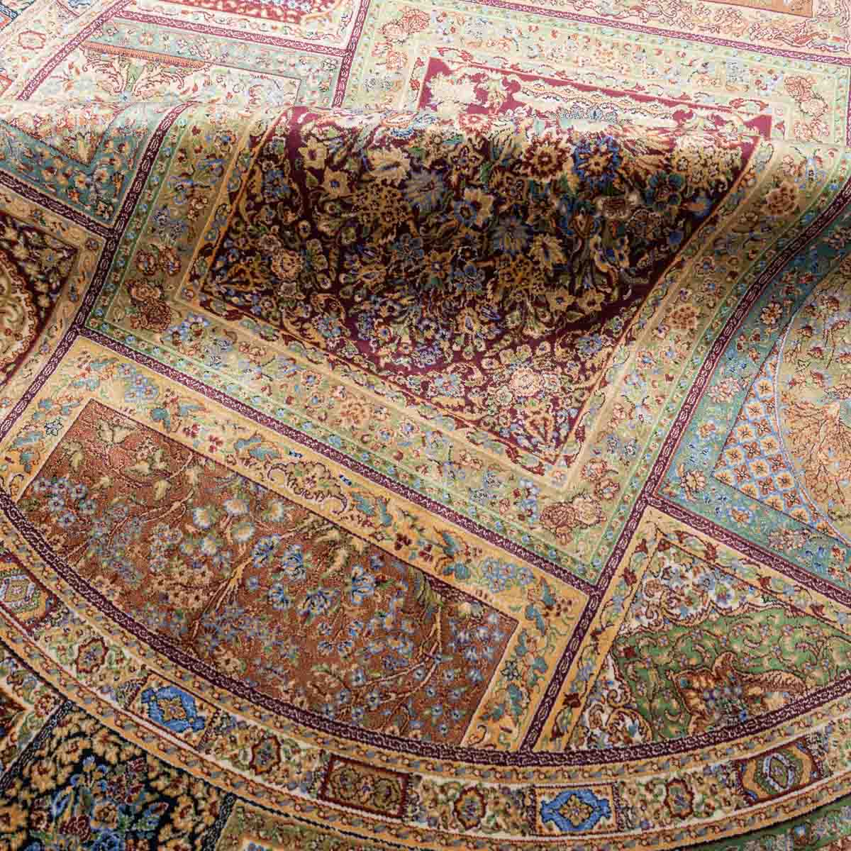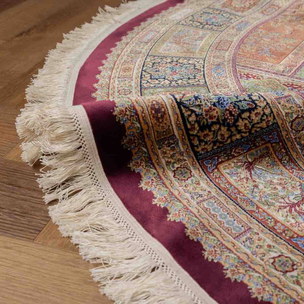 שטיח קום עגול ומרשים בסגנון קלאסי עשיר, המשלב צבעוניות מעודנת עם עבודת דוגמה מורכבת ומדויקת. פריט יוקרתי שמעניק לחלל נוכחות, עומק ותחושת פאר על-זמנית.