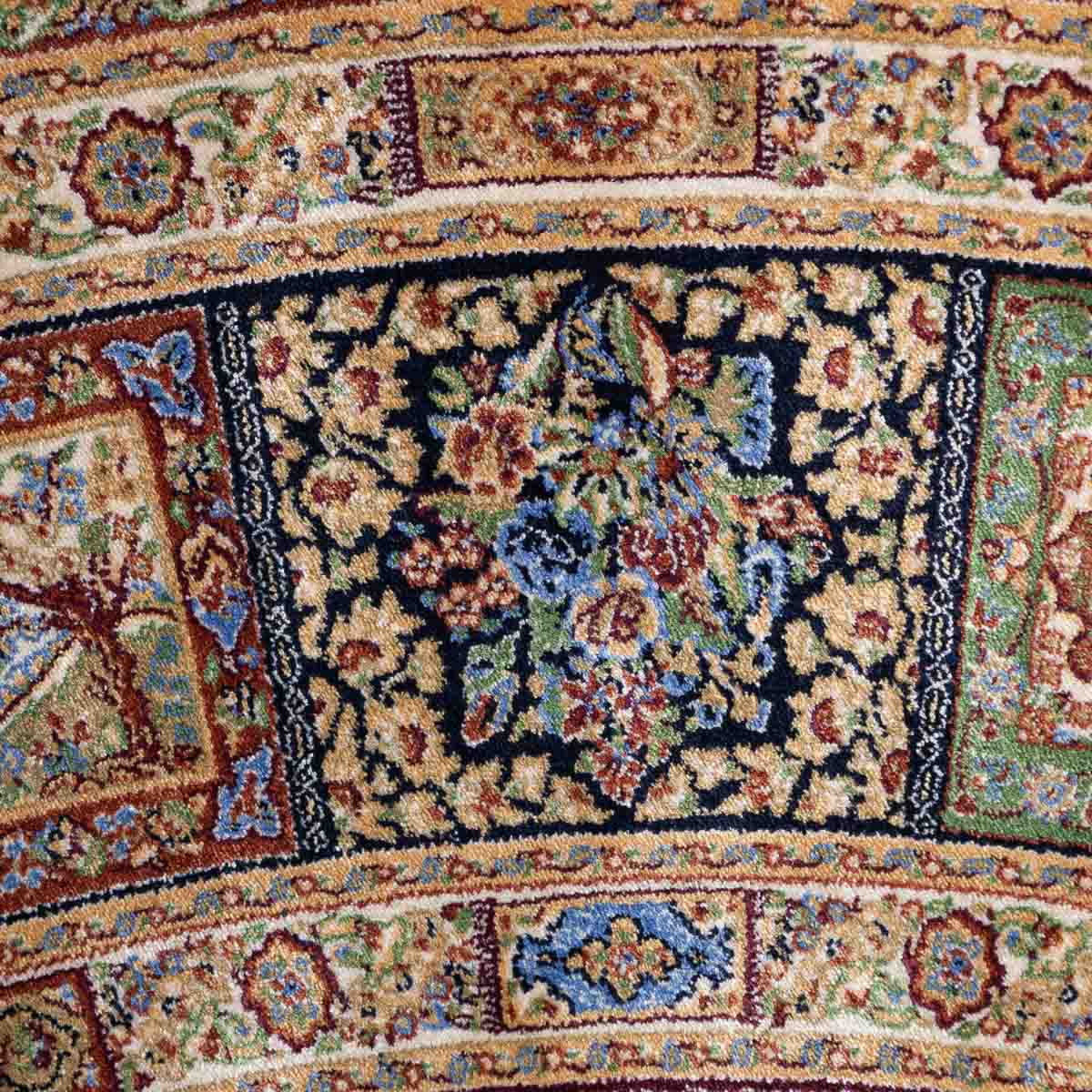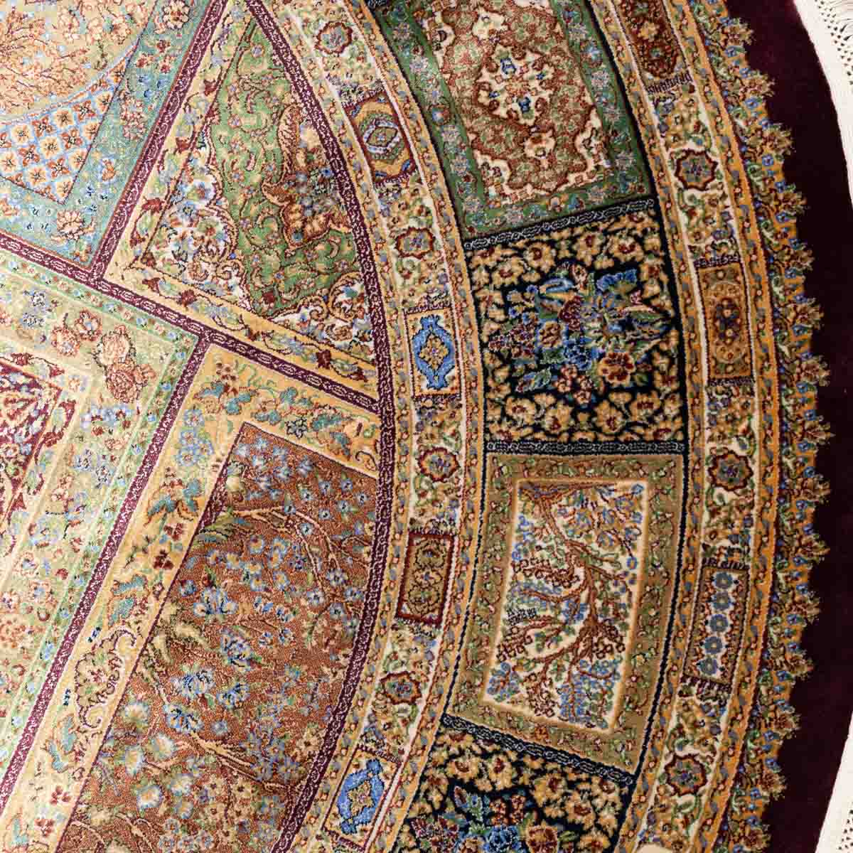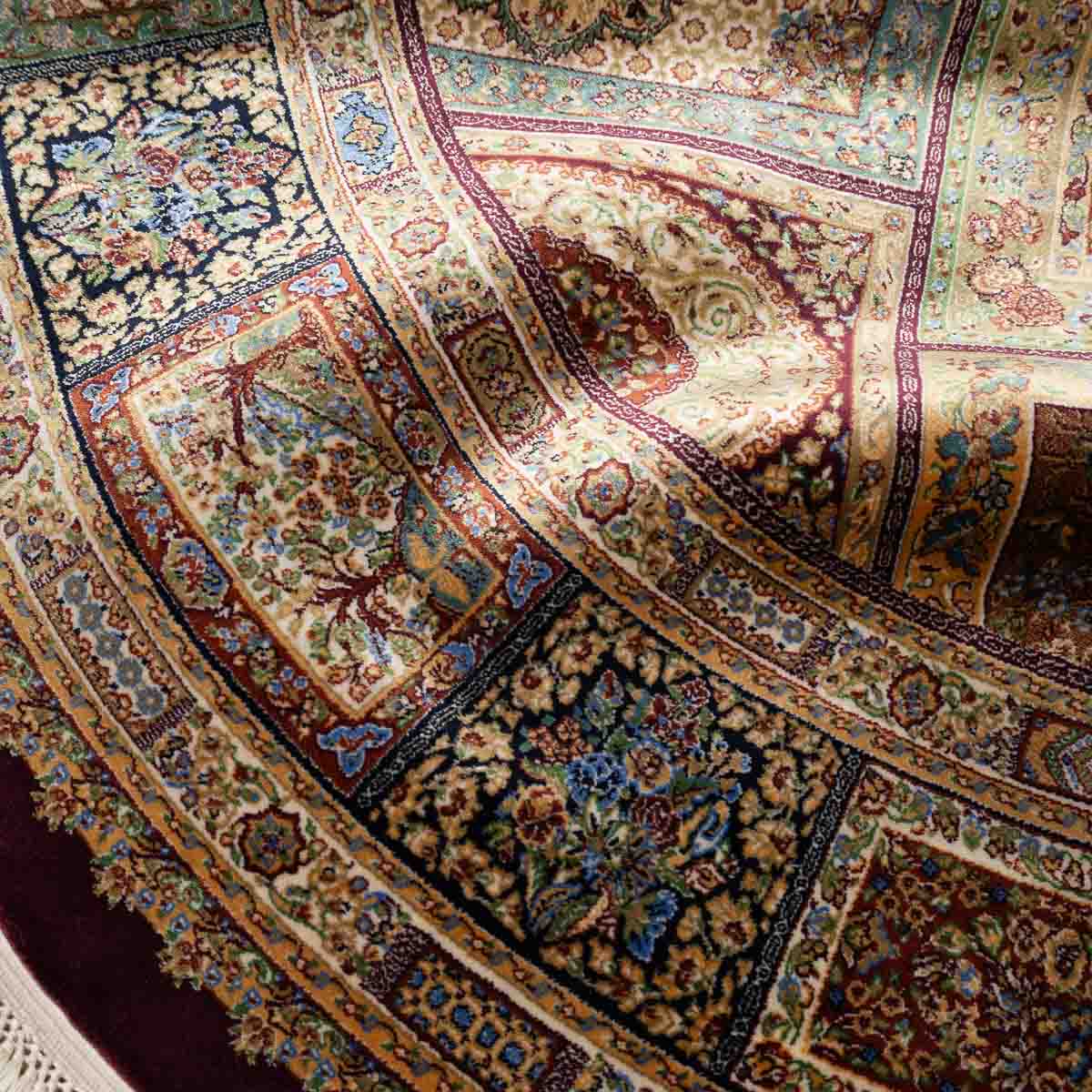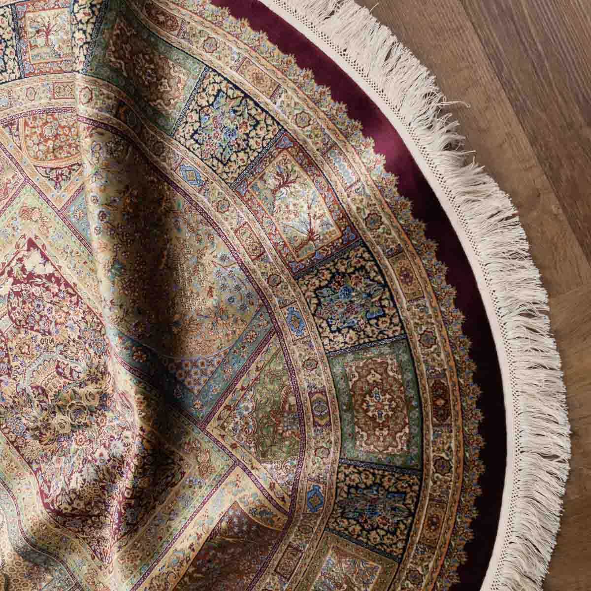 שטיח קום עגול ומרשים בסגנון קלאסי עשיר, המשלב צבעוניות מעודנת עם עבודת דוגמה מורכבת ומדויקת. פריט יוקרתי שמעניק לחלל נוכחות, עומק ותחושת פאר על-זמנית.