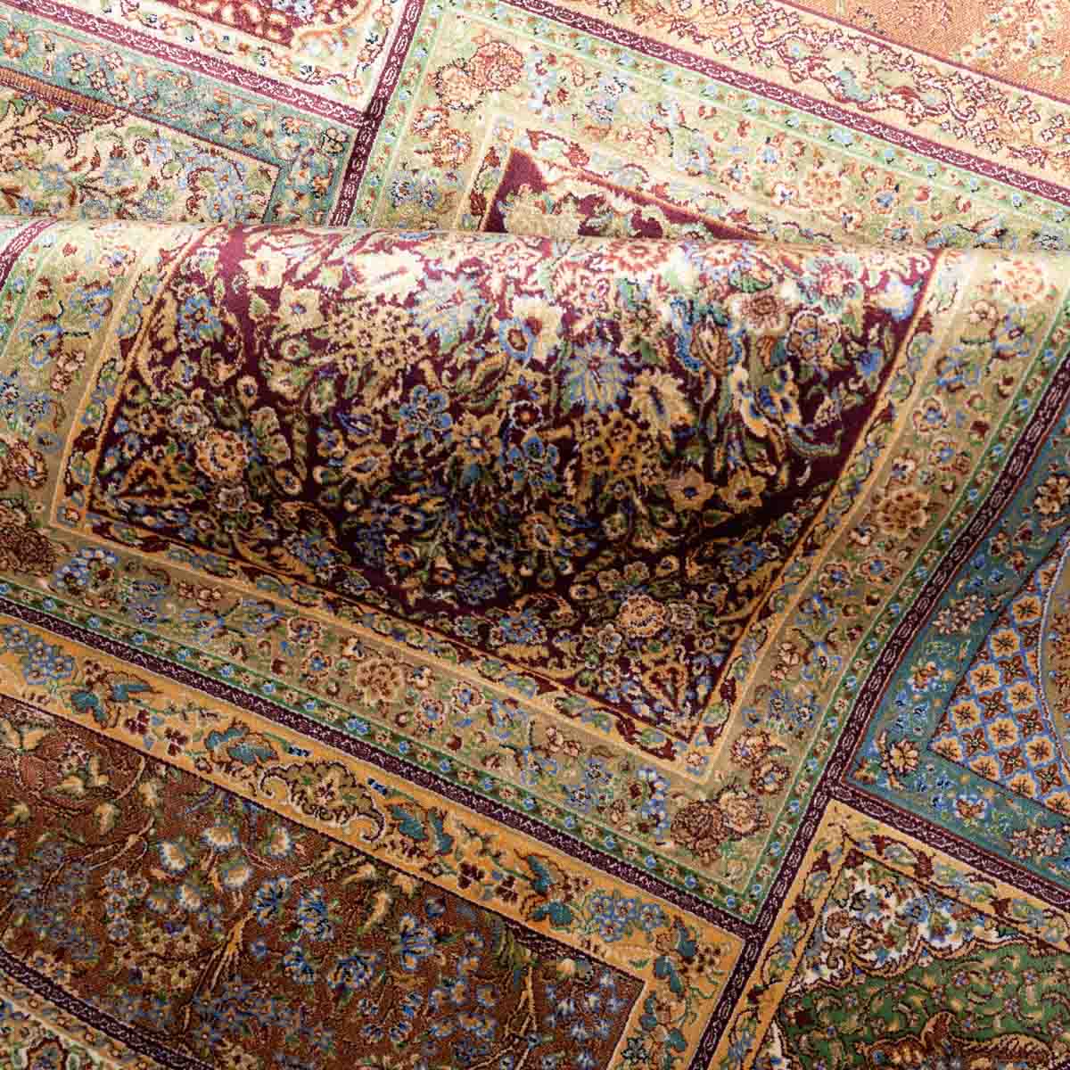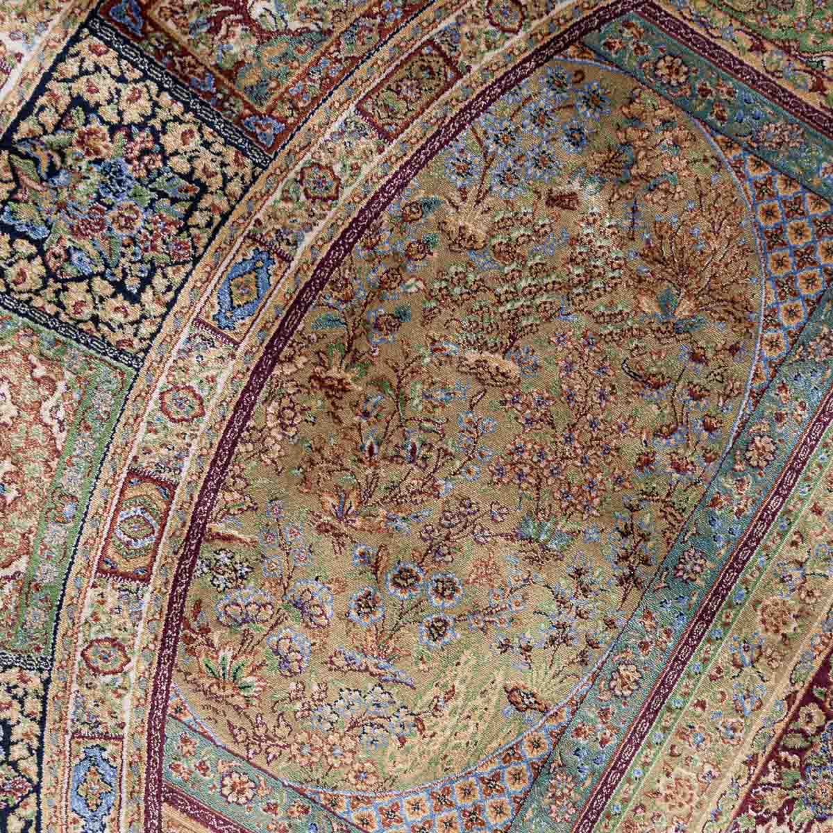 העיצוב צבעוני אך מאוזן, עם שילוב עשיר של ירוק, בורדו, בז', תכלת, שמנת ונגיעות זהב. במרכז השטיח מופיעה קומפוזיציה מורכבת ומדויקת, מוקפת טבעת דוגמאות עשירה המחולקת לפאנלים דקורטיביים, כל אחד עם מוטיב ייחודי.