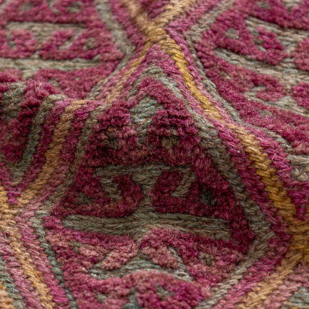 שטיח בעבודת יד בעיצוב אוזבקי מסורתי, שמשלב שתי טכניקות אריגה ויוצר מראה תלת־מימדי עשיר ומיוחד. דוגמת היהלומים המורכבת והצבעים העזים מעניקים לו נוכחות דרמטית וחום, והוא הופך כל חלל למלא אופי וסגנון.