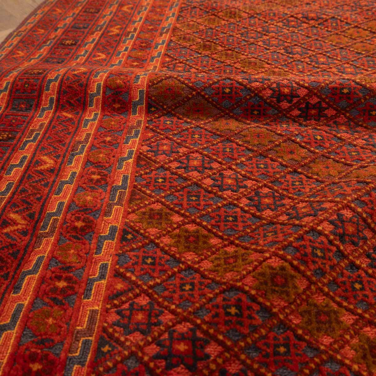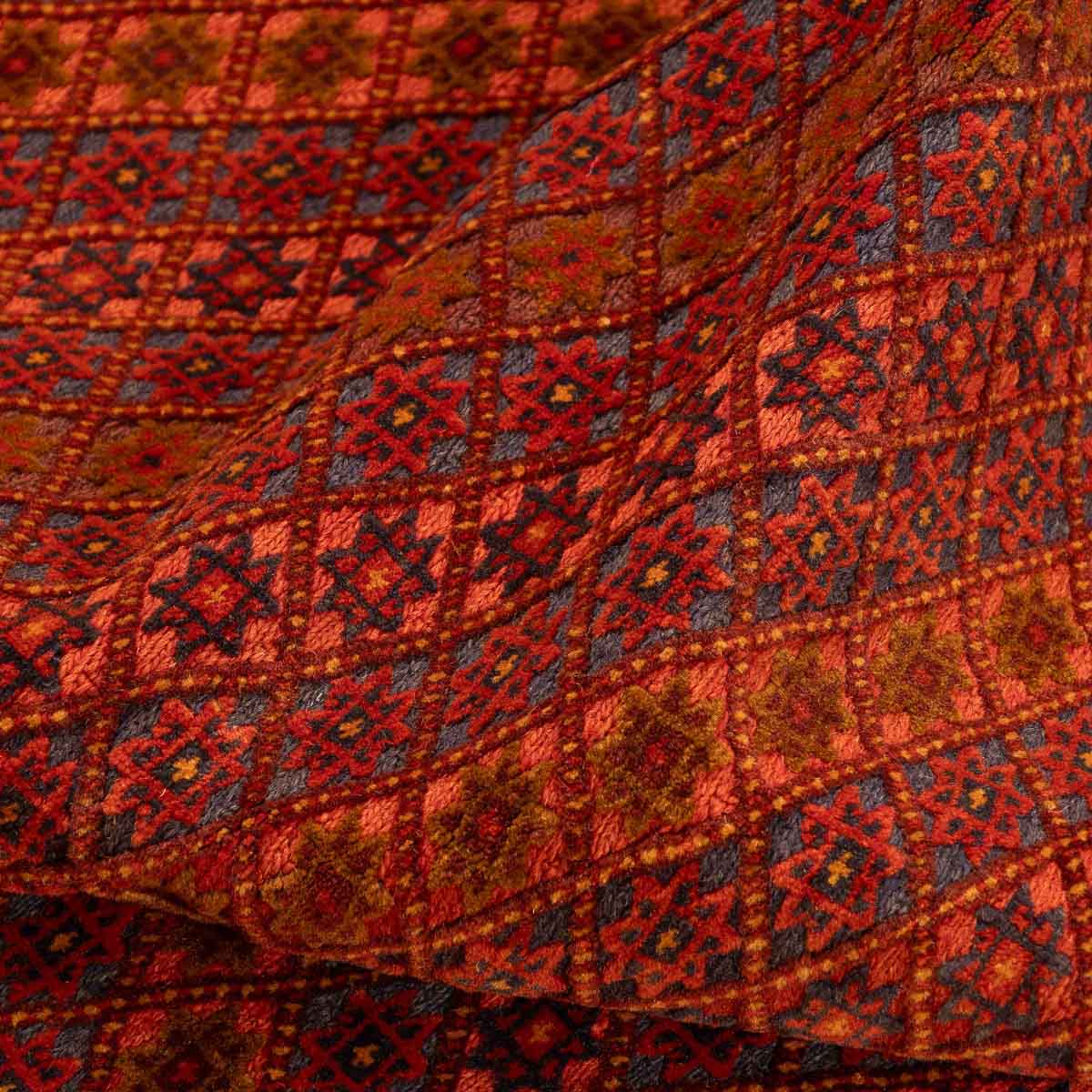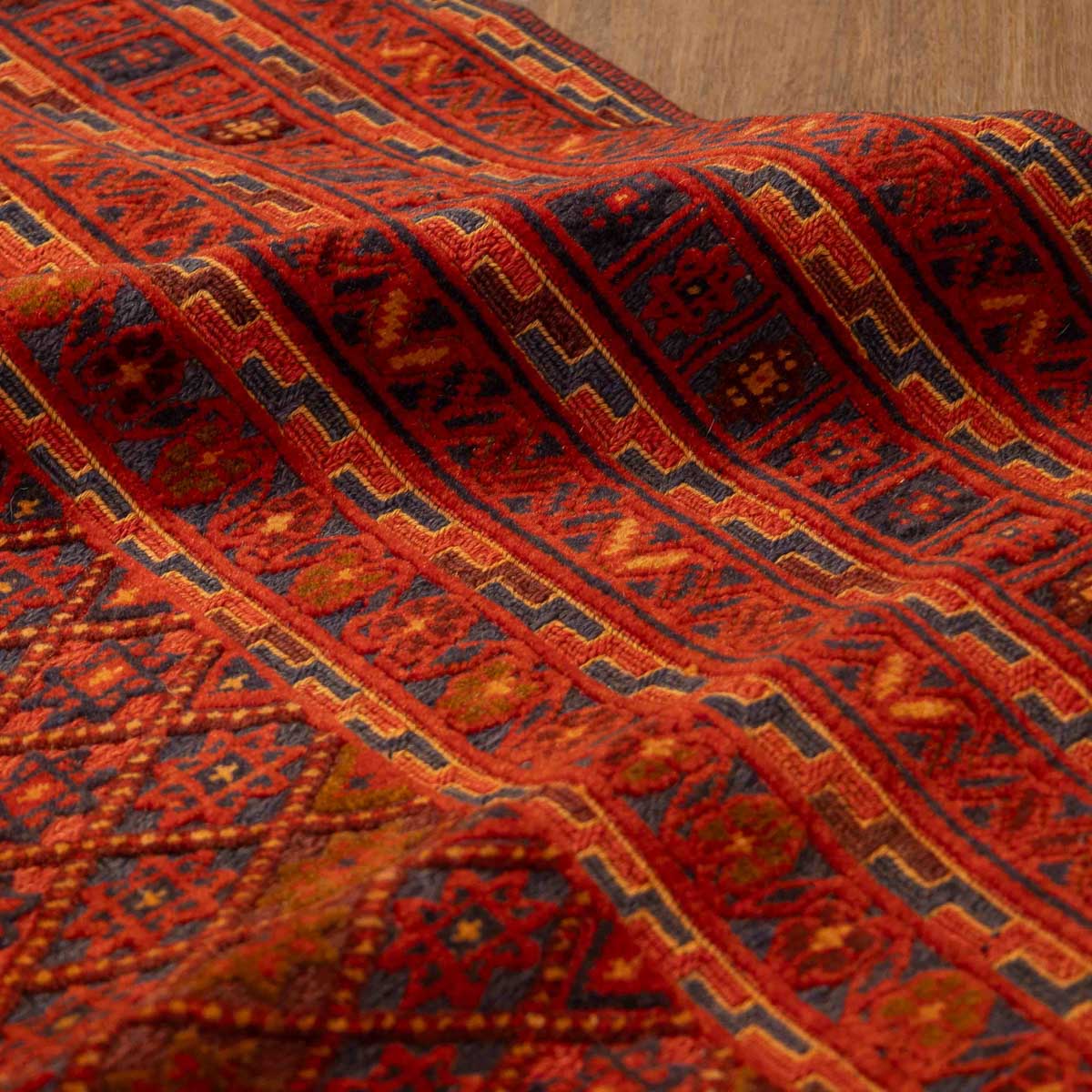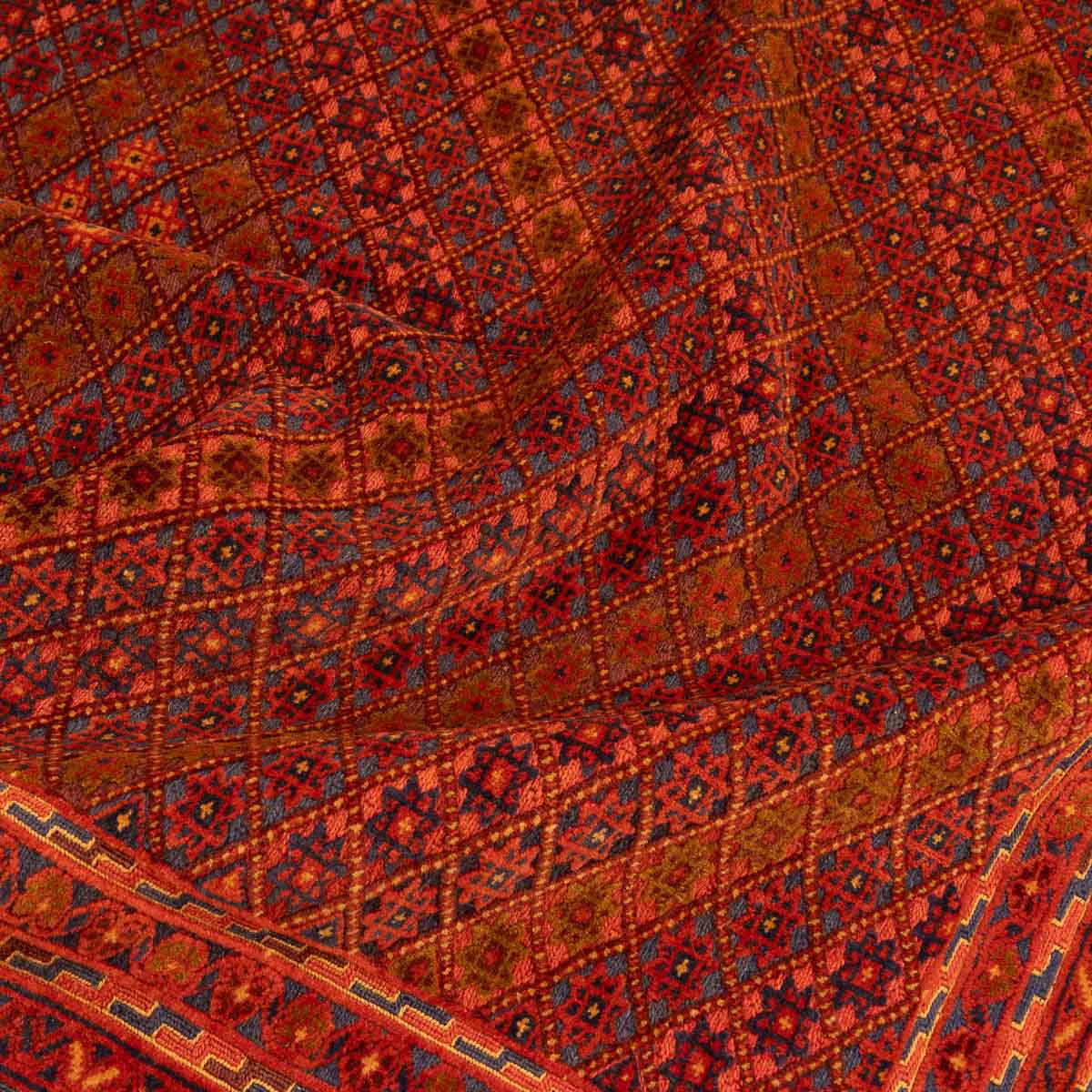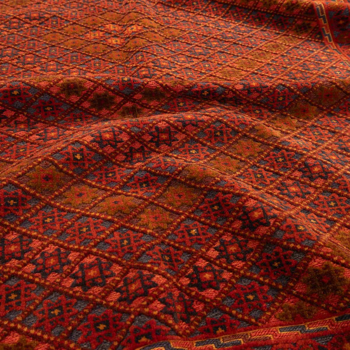 שטיח אוזבקי ייחודי בעבודת יד בגווני אדום עמוק, וכחול – משלב עיצוב גיאומטרי מסורתי עם נוכחות עוצמתית ואלגנטית בחלל. דוגמת היהלומים הקלאסית מעניקה תחושת תנועה ועומק, והופכת אותו לבחירה מושלמת לחללים המעוצבים בקו אתני או אקלקטי.