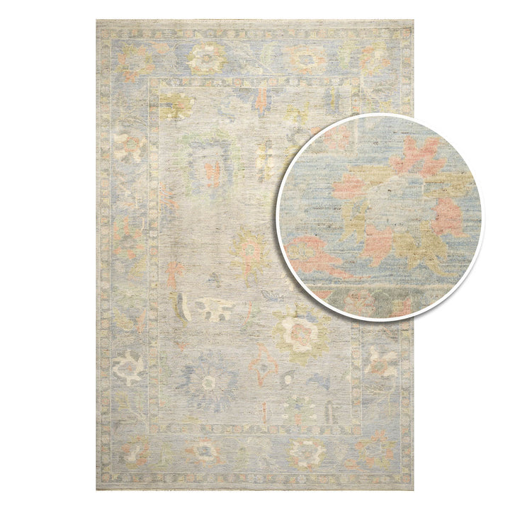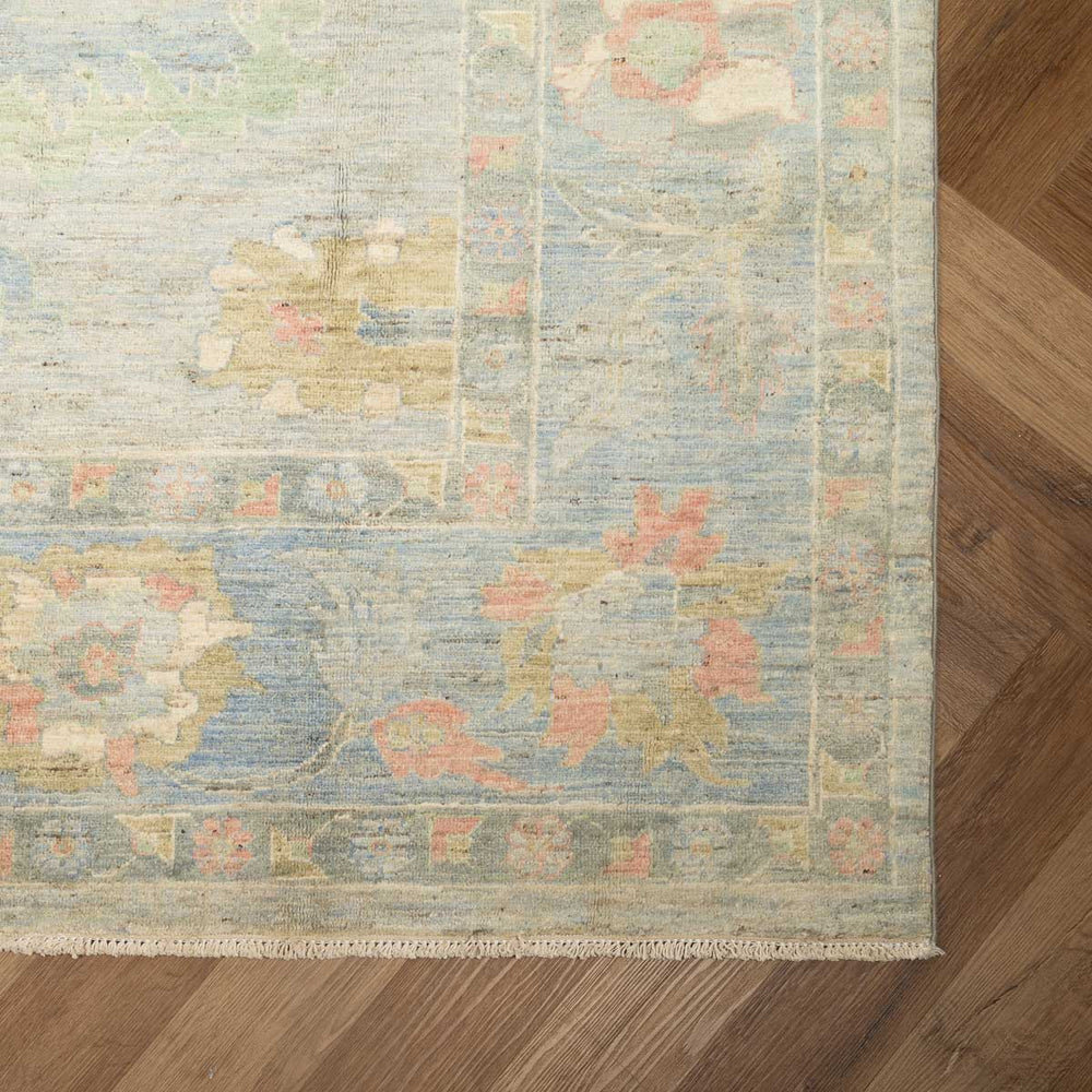 העיצוב מאופיין במוטיבים פרחוניים בסגנון עתיק על רקע תכלת בהיר, היוצרים שטיח שמעניק תחושת רכות, אלגנטיות וטבעיות לכל חלל.