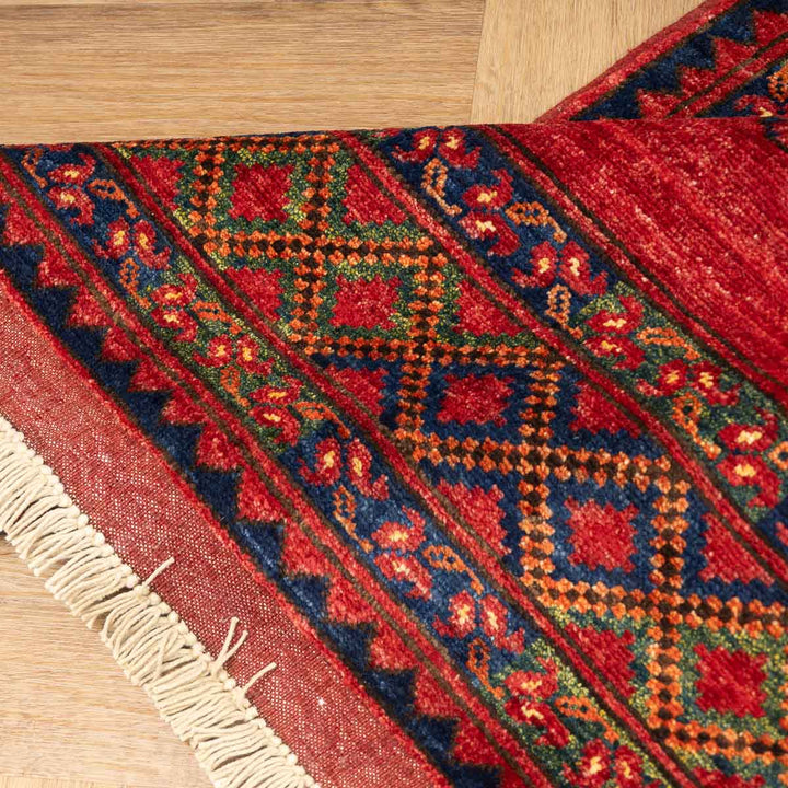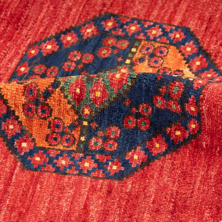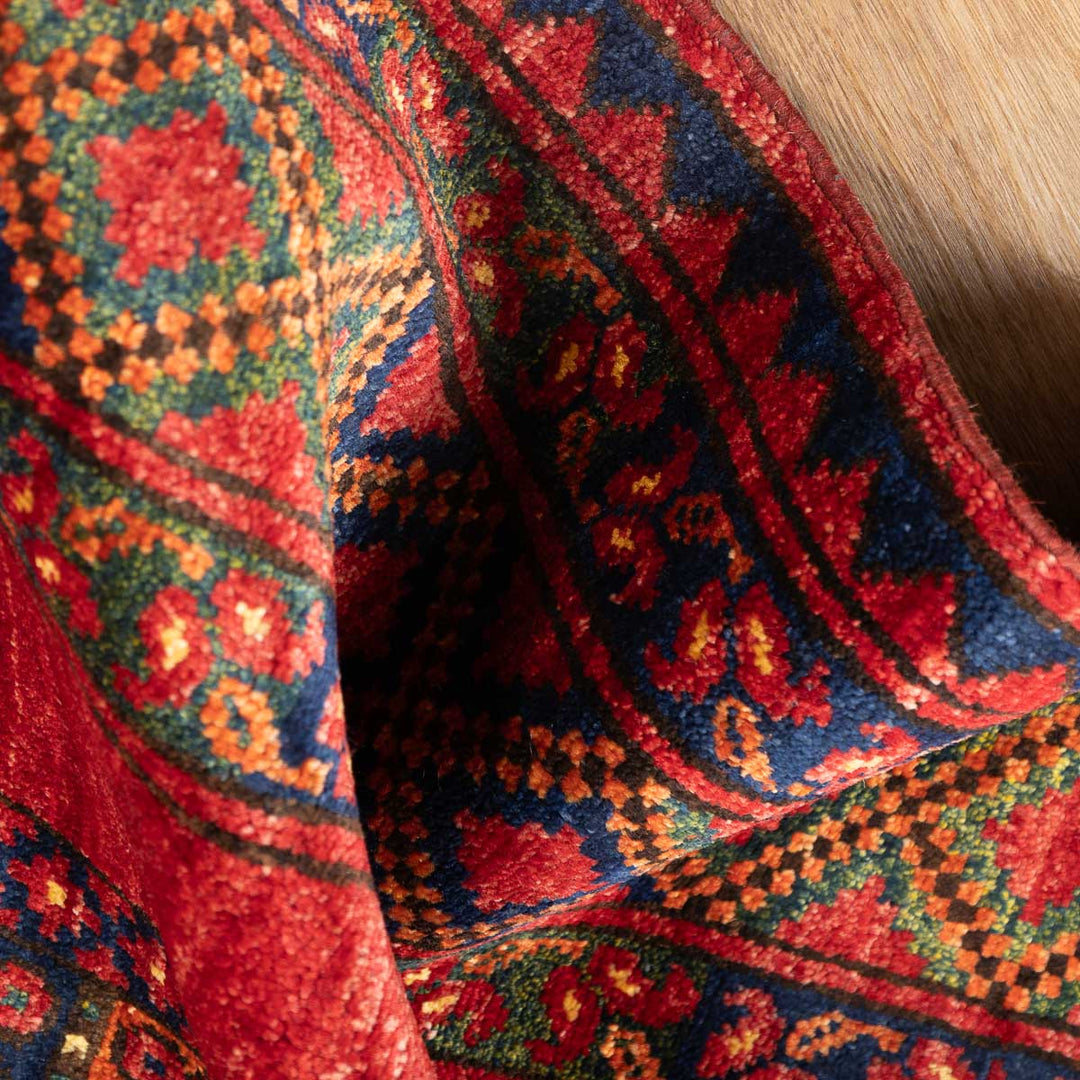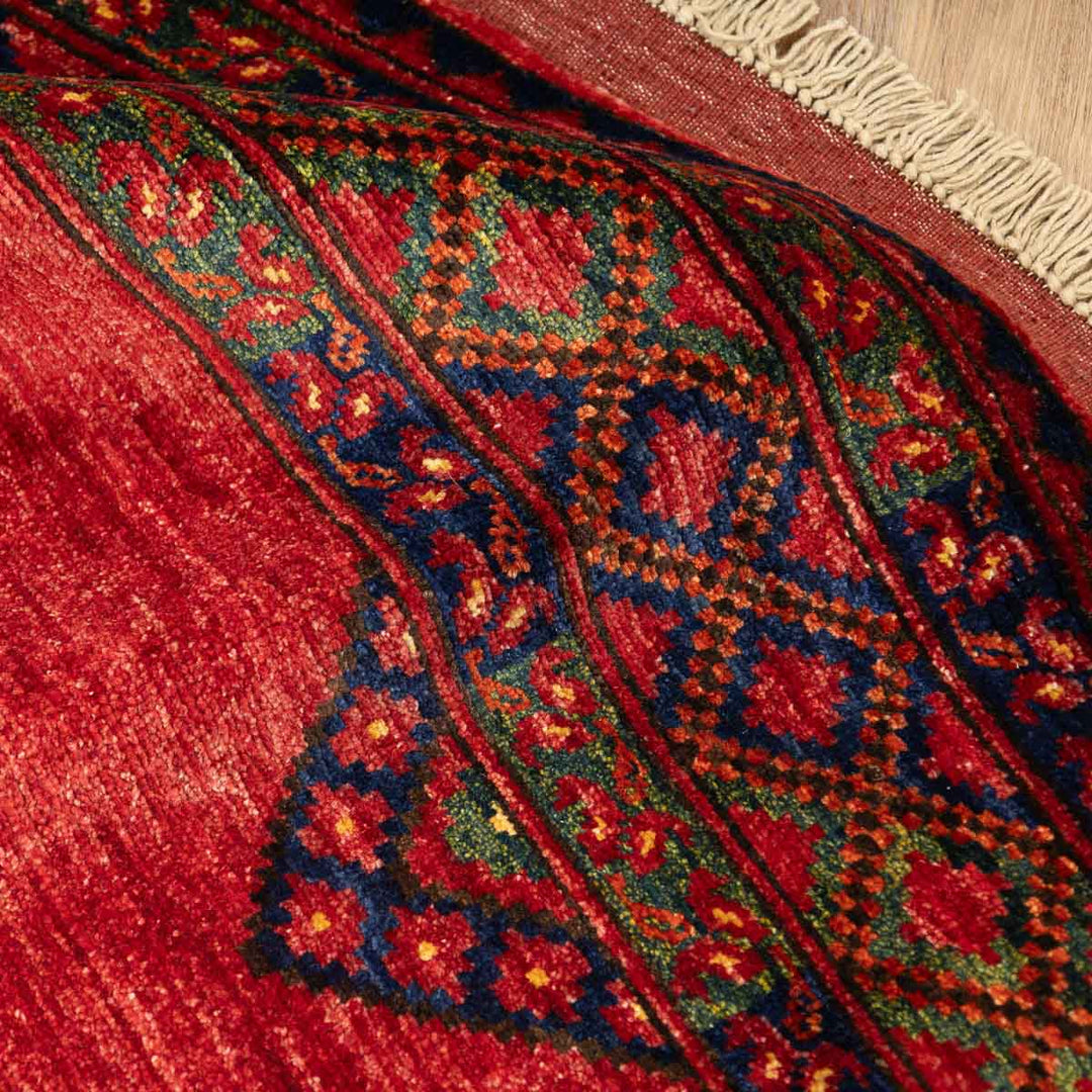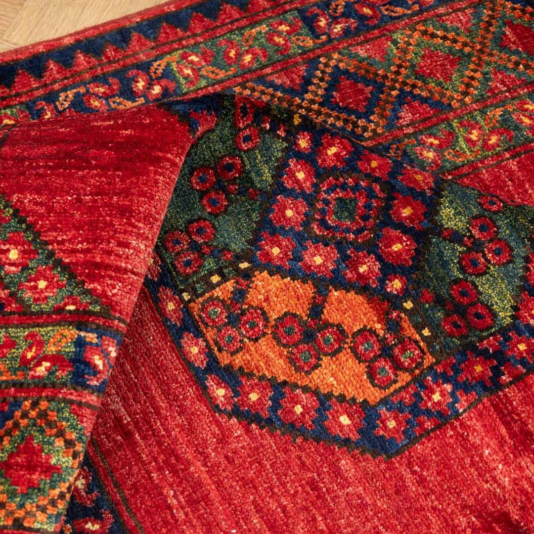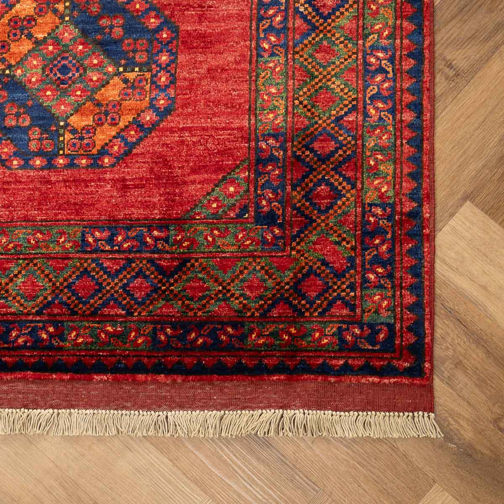 שטיח בעבודת יד המגיע מאפגניסטן, בדגם ארזרי מסורתי, המאופיין בעיצוב גאומטרי מהפנט וצבע אדום עז ודומיננטי. שטיח שמביא איתו חום, עוצמה ונוכחות דרמטית לחלל הבית.