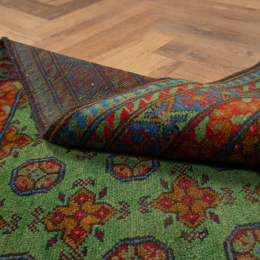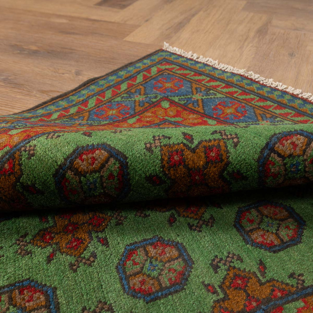 שטיח בוכרה אפגני נדיר בגוון ירוק חי, עם דוגמה גיאומטרית מסורתית ועיטורים צבעוניים בעבודת יד מדויקת. השטיח עשוי מצמר טבעי בשיטה מסורתית, המבטיחה מראה אותנטי, עמידות מרשימה ונוכחות חזקה בחלל.