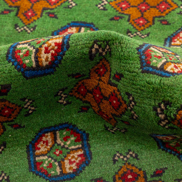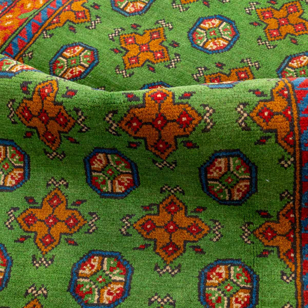 שטיח בוכרי ייחודי בצבע ירוק עז, עשיר בדוגמאות גיאומטריות קלאסיות ובשילוב מסגרת צבעונית שמוסיפה נוכחות יוקרתית ותחושת מסורת לכל חלל.