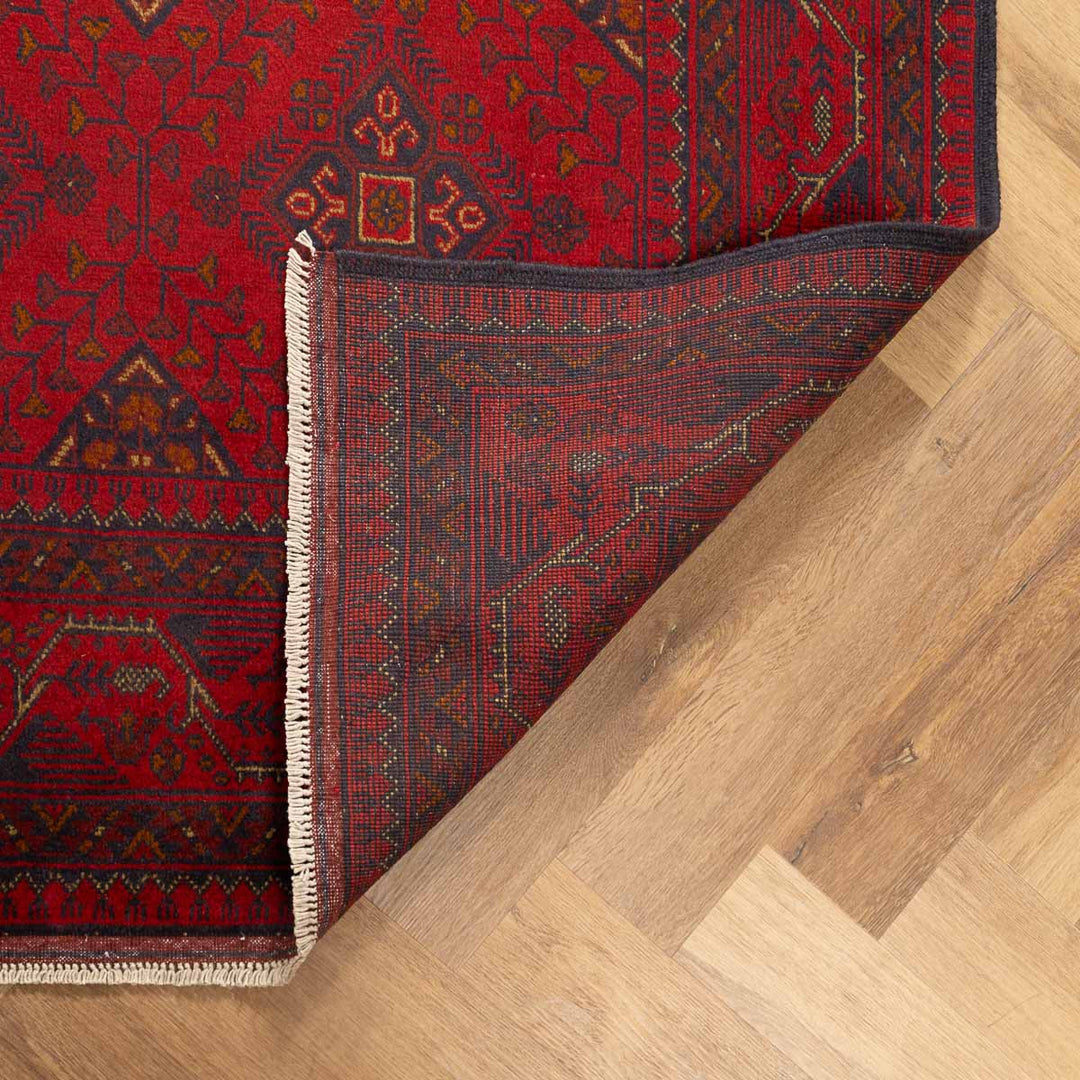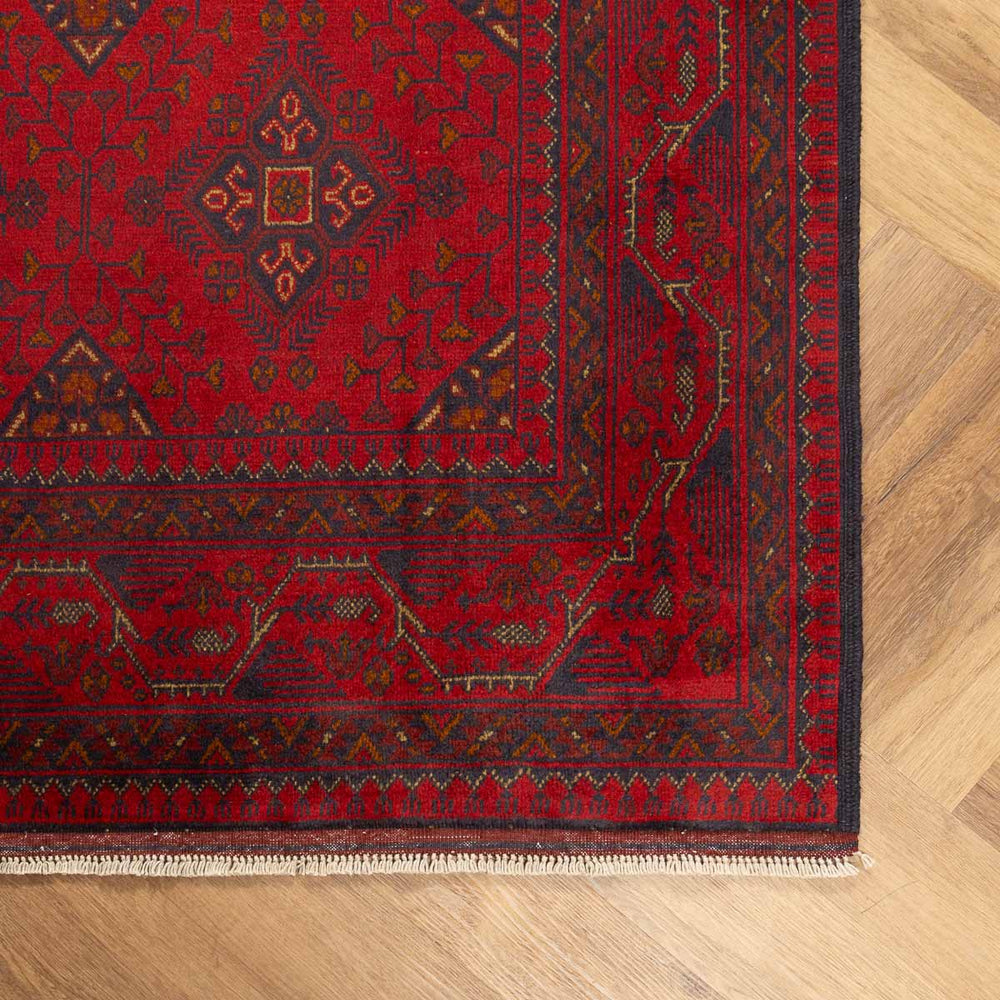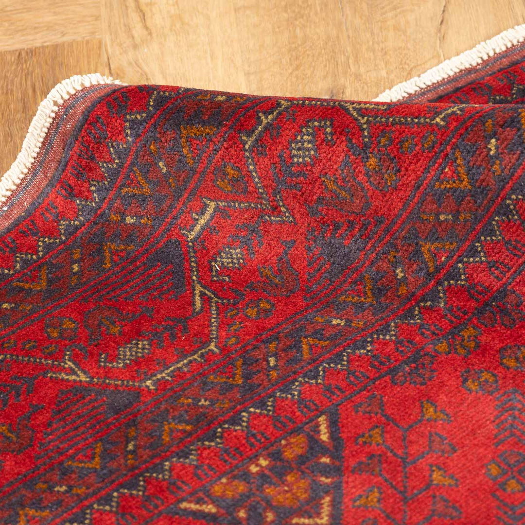 שטיח אפגני בעבודת יד, בגווני אדום עמוק ודוגמה גיאומטרית אותנטית, שמביא איתו את הרוח המסורתית של מחוז קונדוז לארץ. מלא נוכחות, עוצמה ואופי, ומעוטר בדפוס טיפוסי של שבטי הטורקמנים.