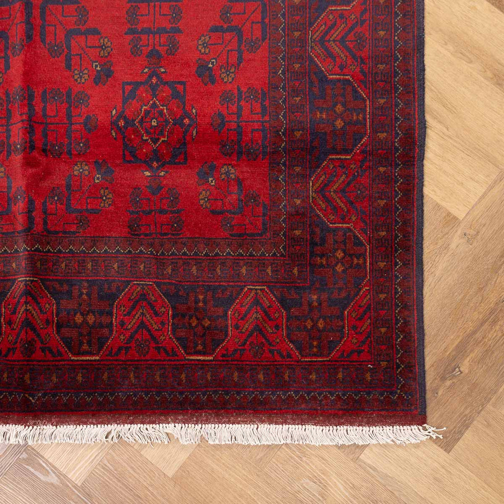 שטיח אפגני בעבודת יד, פריט אותנטי המשקף מסורת עתיקה של שבטי אפגניסטן. האריגה הצפופה והקשרים המדויקים יוצרים דוגמה סימטרית וגיאומטרית, בגוונים עזים של אדום ובורדו עם נגיעות כחול ושחור. זהו שטיח בעל נוכחות עוצמתית שמכניס עומק וחום לכל חלל.