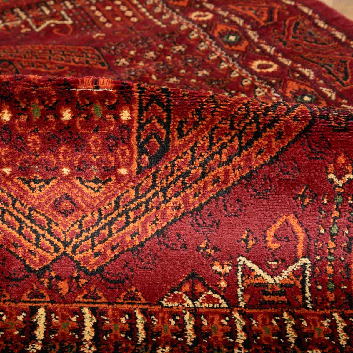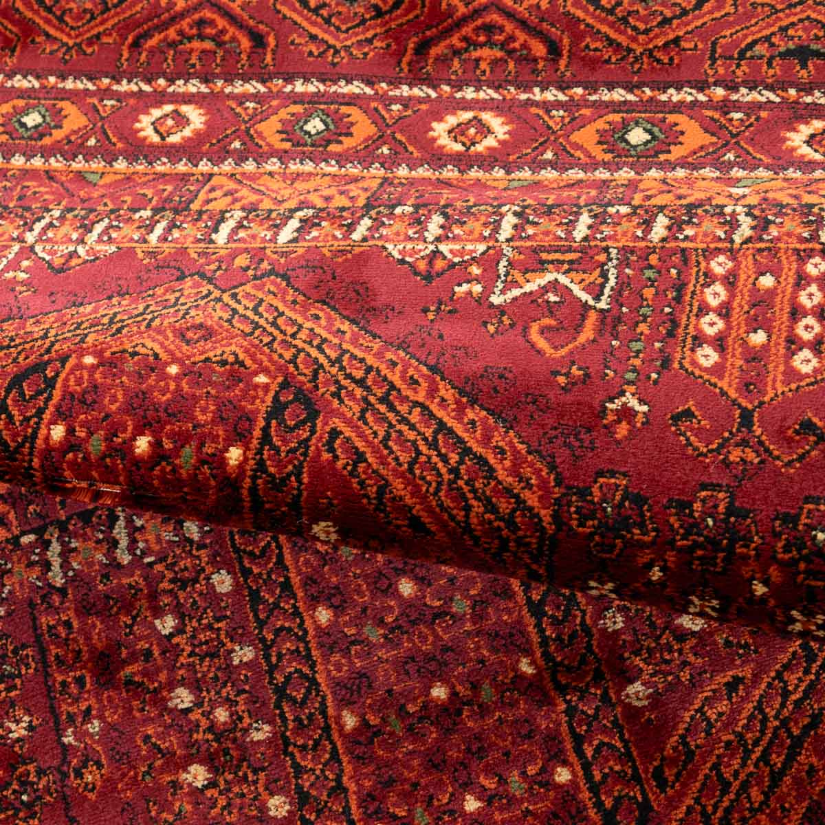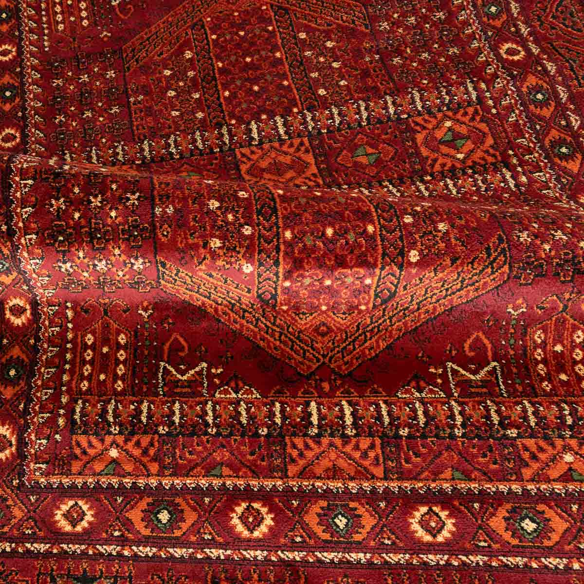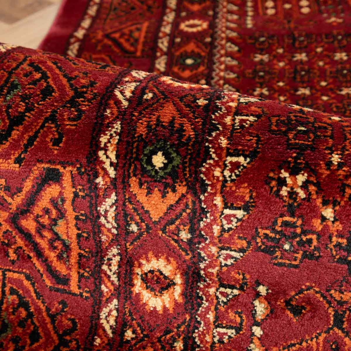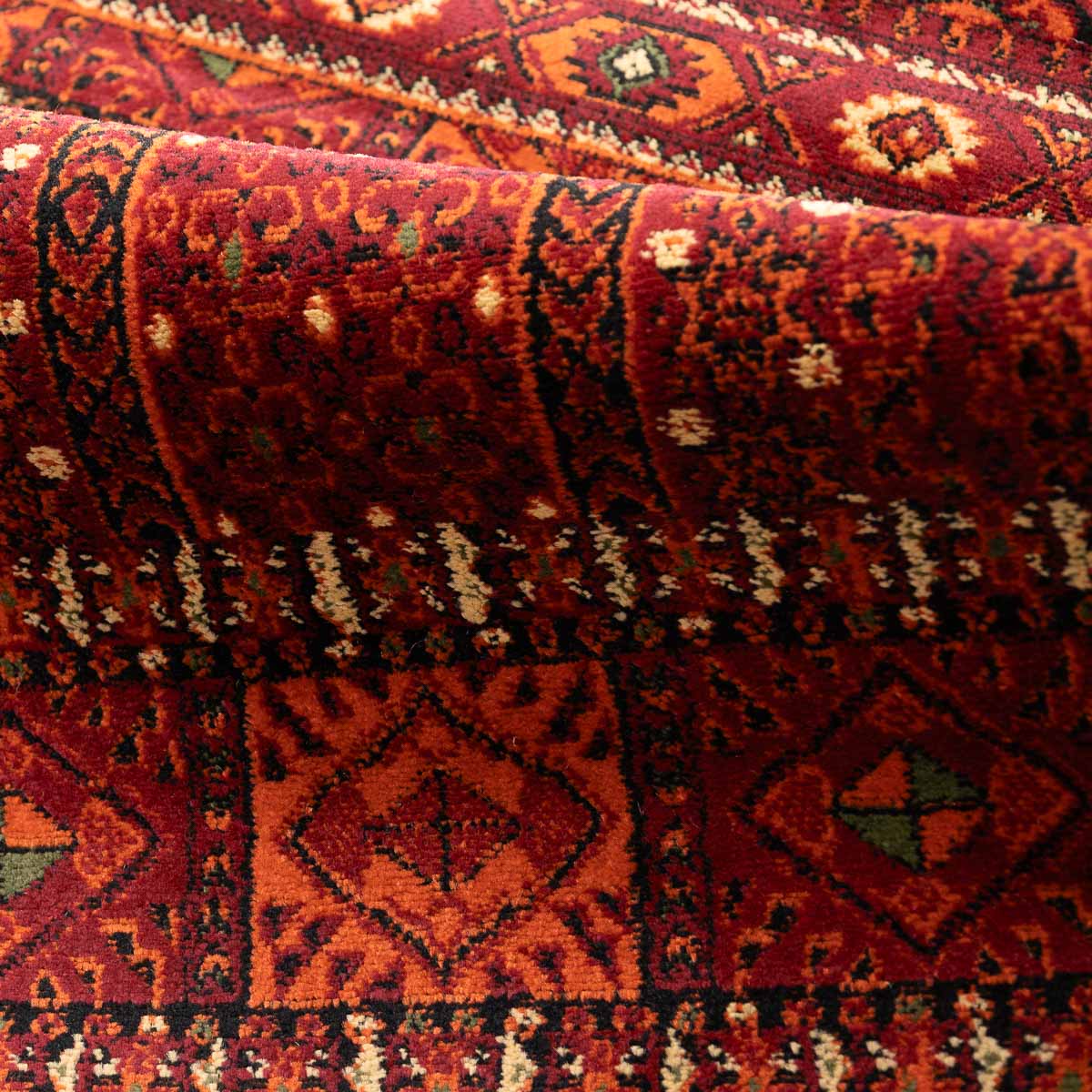 שטיח אפגני בעיצוב מסורתי עם דוגמאות גיאומטריות צפופות ושוליים מעוטרים. שטיח מכונה, בגוון אדום עמוק עם נגיעות שחור וכתום, היוצר מראה חזק, אותנטי ומלא חיים. מתאים לסלון, פינת אוכל או חלל שרוצה אמירה ברורה עם חיבור למסורת.