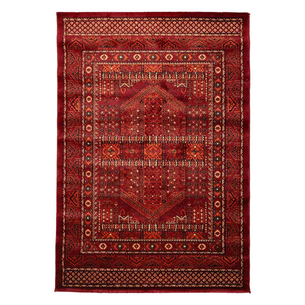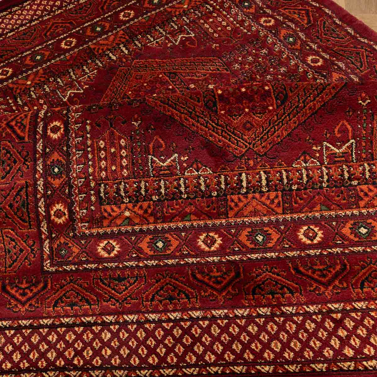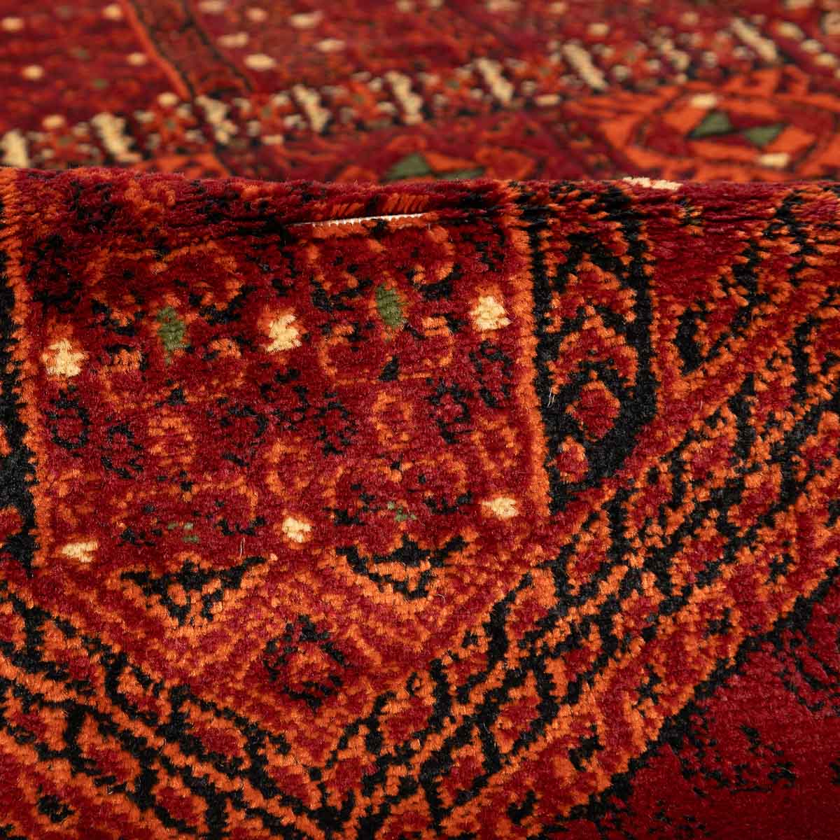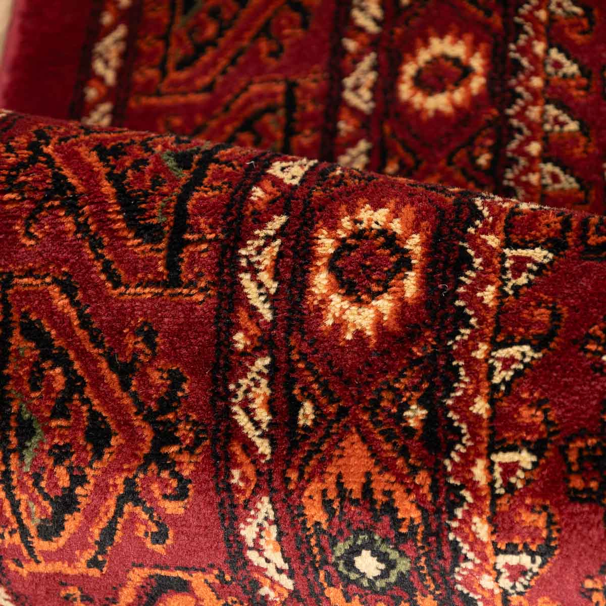 שטיח אפגני בעיצוב מסורתי עם דוגמאות גיאומטריות צפופות ושוליים מעוטרים. שטיח מכונה, בגוון אדום עמוק עם נגיעות שחור וכתום, היוצר מראה חזק, אותנטי ומלא חיים. מתאים לסלון, פינת אוכל או חלל שרוצה אמירה ברורה עם חיבור למסורת.