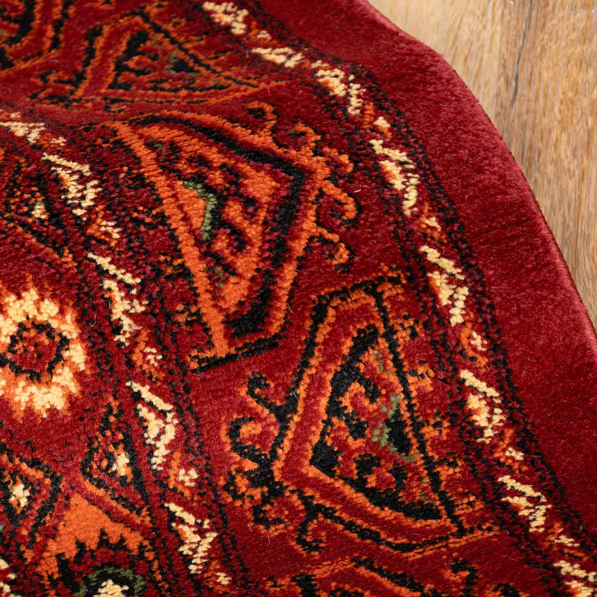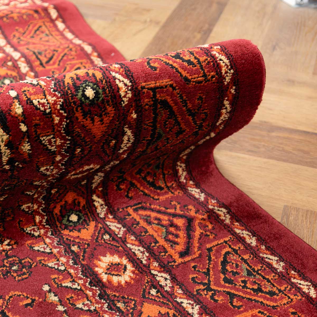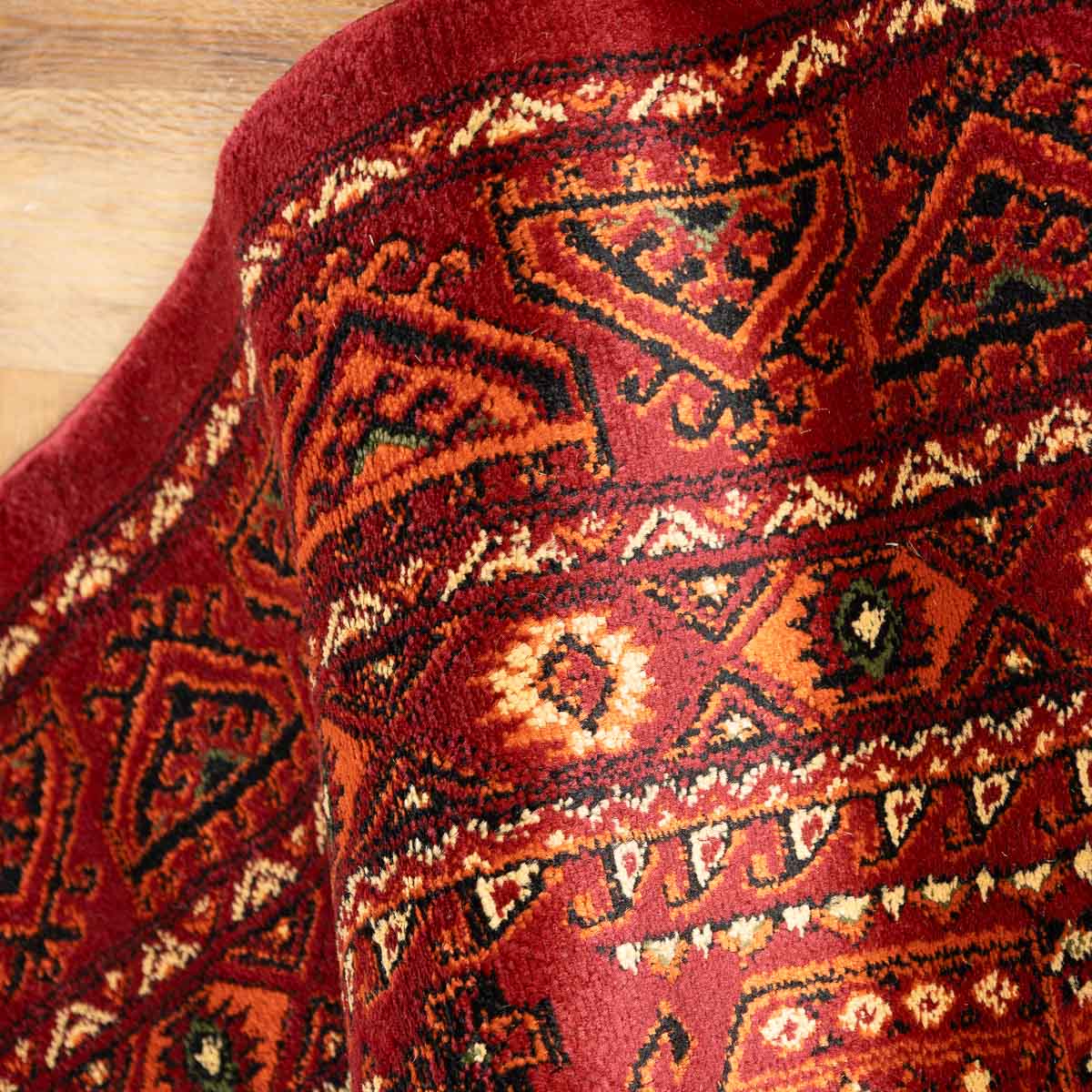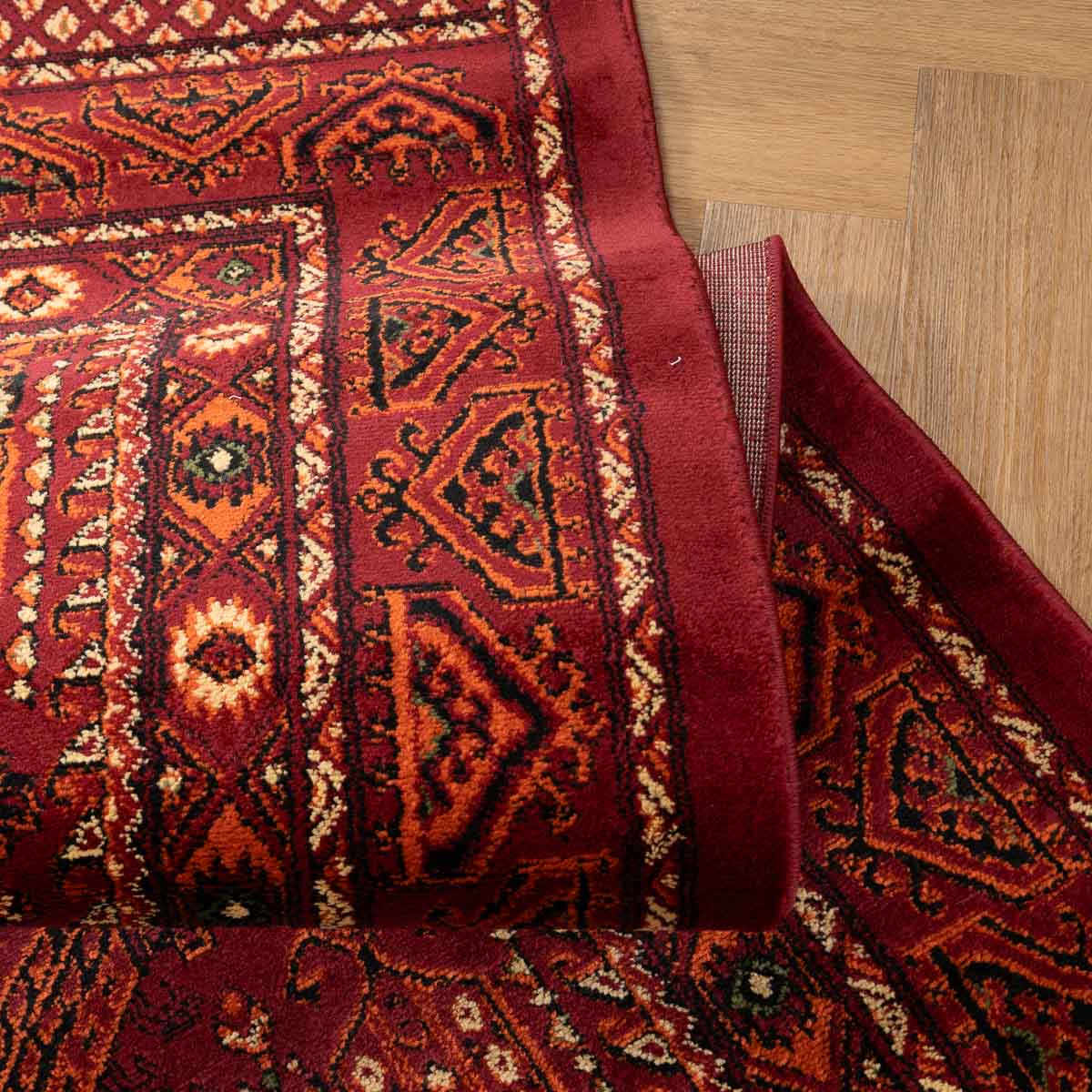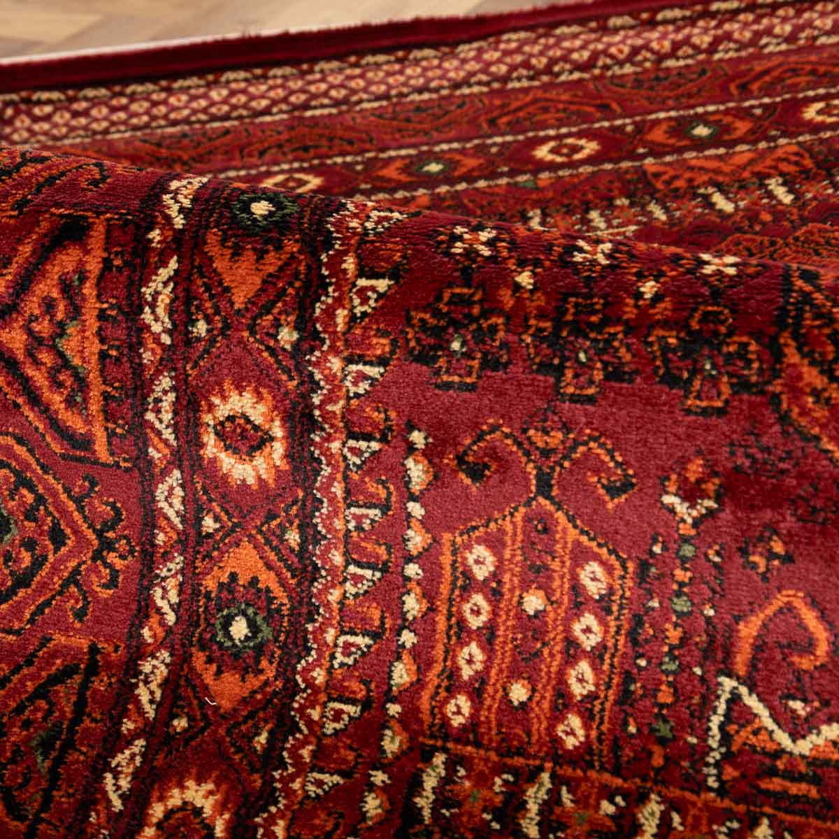 שטיח אפגני בעיצוב מסורתי עם דוגמאות גיאומטריות צפופות ושוליים מעוטרים. שטיח מכונה, בגוון אדום עמוק עם נגיעות שחור וכתום, היוצר מראה חזק, אותנטי ומלא חיים. מתאים לסלון, פינת אוכל או חלל שרוצה אמירה ברורה עם חיבור למסורת.