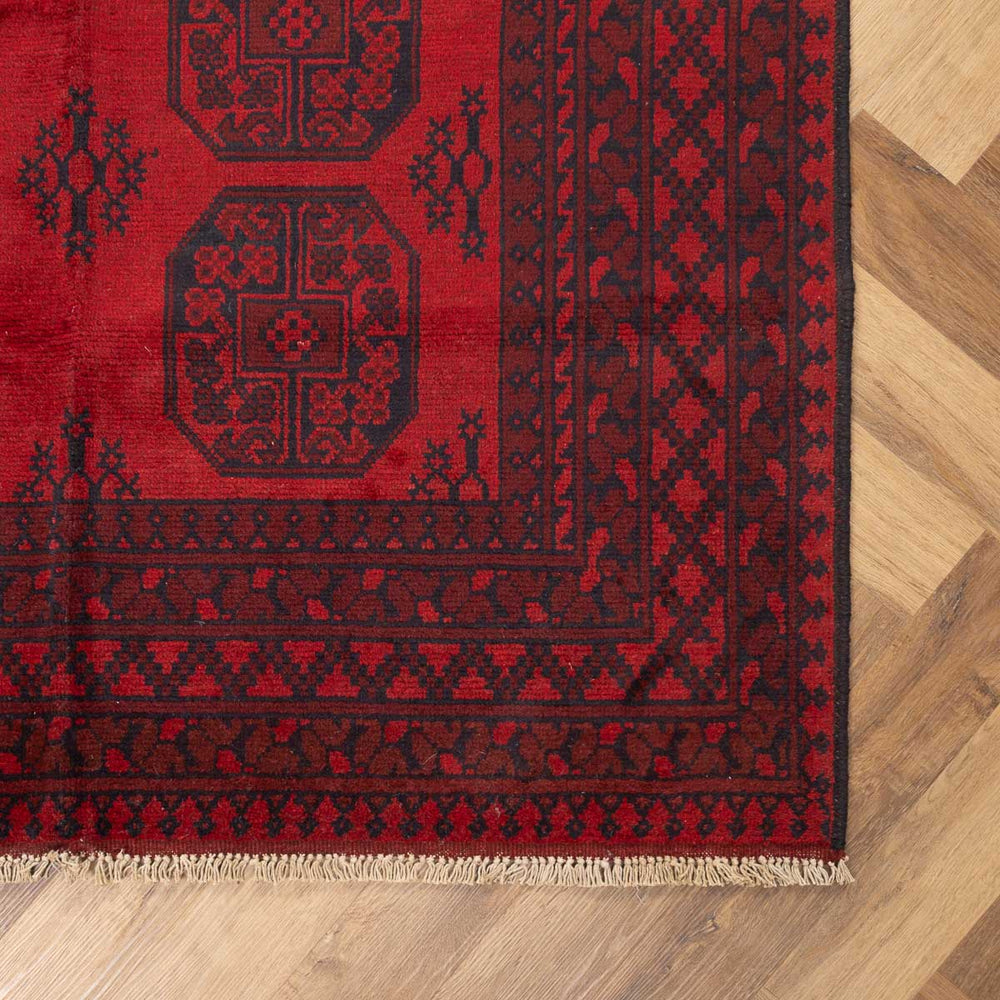 שטיח בעבודת יד בעיצוב אפגני מסורתי מדגם "רגל פיל", בגוונים עמוקים של אדום ויין. דגם זה נחשב לאחד המזוהים ביותר עם אריגת שטיחים אפגנית ומסמל עוצמה ועמידות לאורך שנים.