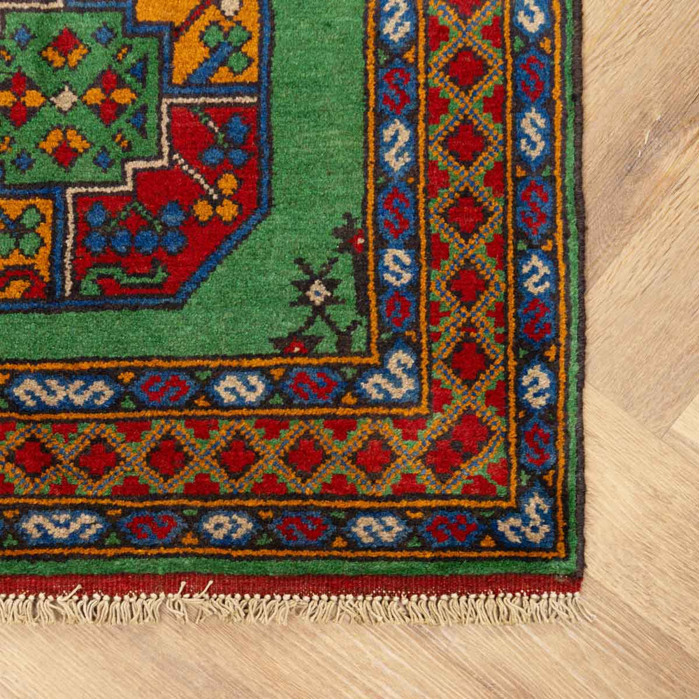 שטיח אפגני ראנר בעבודת יד, עוצמתי ומלא נוכחות, בעיצוב מסורתי של דוגמאות "רגל פיל" שמזוהות עם מלאכת האריגה האפגנית. הצבע הירוק העז בשילוב דגמים גיאומטריים ססגוניים יוצר מראה מיוחד ושובה עין. אידיאלי למעברים, מסדרונות או כאלמנט עיצובי דומיננטי בחלל הבית.