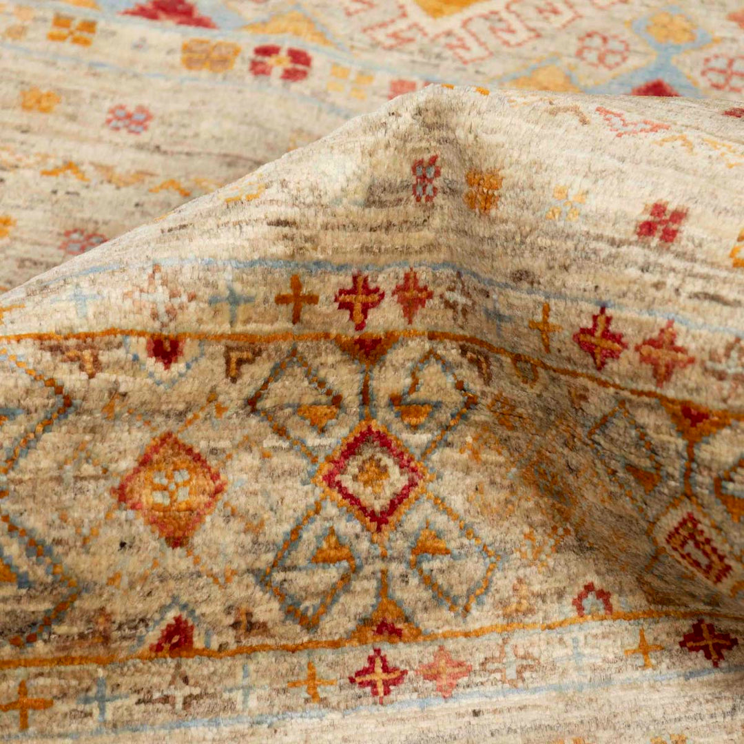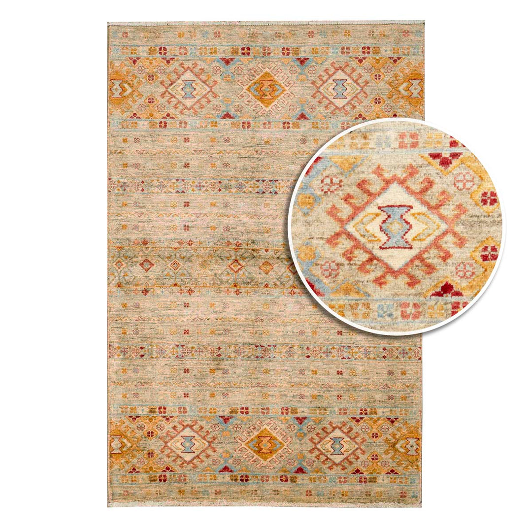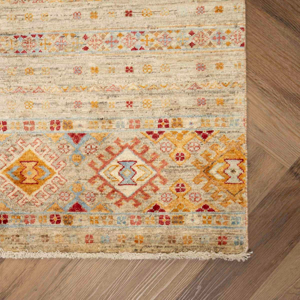 שטיח אריאנה בעבודת יד, עשוי מצמר טבעי איכותי, מביא תחושת חום ואותנטיות לכל חלל. השטיח מתאפיין בדוגמאות גיאומטריות אתניות עם מוטיבים מסורתיים שמשתלבים בהרמוניה עדינה. צבעי בז’, אדום, חרדל, כתום, תכלת, ורוד ונגיעות טורקיז מעניקים לו מראה רך ומעודן ומוסיפים טקסטורה ועניין עיצובי.