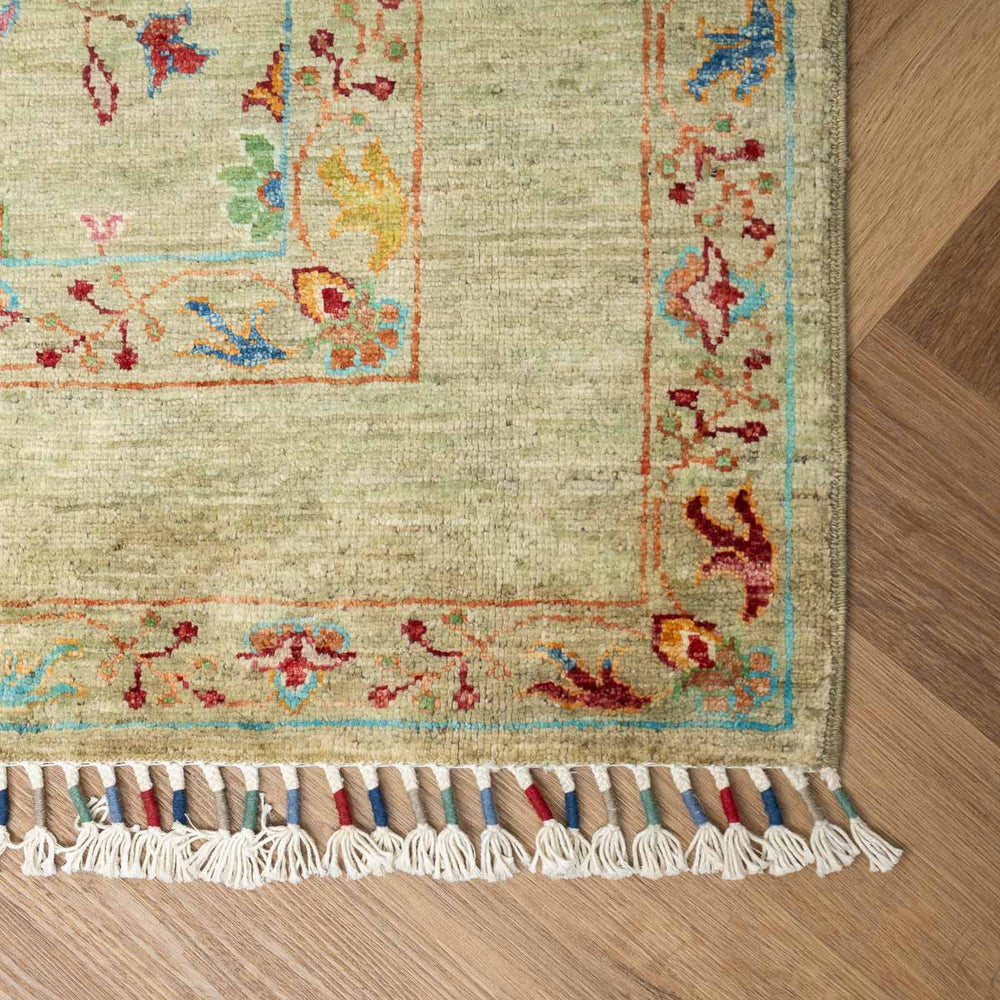 שטיח עבודת יד קלאסי, עשוי מצמר טבעי איכותי בגוונים חמים ובהירים. הרקע ירוק זית בהיר משתלב בהרמוניה עם דוגמאות פרחוניות בגווני בורדו, חרדל, תכלת וטורקיז – לשטיח בעל נוכחות רגועה ומעודנת, עם ניחוח מזרחי על-זמני.