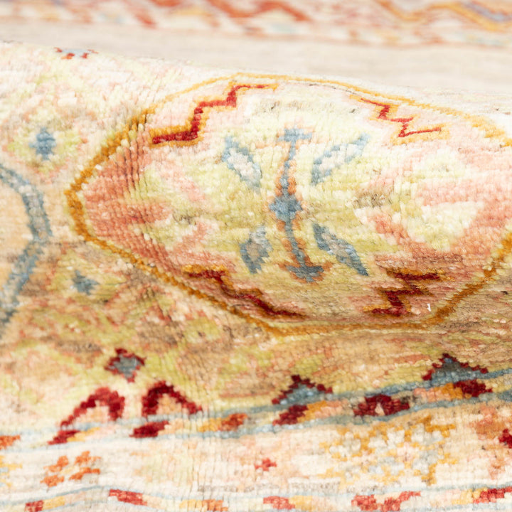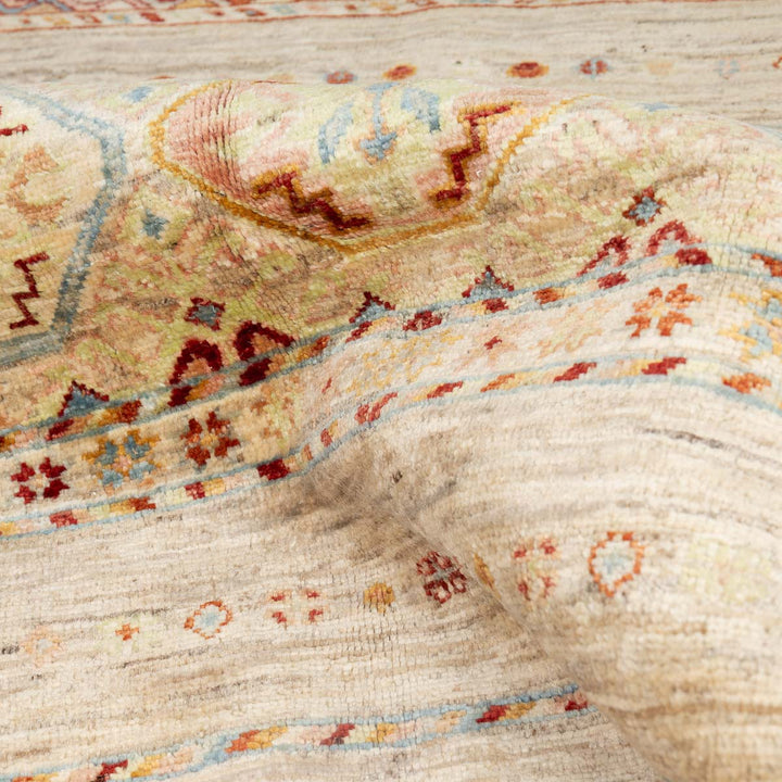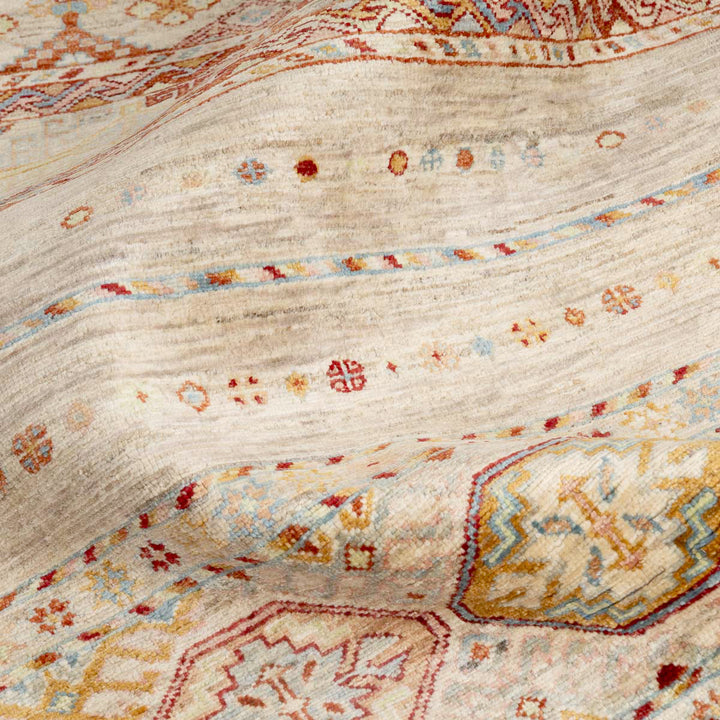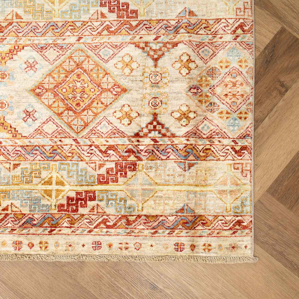 שטיח עבודת יד מסדרת אריאנה, באריגה קפדנית מצמר טבעי, עם דוגמה שבטית עשירה ורקע בגוון שמנת בהיר. השטיח משלב פסים אתניים בגוני בורדו, חרדל, חמרה, תכלת וזהב – ליצירת מראה נועז אך מאוזן, אידיאלי לחללים המעוניינים בטאץ' שבטי עם טוויסט עכשווי.