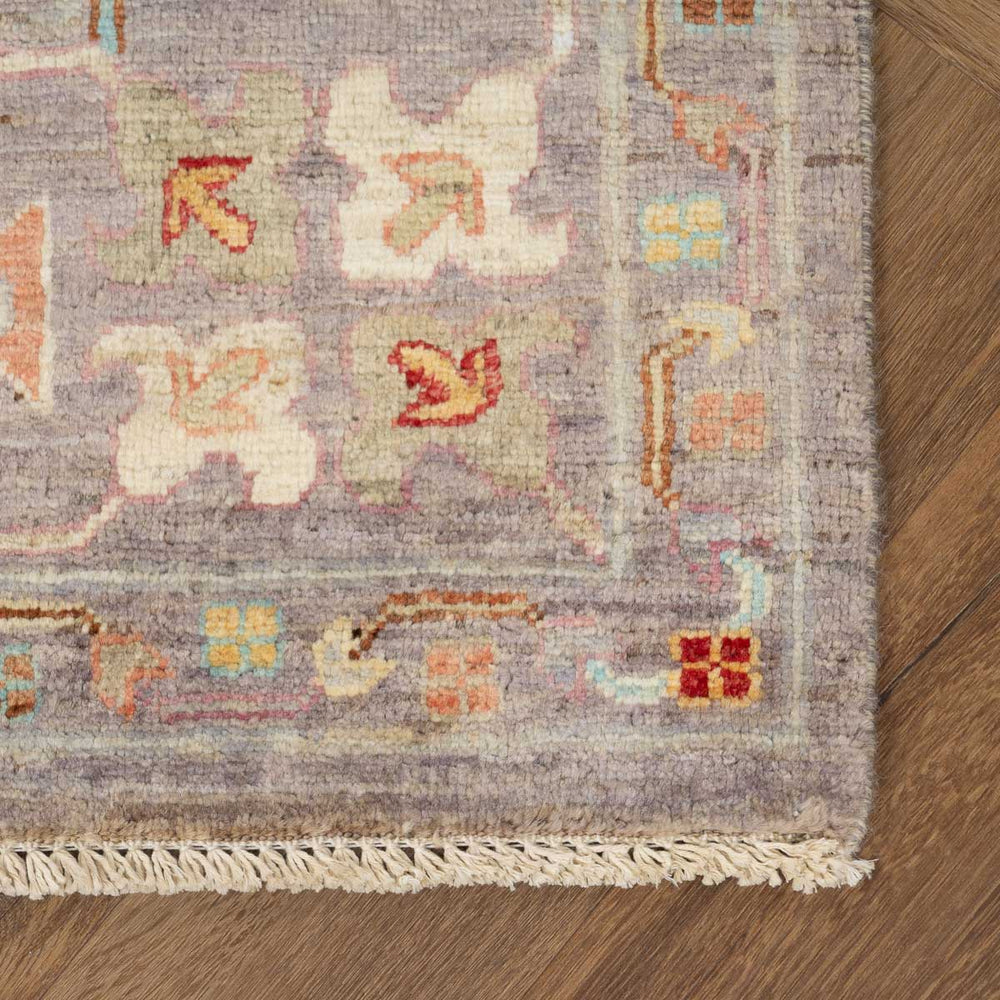 שטיח קלאסי בעבודת יד מסדרת אריאנה, בעיצוב עדין עם גוון לבנדר מעושן ועיטורים מרהיבים בגווני שמנת, טורקיז, חום זהוב ואדום יין – שילוב הרמוני בין יוקרה לרוך.