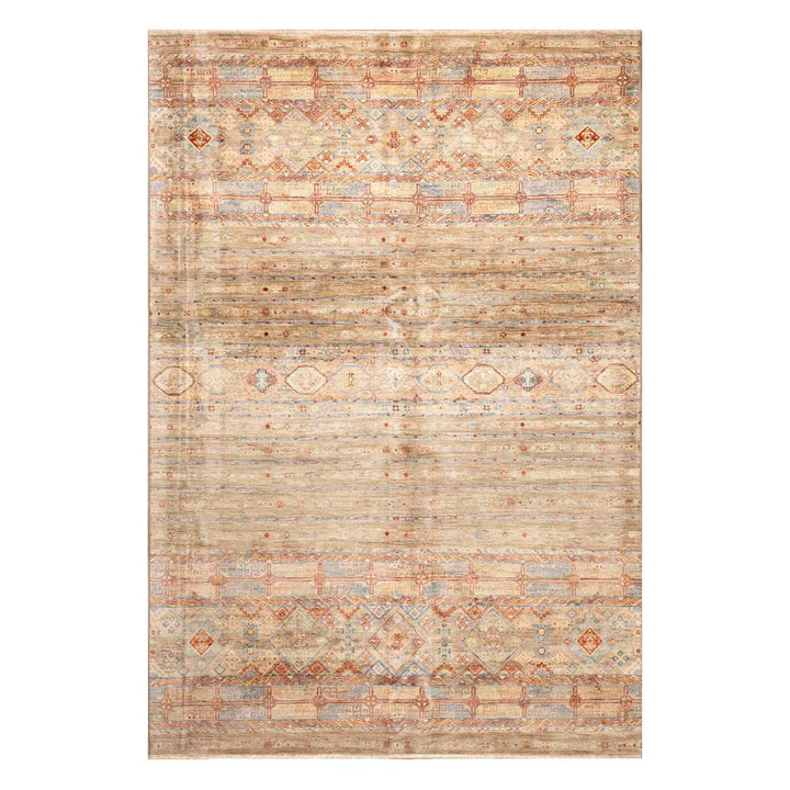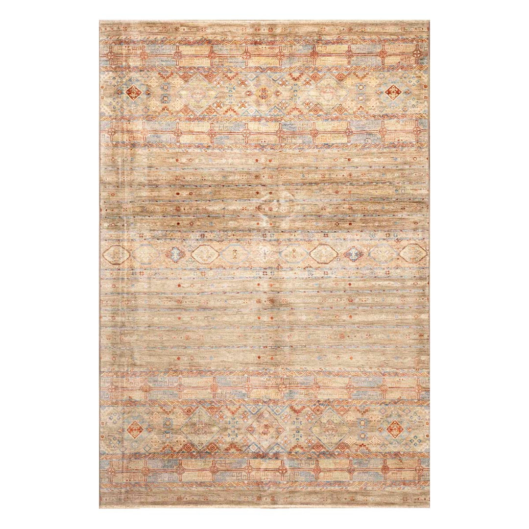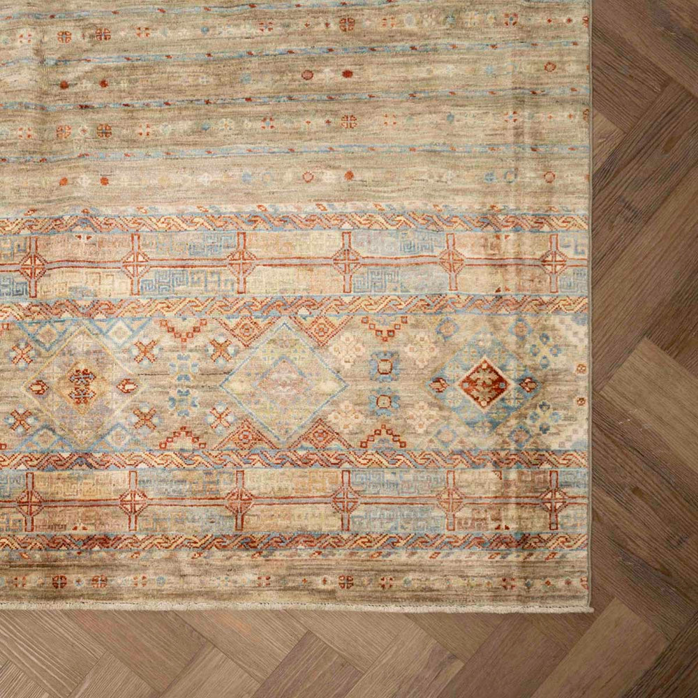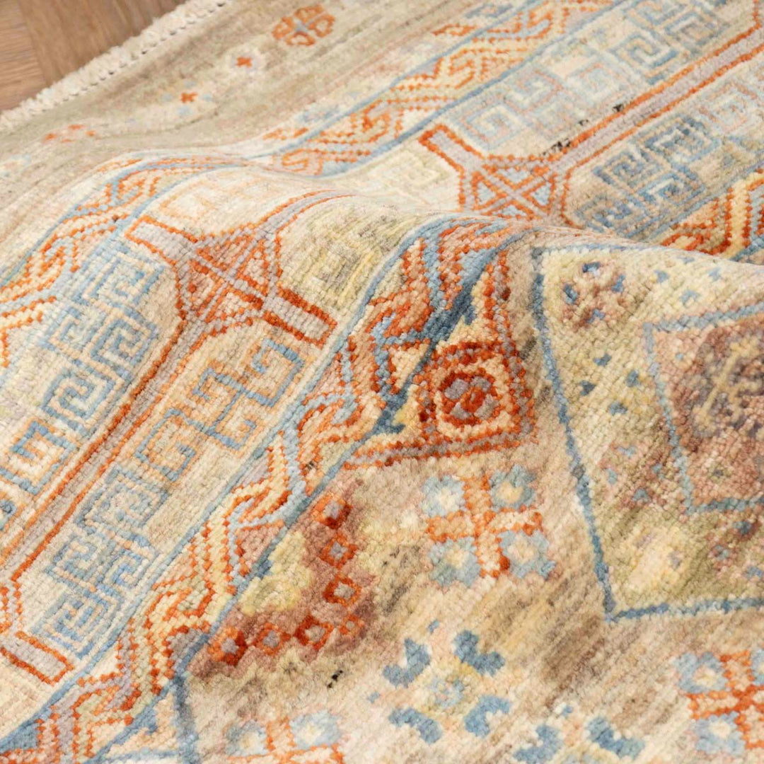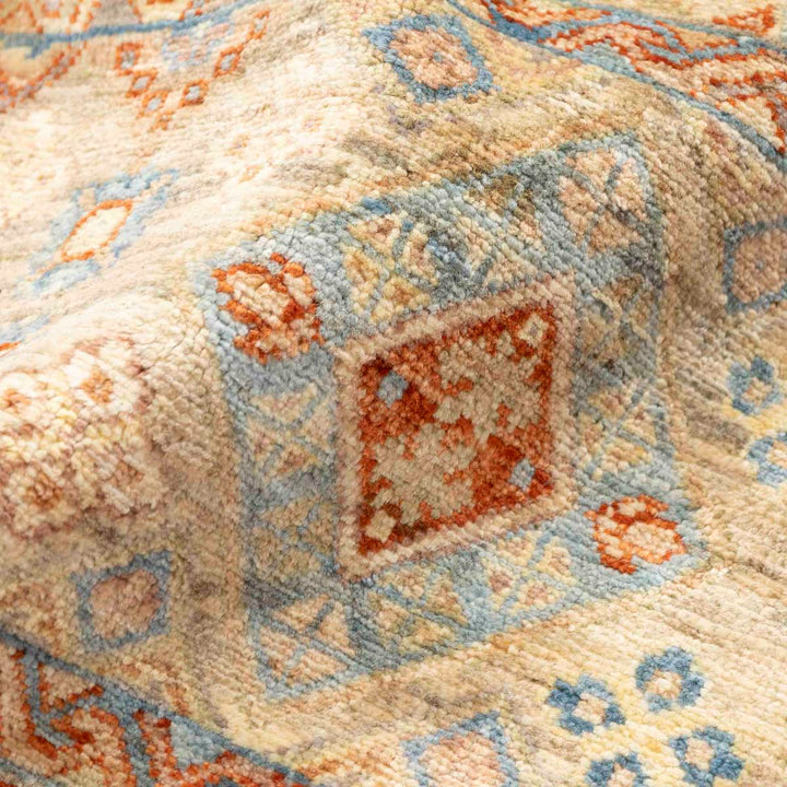 שטיח אריאנה בעבודת יד, בסגנון מודרני-מסורתי שמביא איתו תחושת רוך, חמימות ואלגנטיות. עיצוב עדין בגווני בז’, תכלת, כתום ואפור יוצר מראה רגוע אך עשיר בפרטים, עם דוגמאות שבטיות עדינות שמוסיפות עניין וטקסטורה מבלי להשתלט על החלל. מושלם למי שמחפש שטיח שישדר יוקרה אבל ישתלב בהרמוניה עם הבית.